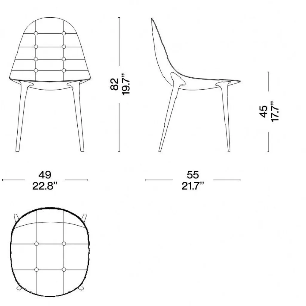 Die vier dünnen Beine des 245 Caprice Stuhls werden aus rostfreiem Stahl hergestellt. Die spitzen sich nach unten hin etwas zu. Fußkappen aus schwarzem Kunststoff, die an der Unterseite montiert sind, schonen empfindliche Böden. Der Kern der Sitzschale ist aus Nylon hergestellt. Darauf ist Polyurethanschaum befestigt, der mit leichtem Samt überzogen ist. Eine zusätzliche Schicht aus stoßfestem Styropor macht den 245 Caprice Stuhl robust. Durch den ausgeklügelten Aufbau punktet das Modell mit einem hervorragenden Sitzkomfort. Für den Bezug verwendet Starck Leder. Es ist genoppt und daher mit einem geometrischen Muster versehen. In der harmonisch gerundeten Sitzschale nimmt man gerne auch länger Platz.