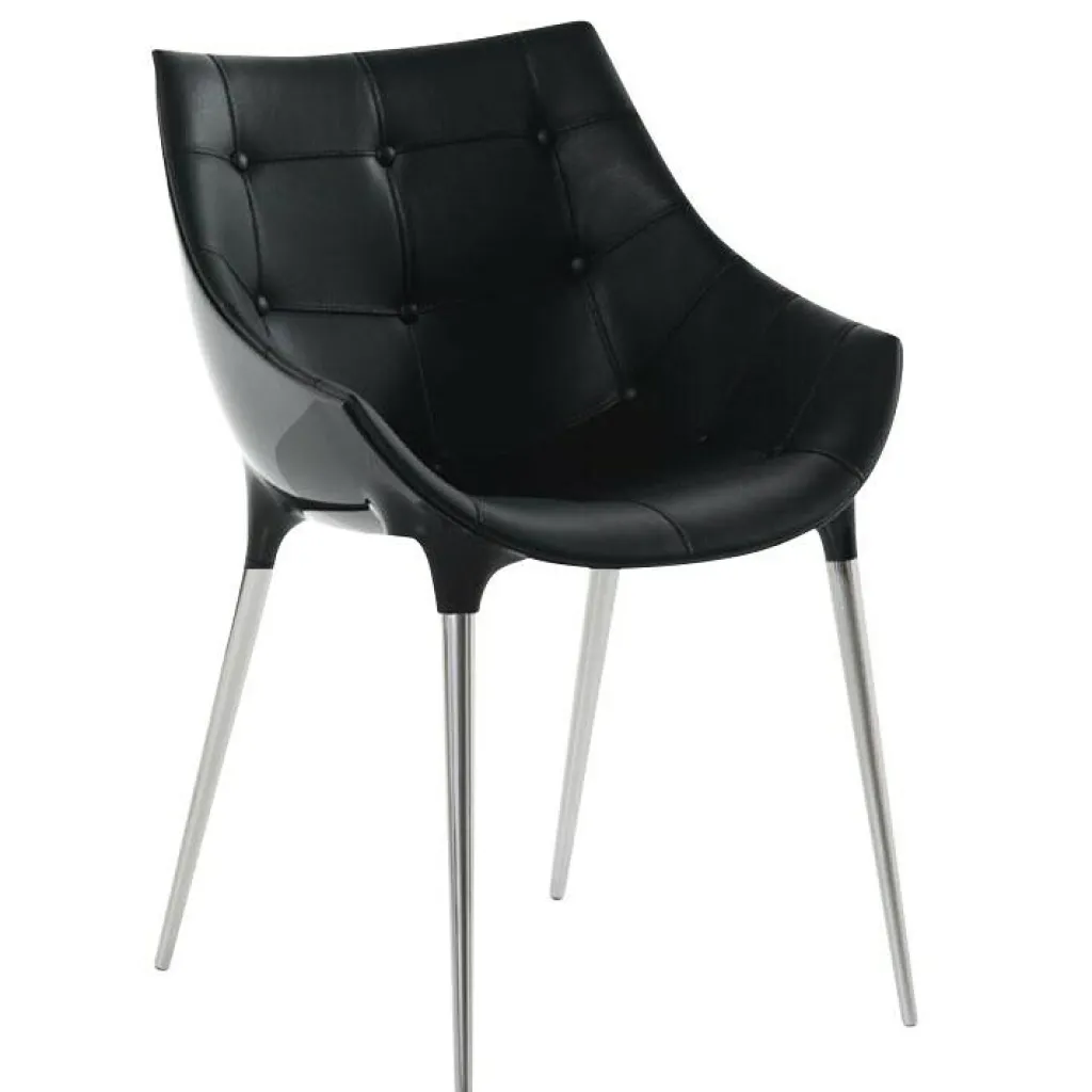 Egal ob im Wohn- oder Esszimmer, im Konferenzraum oder in einem modernen Restaurant, der Passion Armlehnstuhl ist eine bequeme und stilvolle Sitzgelegenheit. Die vier leicht ausgestellten Beine verjüngen sich in Richtung Boden. Sie bestehen aus verchromtem Stahl. An der Unterseite sind zur Schonung heikler Böden Gleiter aus Kunststoff befestigt. Auf dem schlichten Gestell sitzt eine Schale aus Nylon, die mit einer Polsterung mit Capitonné-Verarbeitung bezogen ist. Die spezielle Zusammensetzung des außergewöhnlichen Materials ist durch ein Patent geschützt. Über dem Kern ist ein Bezug aus Leder gespannt, das hervorragende Haptik auszeichnet und aufgesteppt scheint. Die geschwungene Sitzschale samt Armlehnen unterstützt den Körper perfekt. Die Oberkante des Passion Armlehnstuhls ist eckig geformt. Markant ist auch die an beiden Seiten nach oben gezogene Sitzfläche.