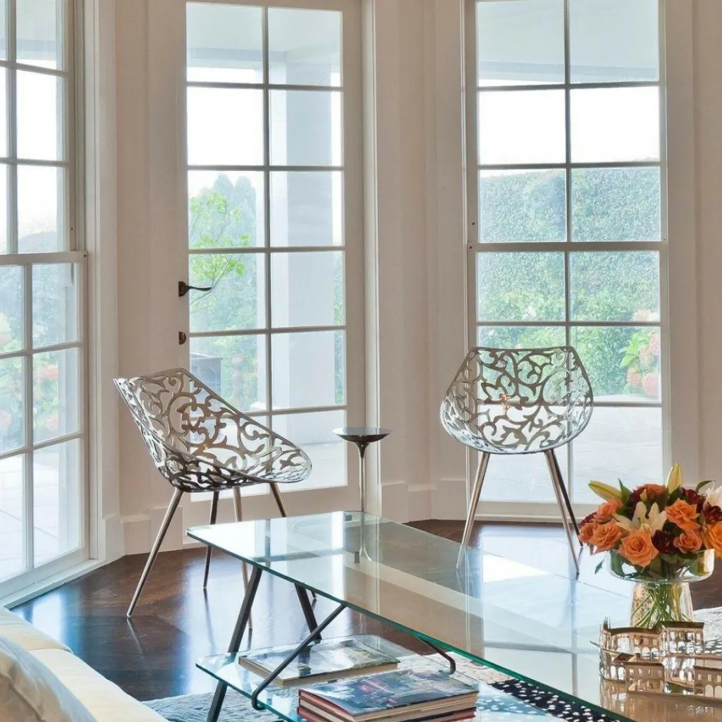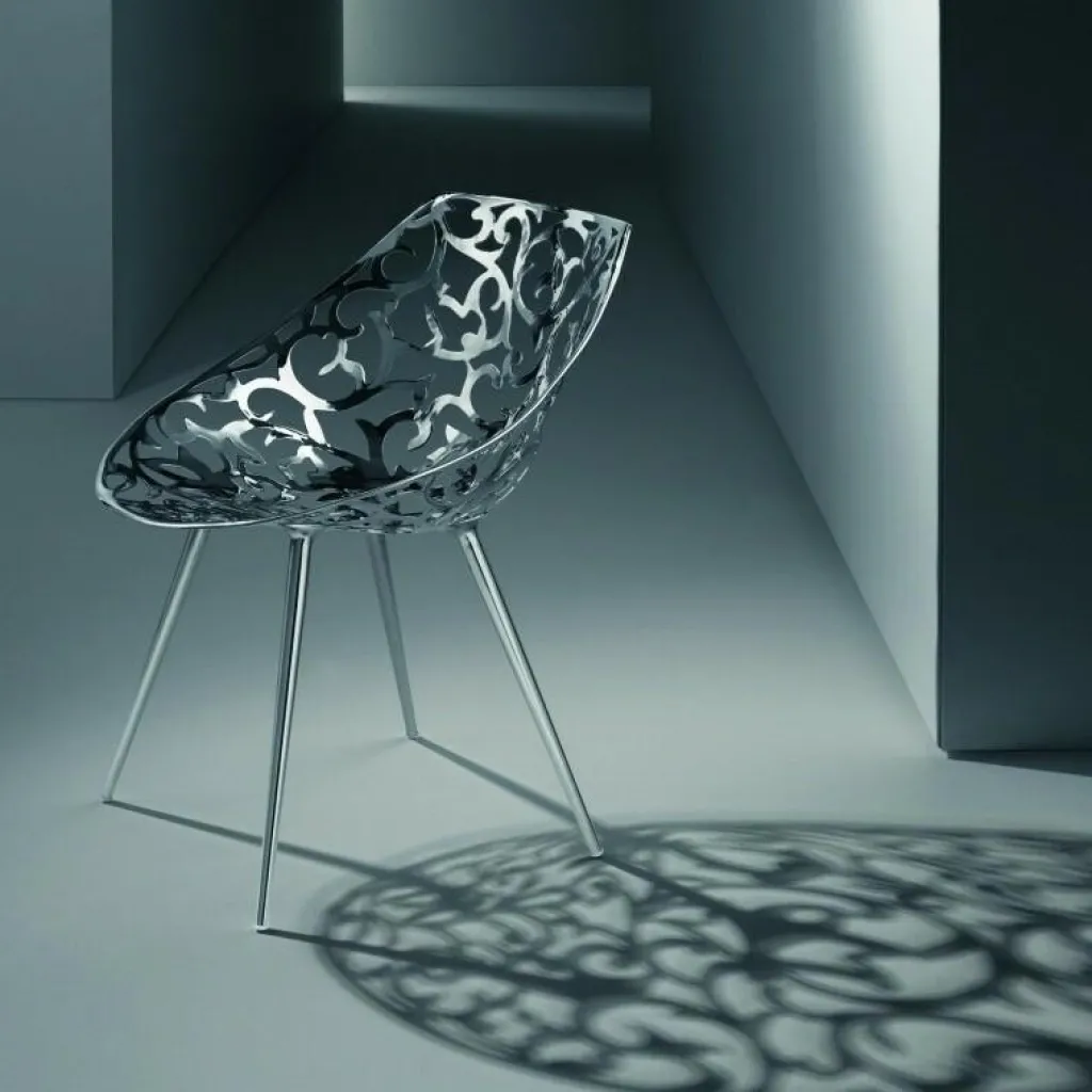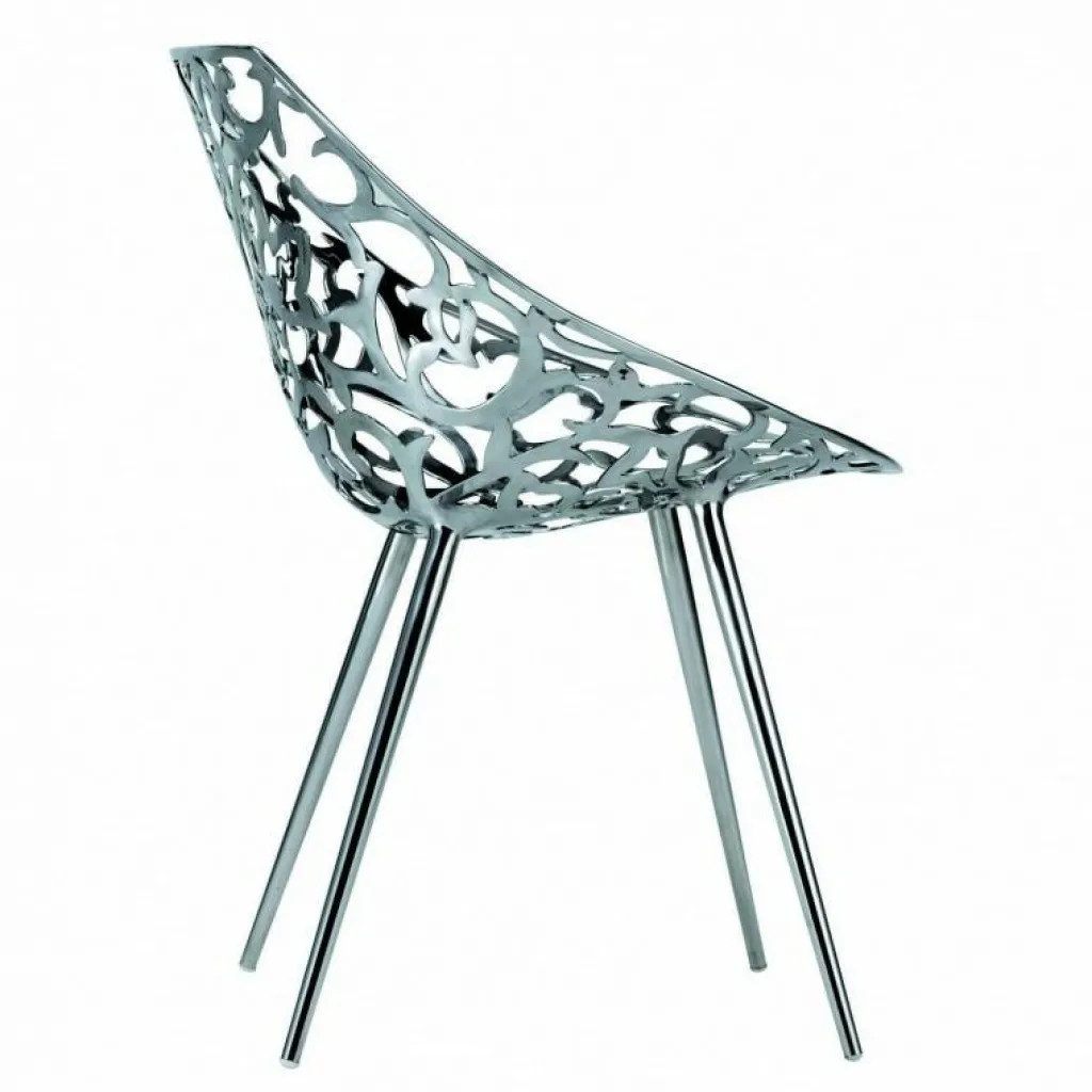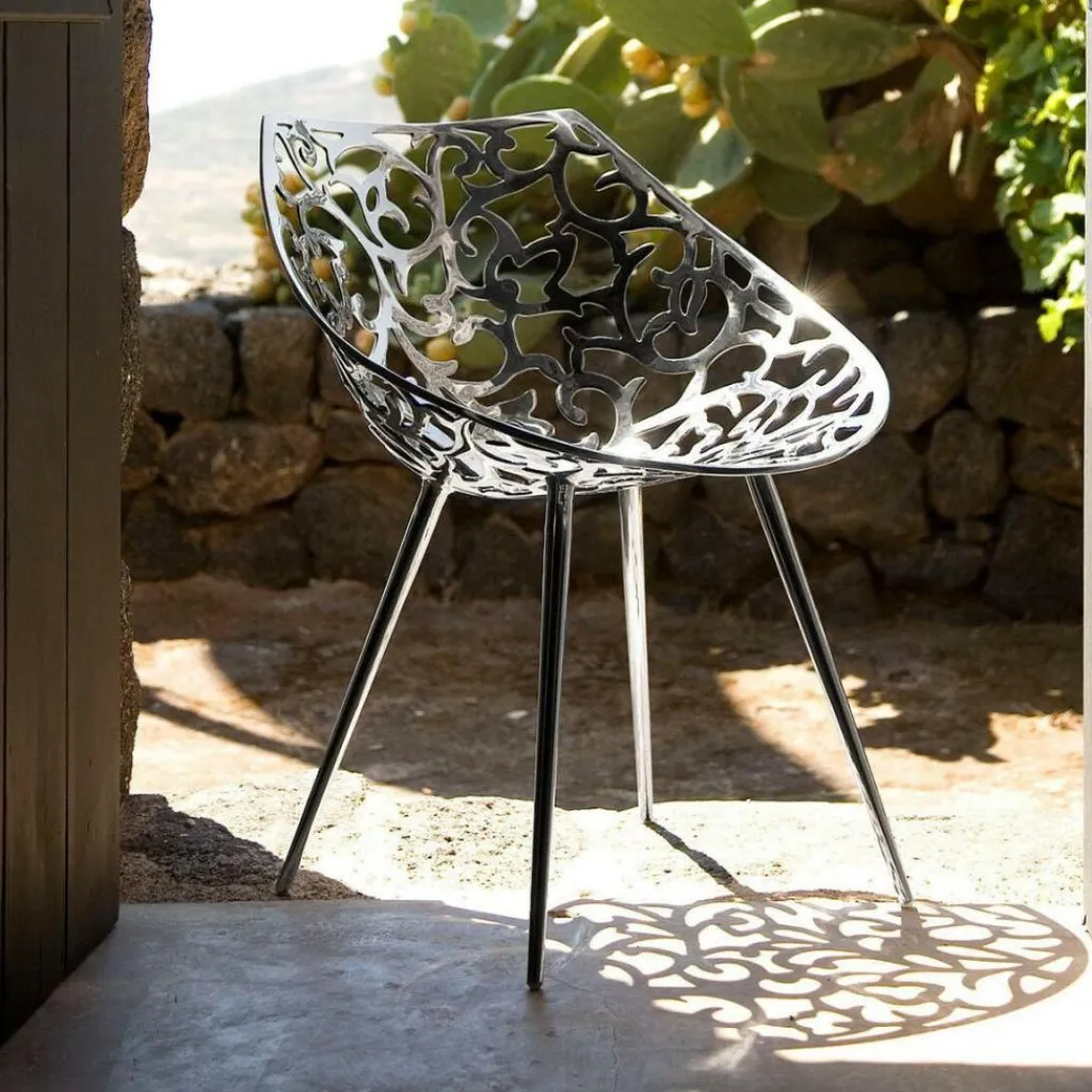 Zu den Extras des Miss Lacy Stuhls gehören seine eindrucksvoll gewundenen Verzierungen und akzentuierte Extras wie die Materialauswahl. Der 58 x 58 x 77 cm große Stuhl besteht nämlich aus hochwertigem Edelstahl. Damit zeichnet sich dieses Highlight von Philippe Starck nicht nur durch seine Stabilität, sondern auch durch seinen eleganten Glanz aus, der sich stilvoll mit dem floralen Muster verbindet. Zudem sitzt man hier dank den runden Formen und der angenehmen Sitzhöhe besonders bequem.