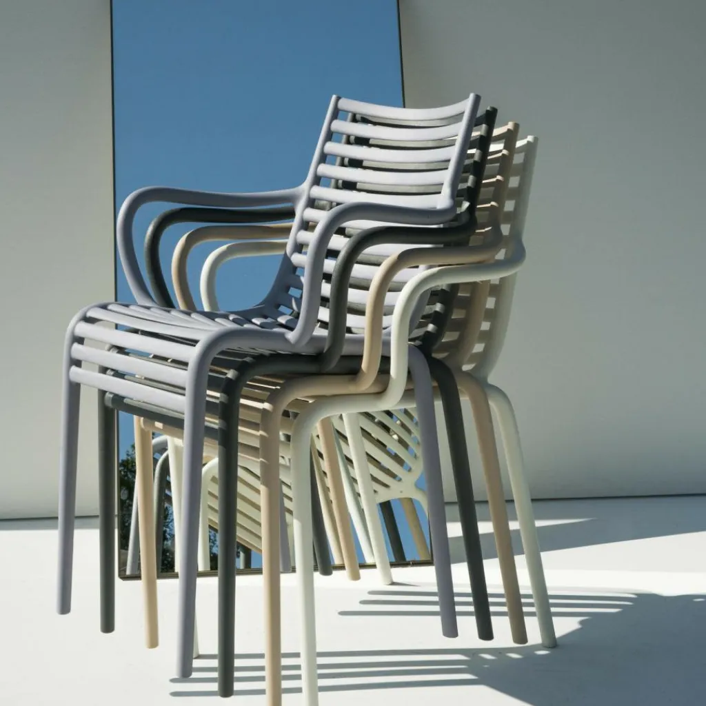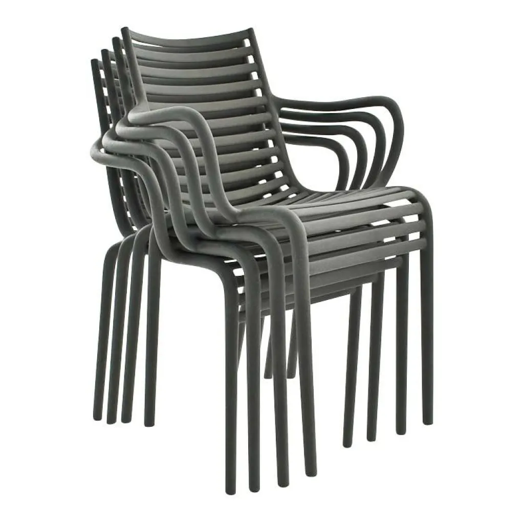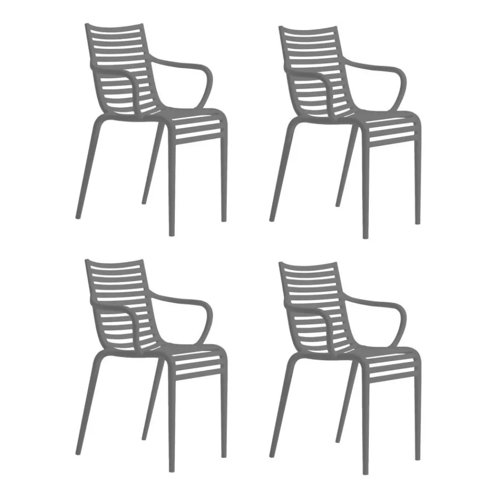 Die regelmäßig angeordneten Latten, die horizontal über Sitz und Rückenlehne laufen, machen den Pip-e-Gartenarmlehnstuhl zu einem attraktiven Hingucker. Sie verleihen dem Sitzmöbel eine kontrastreiche Optik und erzeugen einen imposanten Schattenwurf. In der Seitenansicht fällt der sanfte Schwung auf, der sich durchs Design des Gestells zieht. Die Sitzfläche wölbt sich harmonisch über die vordere Stuhlkante. Die Rückenlehne biegt sich leicht nach hinten. In Form ausladender Bögen versprechen die Armlehnen einen bequemen Sitz, während die leicht ausgestellten rückwärtigen Stuhlbeine für eine gute Stabilität sorgen. Gefertigt aus hochwertigem Polypropylen ist das Pip-e Gartenarmlehnstuhl 4er Set robust und witterungsbeständig. Es passt auf die Büroterrasse, in den Hotelgarten oder vor das Gartenhaus daheim.