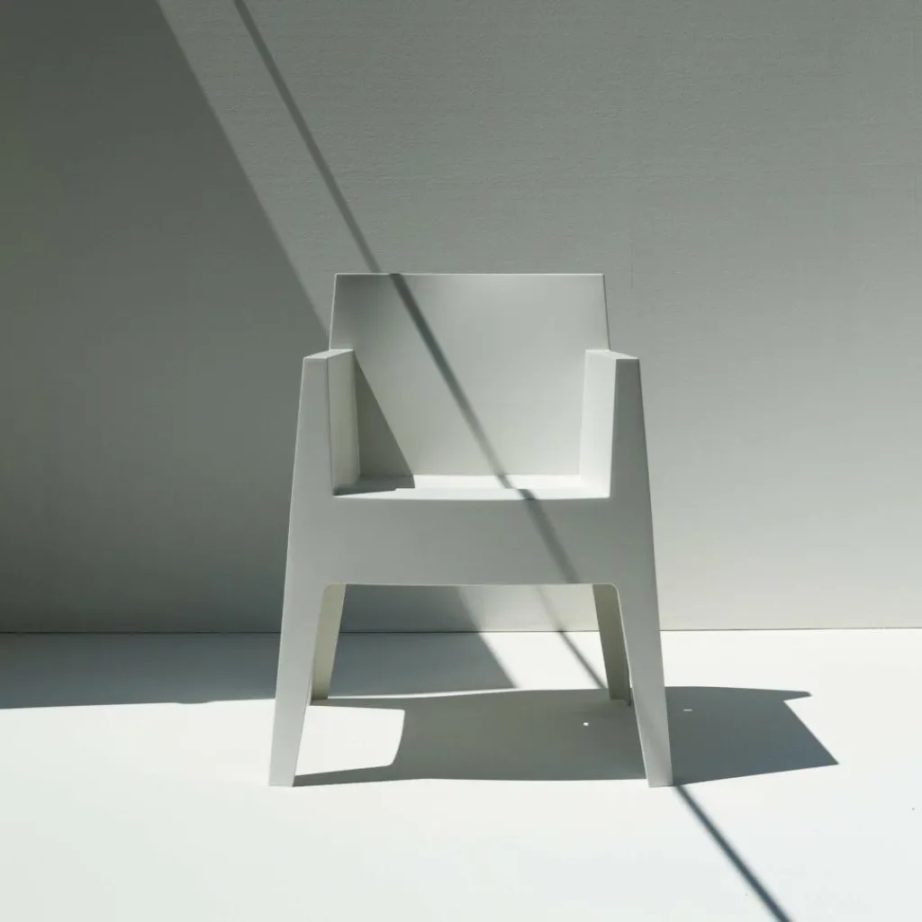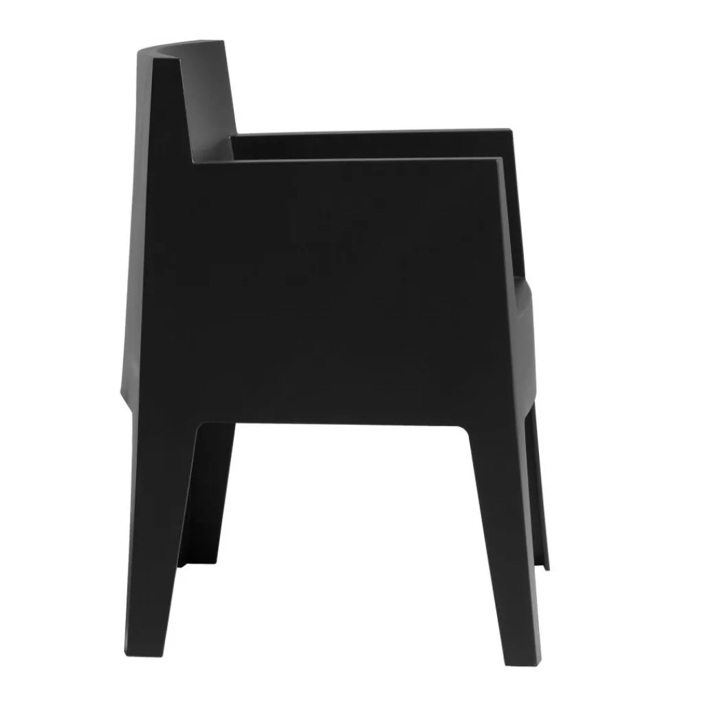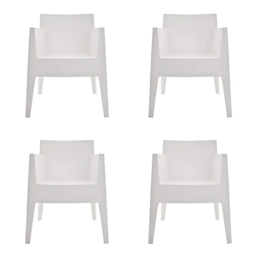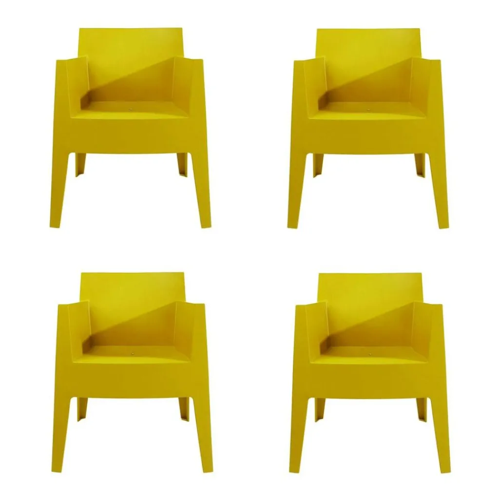 Mit ihren geraden Flächen und scharfen Kanten wirken die Modelle aus dem Toy Gartenstuhl 4er Set wie aus massiven Blöcken geschnitten. Verglichen mit den breiten Rückenflächen, die eine Tischkante kaum überragen, erscheinen die Armlehnen hoch. Zudem versprechen die großzügig breiten Sitzflächen ein bequemes Sitzgefühl. Die nach unten hin leicht auseinander laufenden Beine garantieren zudem einen stabilen Stand. Aus hochwertigem Polypropylen gefertigt, zeichnen sich die Stühle zudem durch eine langlebige Robustheit und Feuchtigkeitsresistenz aus. Sie können daher im Freien stehen sowie in einem Wintergarten oder einer Schwimmhalle. Das Toy Gartenstuhl 4er Set macht sich gut in einer Terrassenbar, im Wellnessgarten eines Hotels oder in einem Atrium für die Pause am Arbeitsplatz.