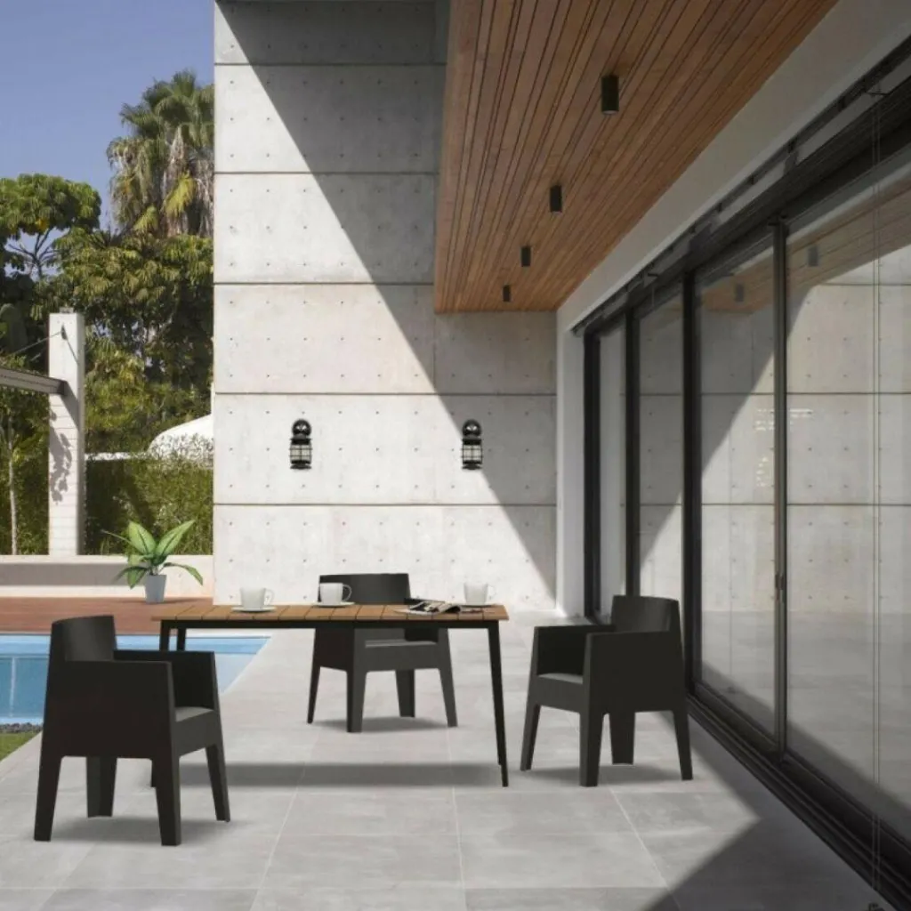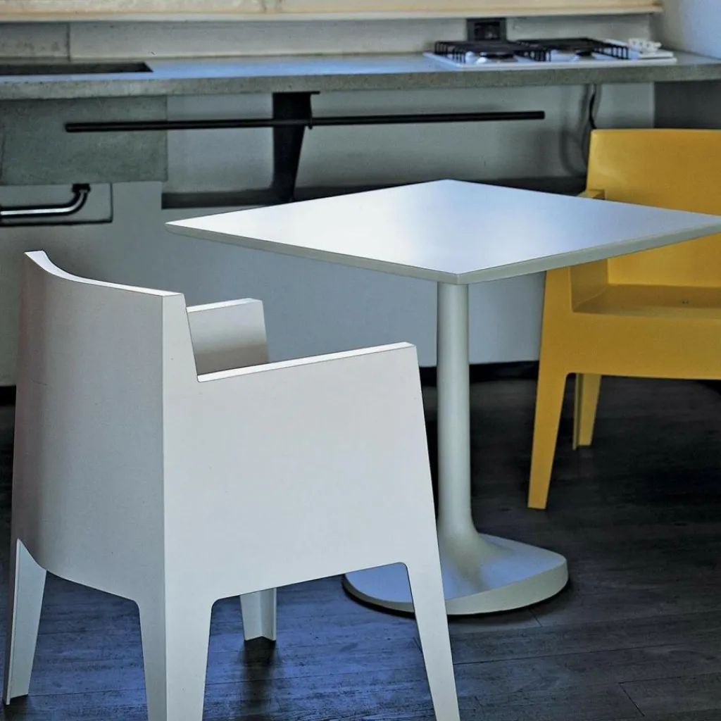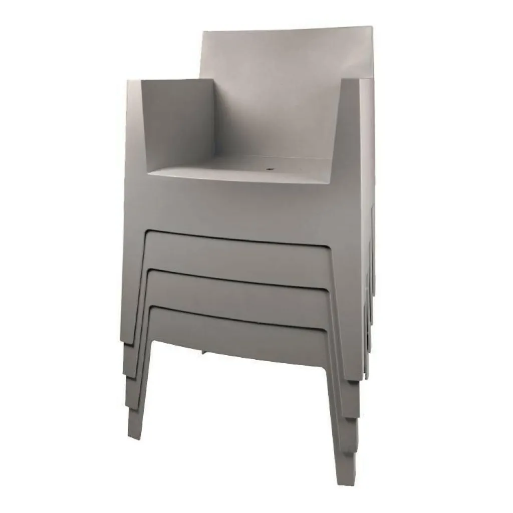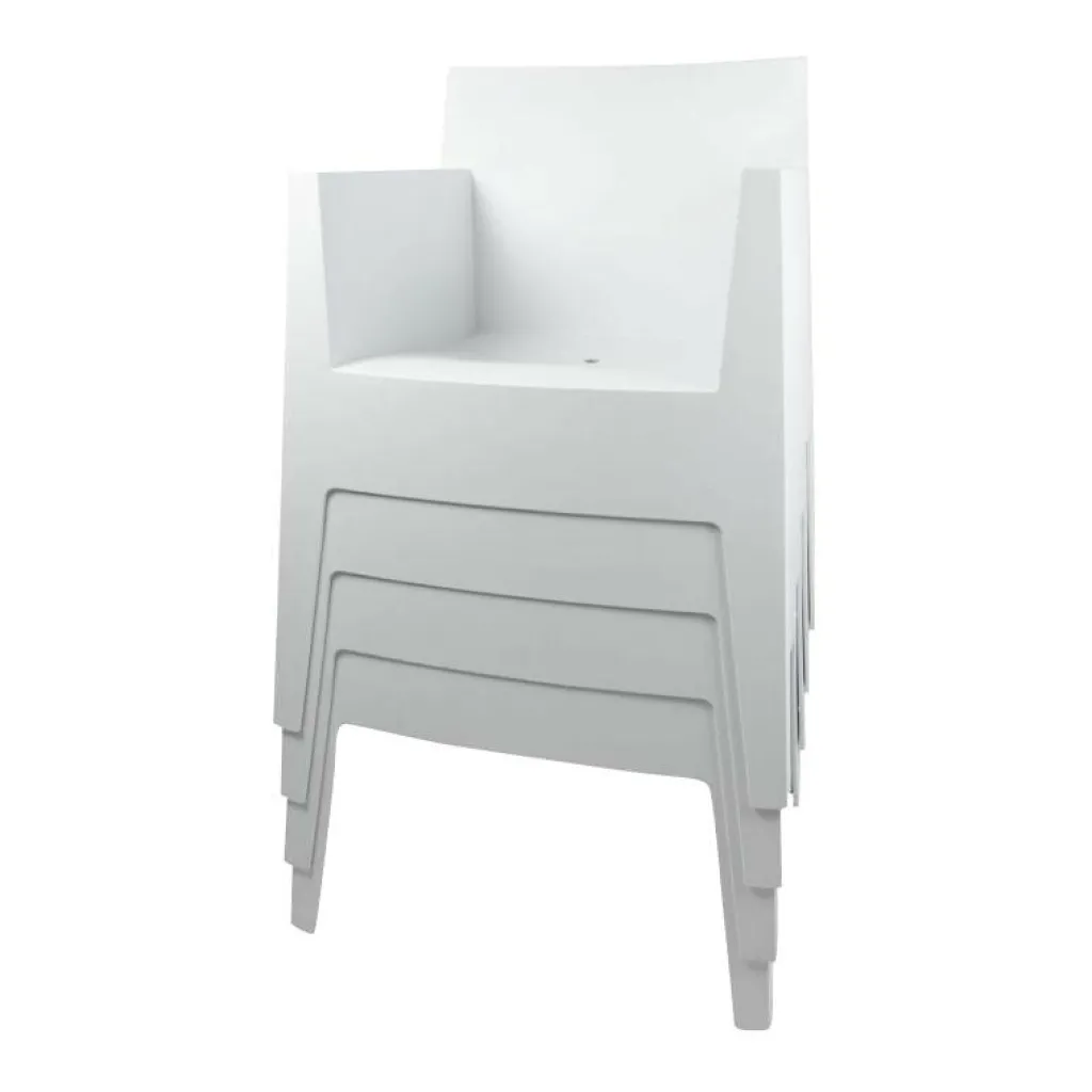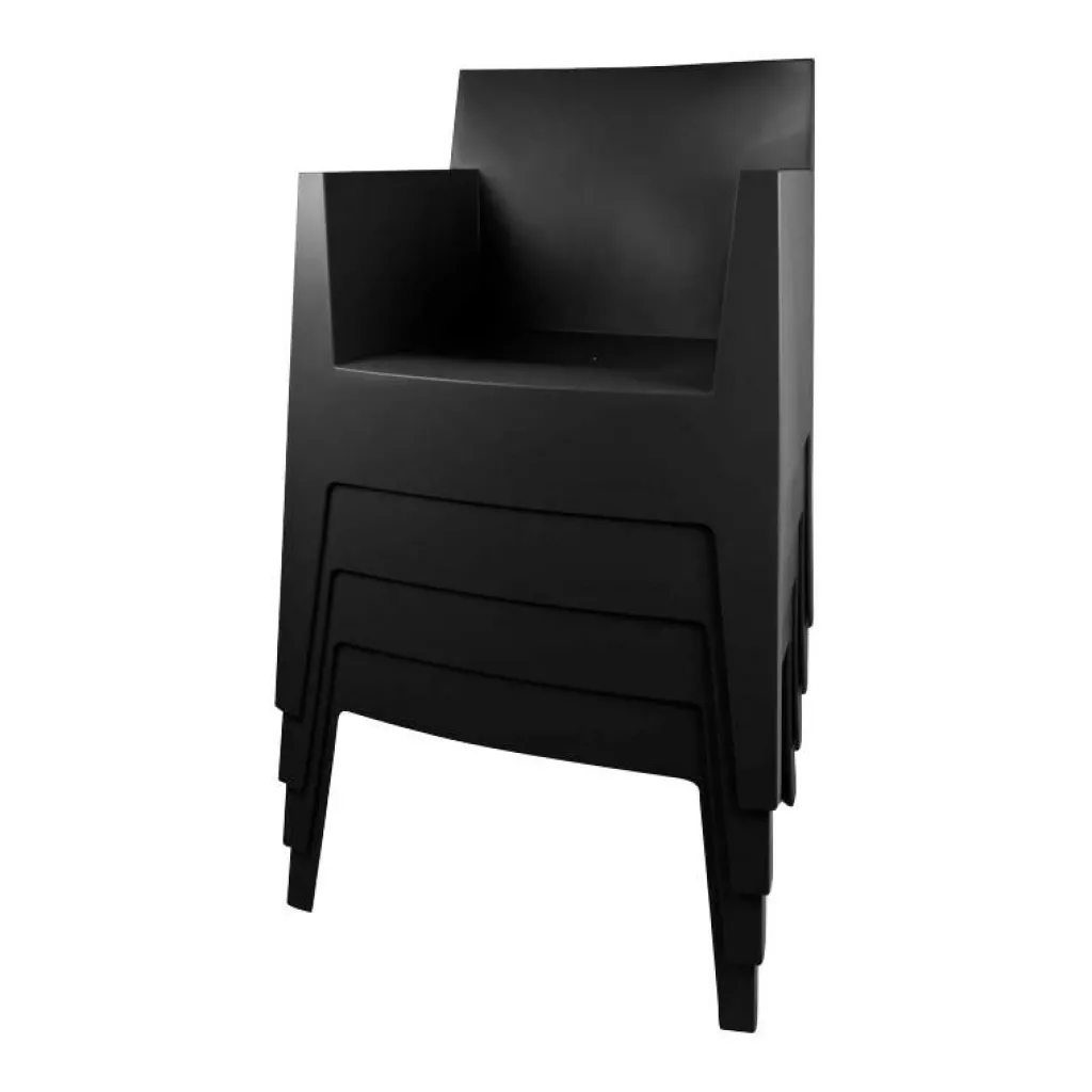 Mit ihren geraden Flächen und scharfen Kanten wirken die Modelle aus dem Toy Gartenstuhl 4er Set wie aus massiven Blöcken geschnitten. Verglichen mit den breiten Rückenflächen, die eine Tischkante kaum überragen, erscheinen die Armlehnen hoch. Zudem versprechen die großzügig breiten Sitzflächen ein bequemes Sitzgefühl. Die nach unten hin leicht auseinander laufenden Beine garantieren zudem einen stabilen Stand. Aus hochwertigem Polypropylen gefertigt, zeichnen sich die Stühle zudem durch eine langlebige Robustheit und Feuchtigkeitsresistenz aus. Sie können daher im Freien stehen sowie in einem Wintergarten oder einer Schwimmhalle. Das Toy Gartenstuhl 4er Set macht sich gut in einer Terrassenbar, im Wellnessgarten eines Hotels oder in einem Atrium für die Pause am Arbeitsplatz.