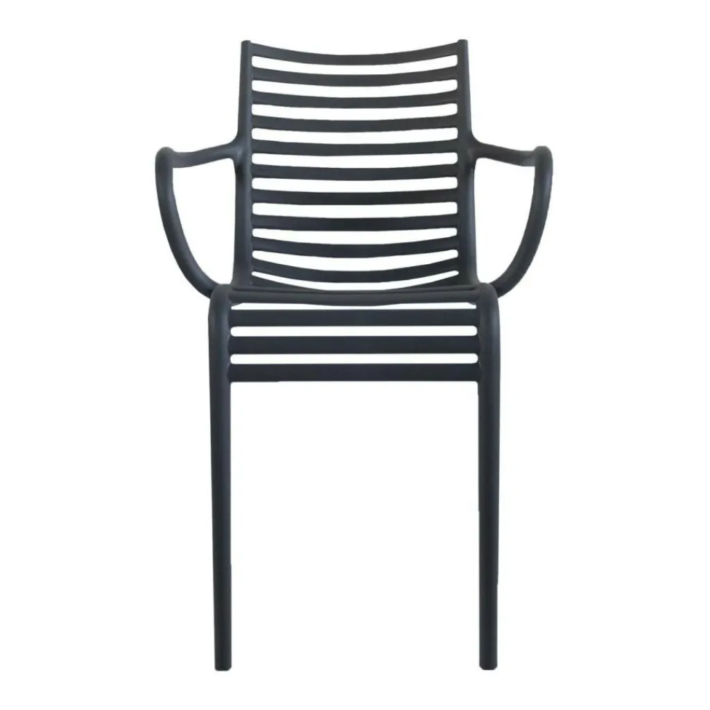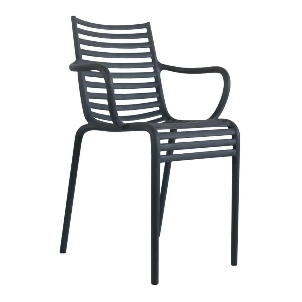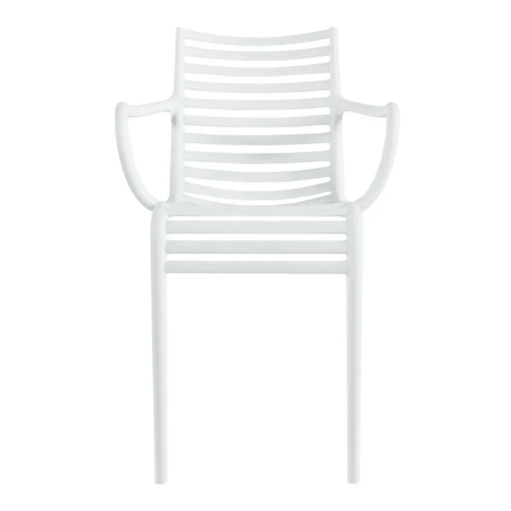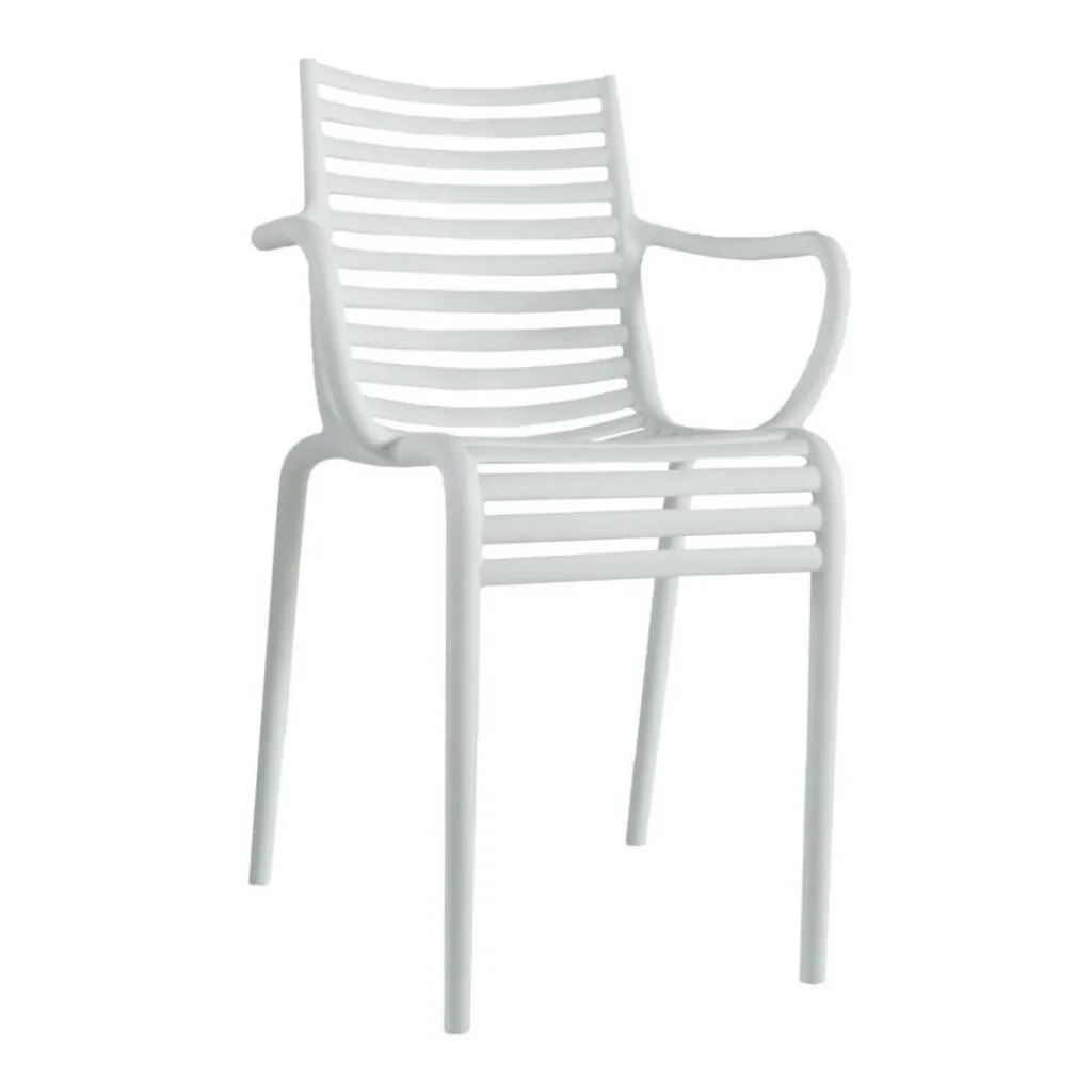 Starck greift mit dem Pip-e Green Gartenarmlehnstuhl das Design bewährter Gartenmöbel auf und transportiert es in das moderne Zeitalter. Schwungvoll geformte Querstreben zeichnen den Entwurf aus. Sie bilden sowohl die Rückenlehne als auch die Sitzfläche. Zum Markenzeichen werden die leicht abstehenden Armlehnen, die ein Dreieck bilden. Die Rückenlehne und Sitzfläche sind ergonomisch geformt. Daher ist das Sitzgefühl im Pip-e Green Gartenarmlehnstuhl auch nach vielen Stunden ganz ausgezeichnet. Außerdem beweist Starck bei der Materialwahl Umweltbewusstsein. Der Pip-e Green Gartenarmlehnstuhl besteht nämlich aus recyceltem Polypropylen. Der Kunststoff ist so robust, dass er bei jedem Wetter im Freien verweilen kann. Werden die Möbel einmal nicht gebraucht, können bis zu 4 Stück übereinandergestapelt werden.