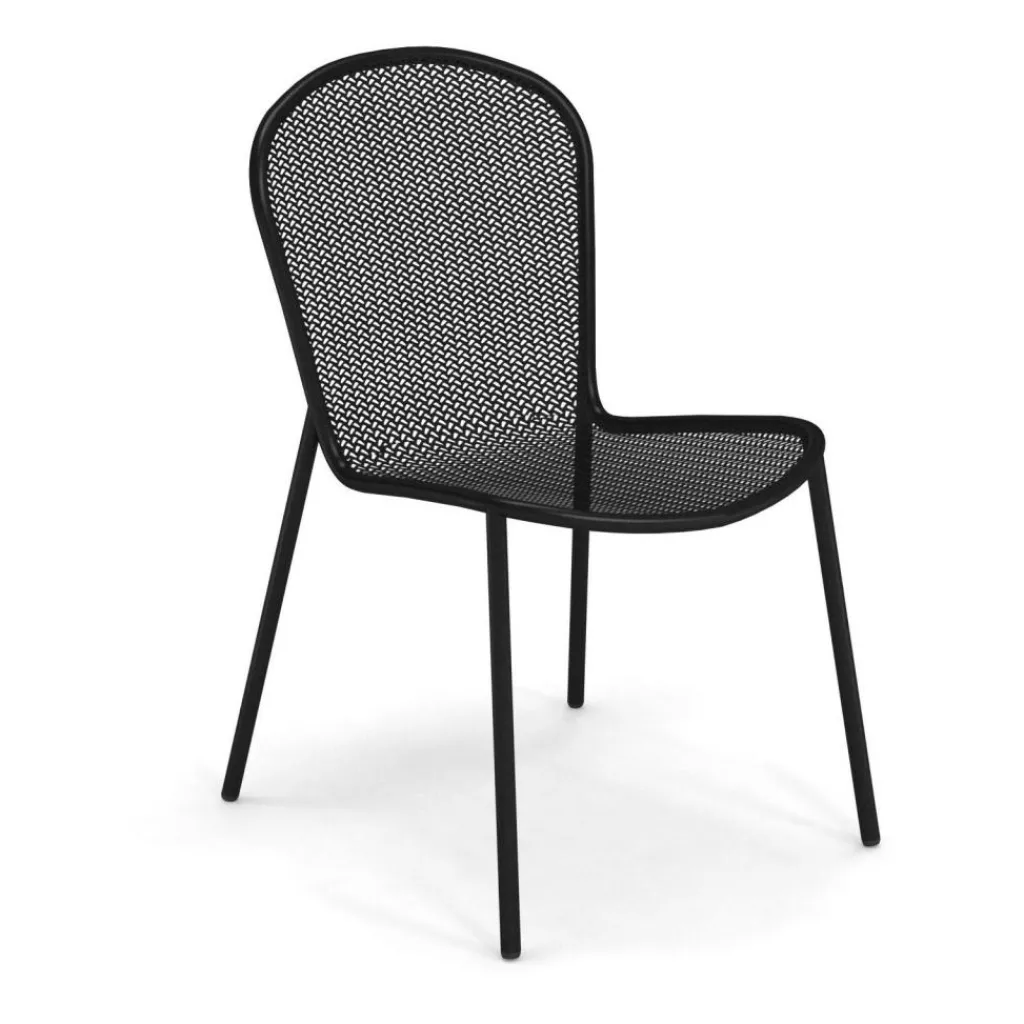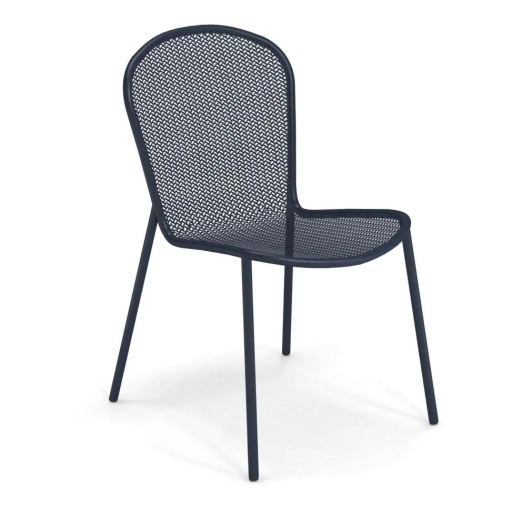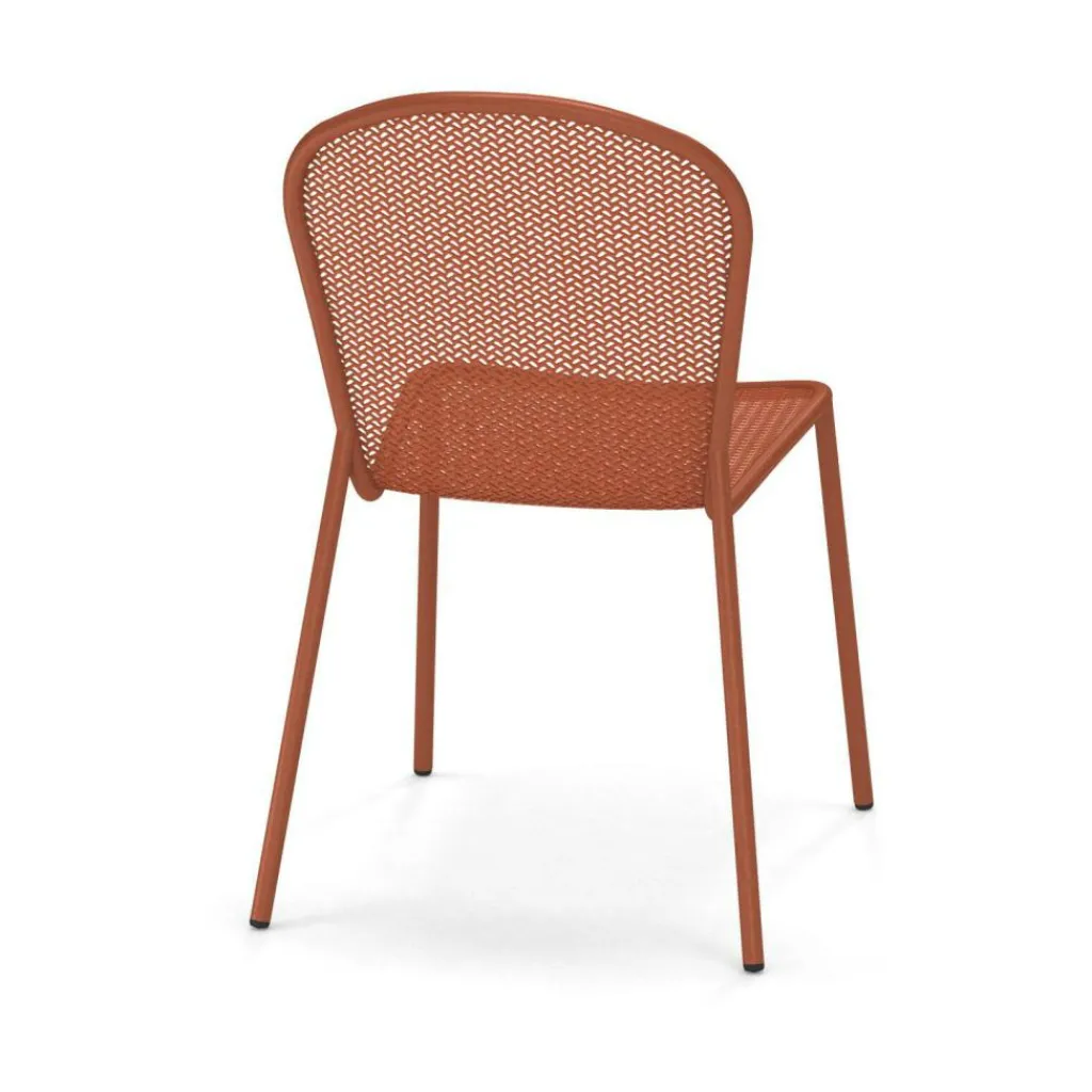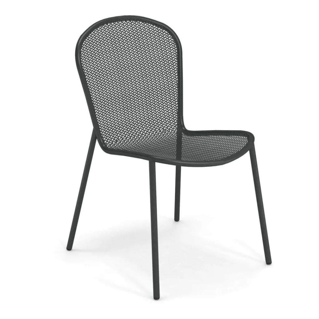 Der Name des Ronda XS Gartenstuhl geht auf die sanft gerundeten Kanten und die in einem Halbbogen geformte Rückenlehne zurück. Das Gestell aus pulverbeschichtetem Stahl sichert mit seinen vier leicht ausgestellten Stuhlbeinen sicheren Halt. Darauf ist eine Sitzschale montiert. Die Sitzfläche und Rückenlehne sind aus einem Guss gefertigt. Verwendet wird dafür auffallendes Lochblech, das wie ein grob gewebtes Textil wirkt. Erstklassigen Sitzkomfort zeichnet den Ronda XS Gartenstuhl aus.