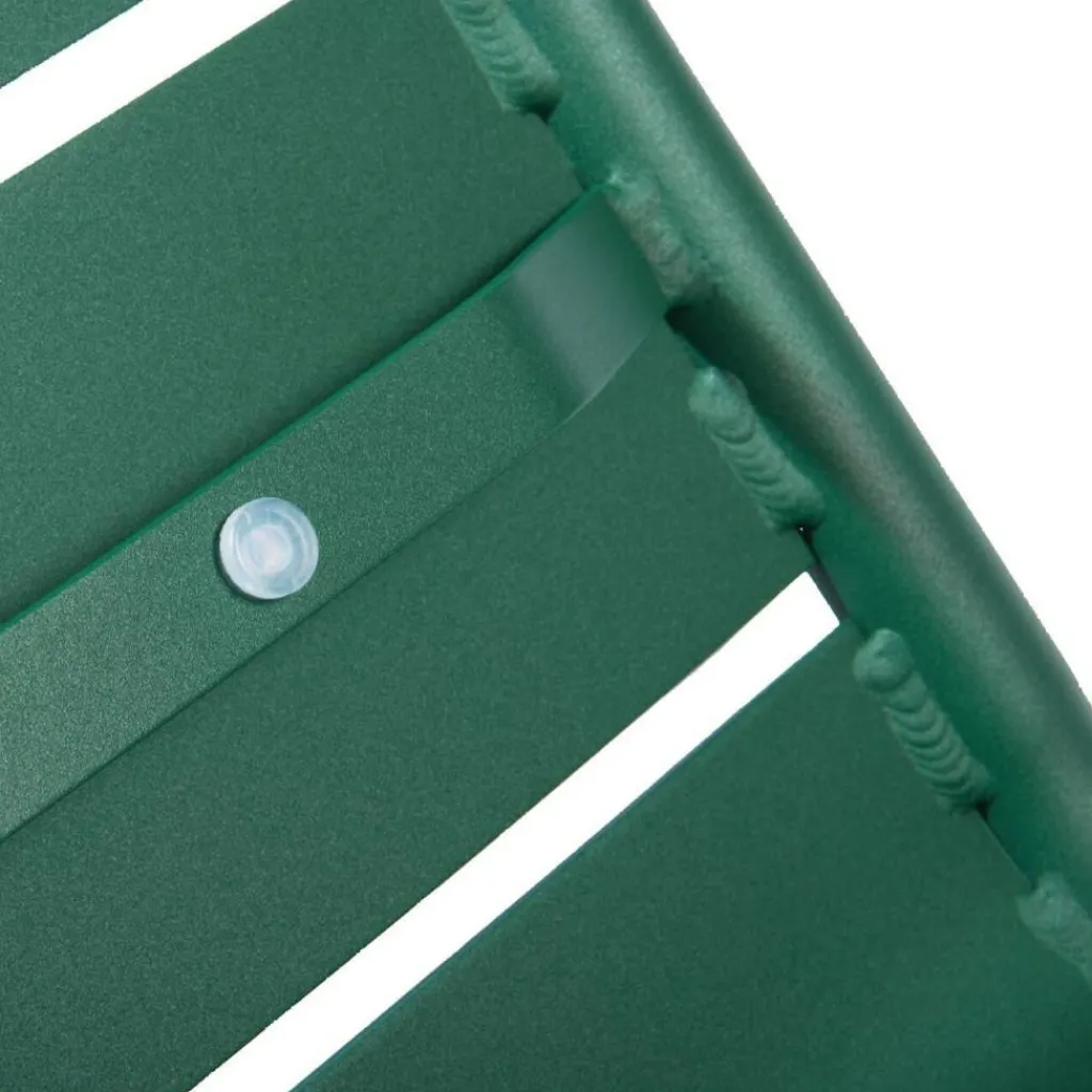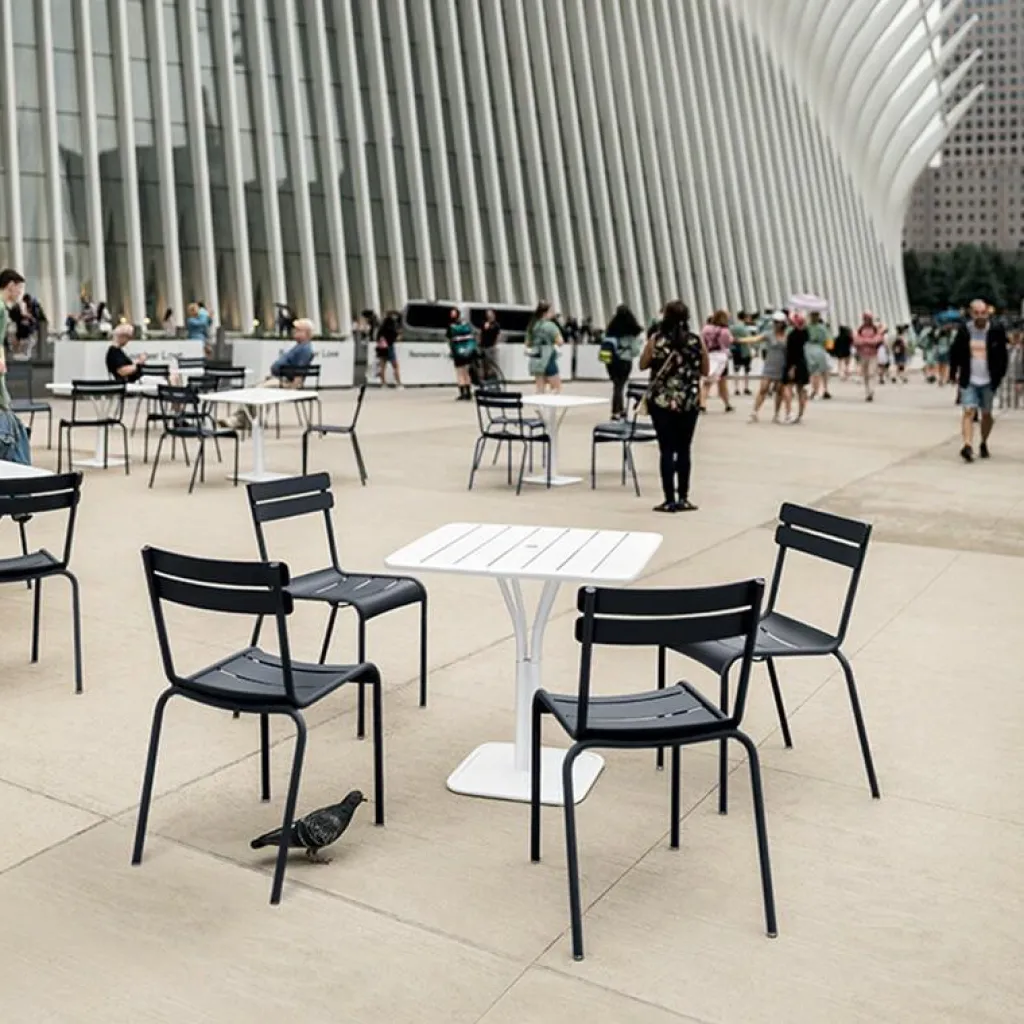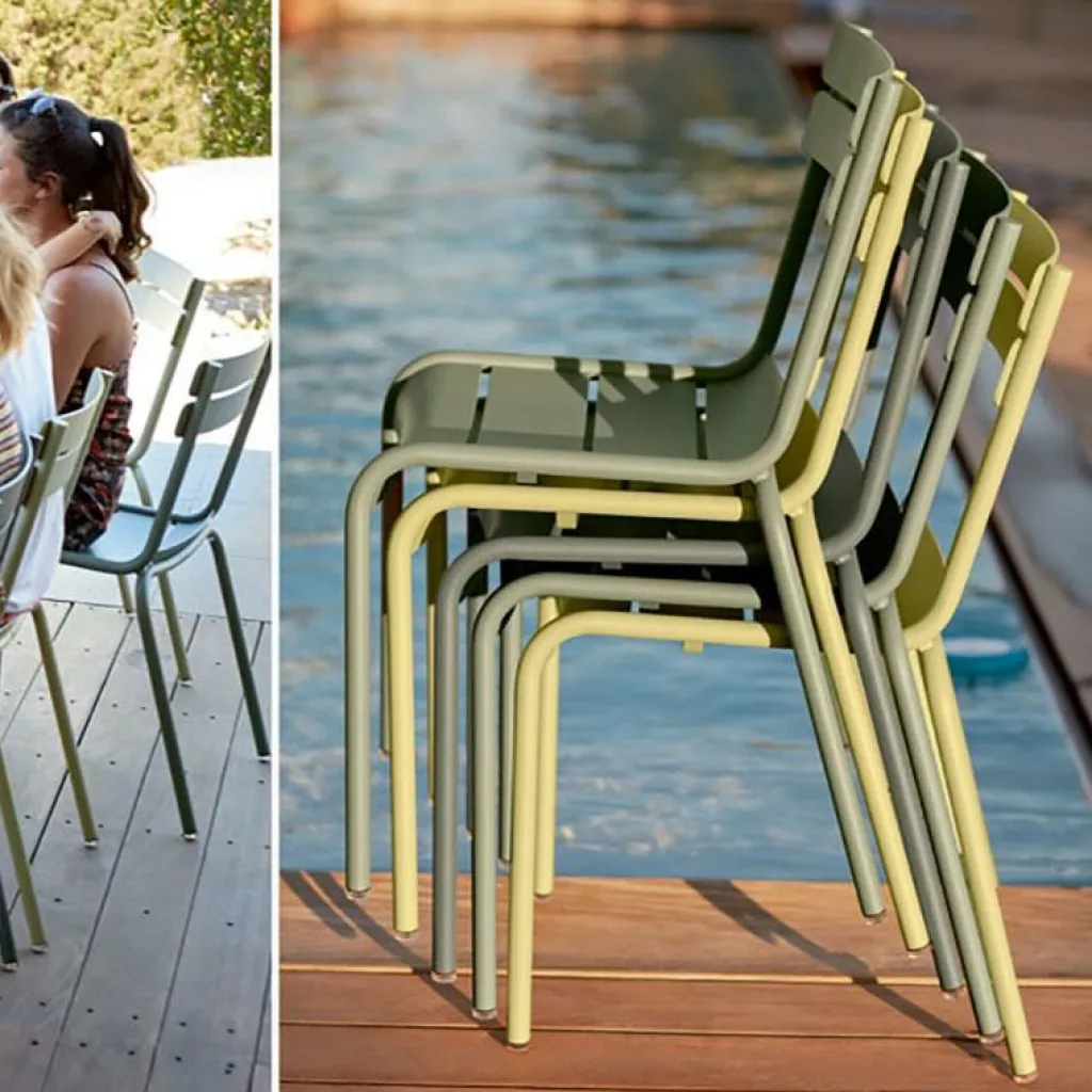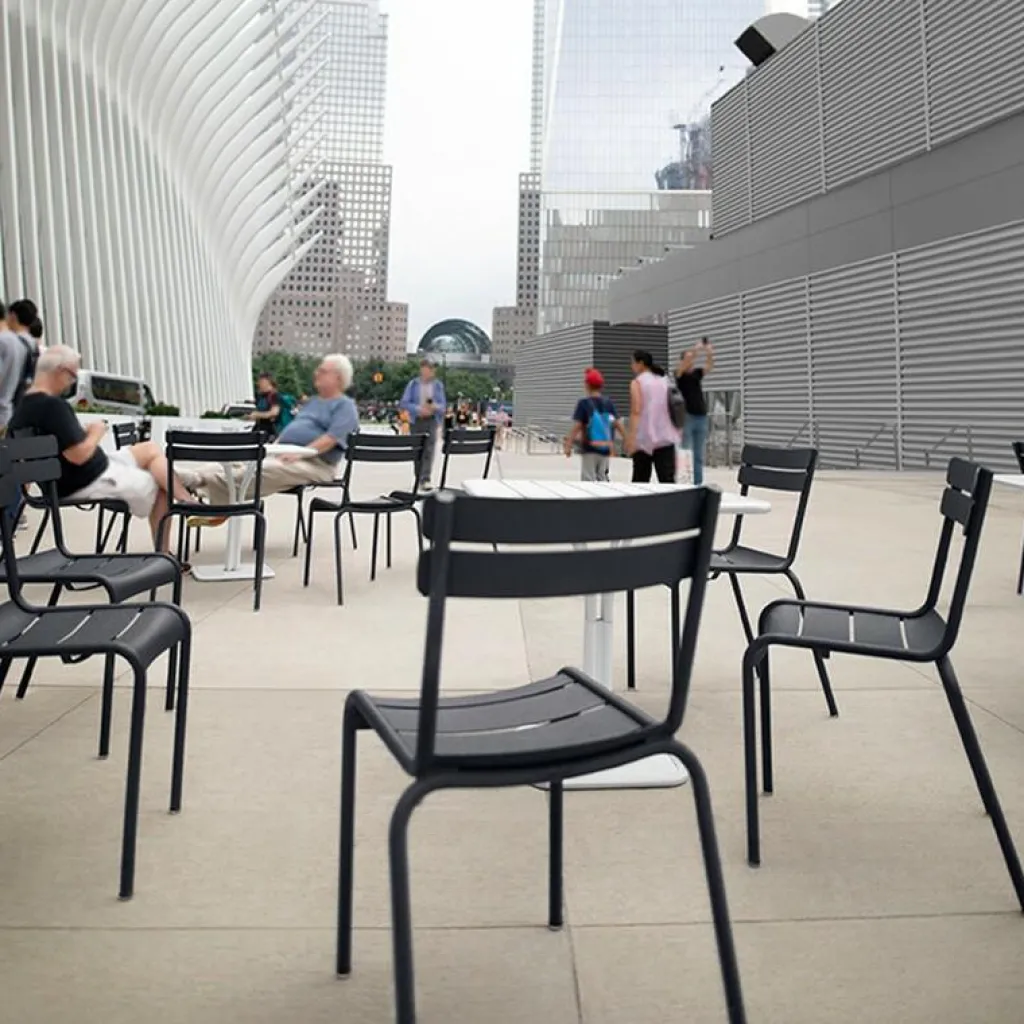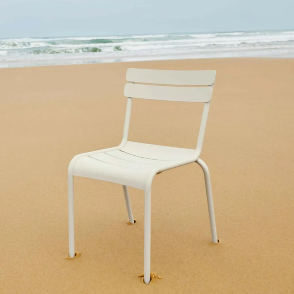Die Sitzfläche ist eingebuchtet und wölbt sich sanft über die Stuhlkante. Die leicht nach hinten geneigte Stuhllehne bietet dem Rücken eine komfortable Stütze. Die flächigen Elemente setzen sich aus dicht aneinandergereihten Aluminiumlatten zusammen, die einen bequemen Sitzkomfort versprechen. Für eine hohe Stabilität sorgt der Stuhlrahmen aus hochwertigem Aluminiumrohr mit Gleitern. Der Luxembourg Gartenstuhl ist pulverlackiert und somit langlebig und UV-beständig. So passt das zurückhaltende Outdoormöbel auf den Balkon oder die Terrasse, in ein Atrium oder einen Park. Er eignet sich für den privaten Outdoorbereich und macht sich besonders gut in einem Designhotel oder einem Retro-Café.