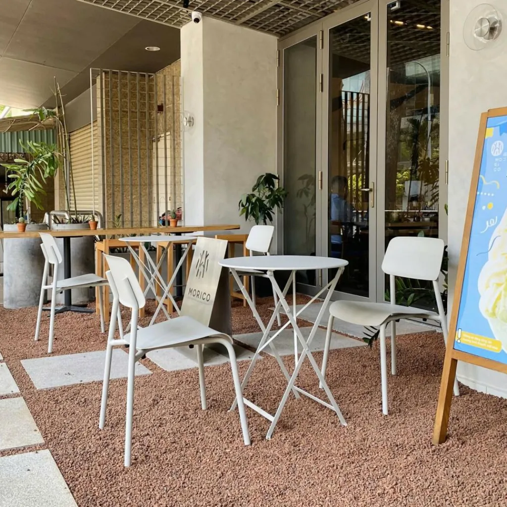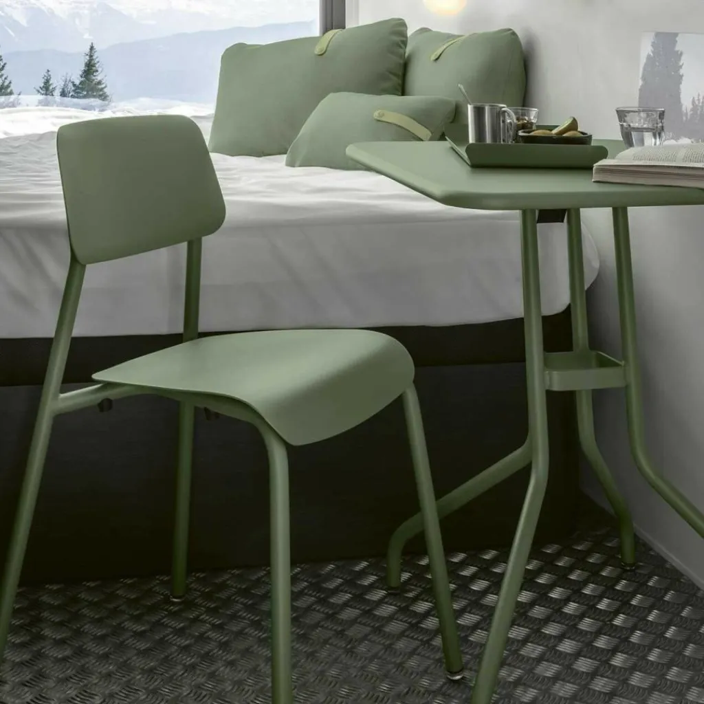 Das Design orientiert sich an einer hohen Funktionalität: Sitzfläche und Rückenlehne sind ergonomisch geschwungen; das Gestell ist dank der ausgestellten Beine stabil und stapelbar. Damit ist der Studie Gartenstuhl ein praktisches Möbel, das für längere Zeit einen bequemen Sitz bietet und sich gleichzeitig platzsparend verstauen lässt. Seinem Rahmen aus gebogenem Aluminiumrohr verdankt der Designstuhl seine Leichtigkeit. Das gebogene Aluminiumblech der Flächen verspricht eine angenehme Haptik. Mit Leisegleitern ausgestattet, lässt sich der Studie Gartenstuhl einfach verschieben. Damit passt der formschöne Stuhl an den Terrassentisch, ins Wohnzimmer und genauso in eine Kantine oder ein Gartencafé.