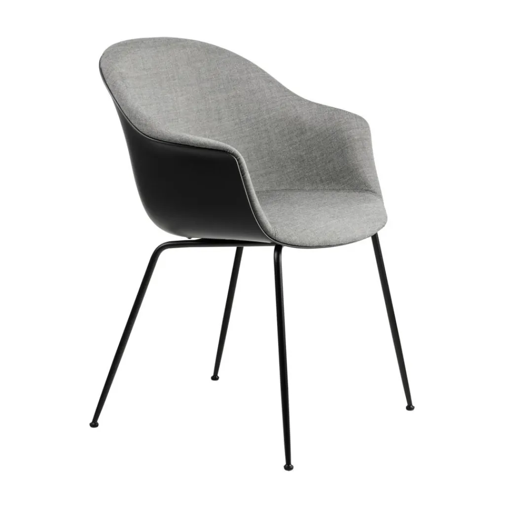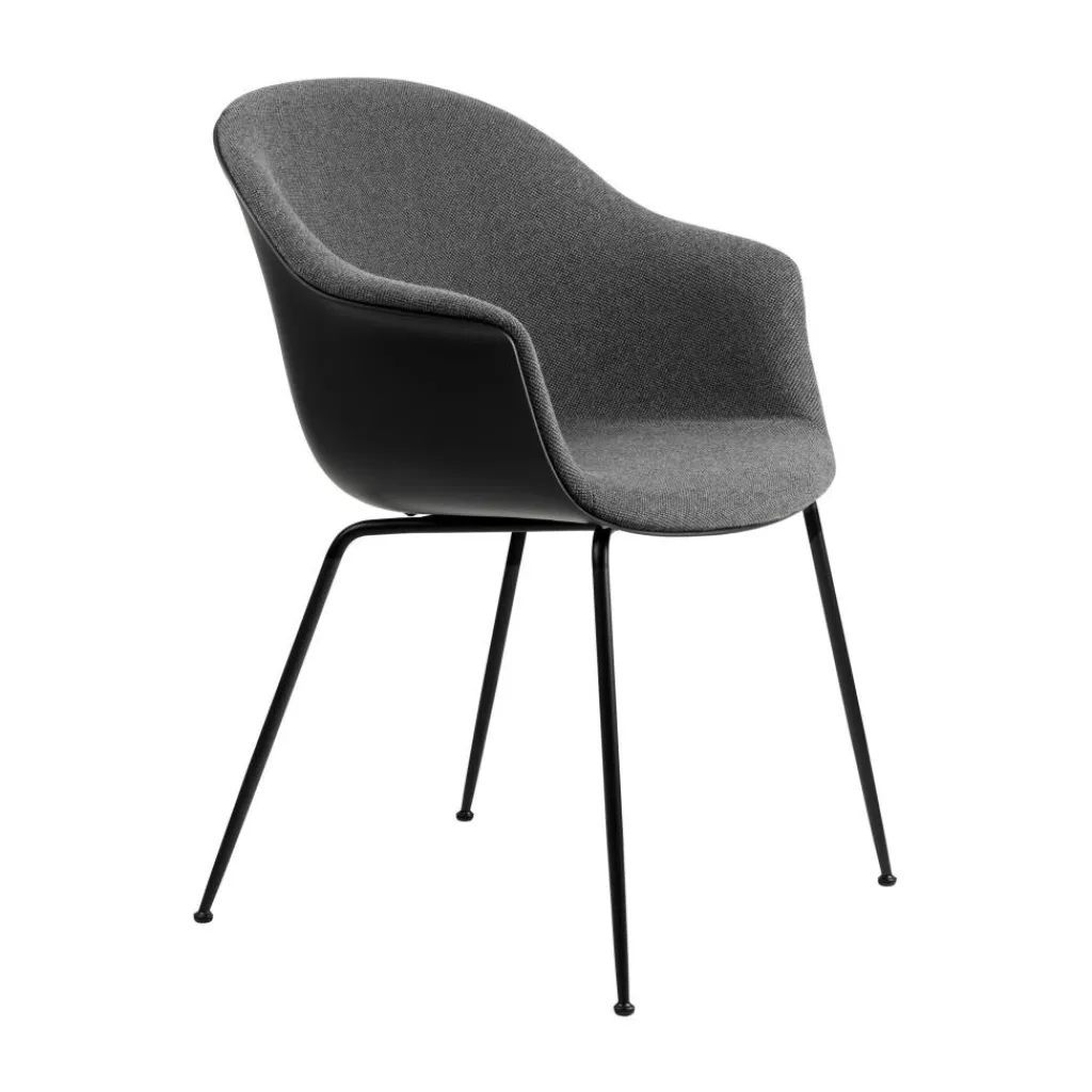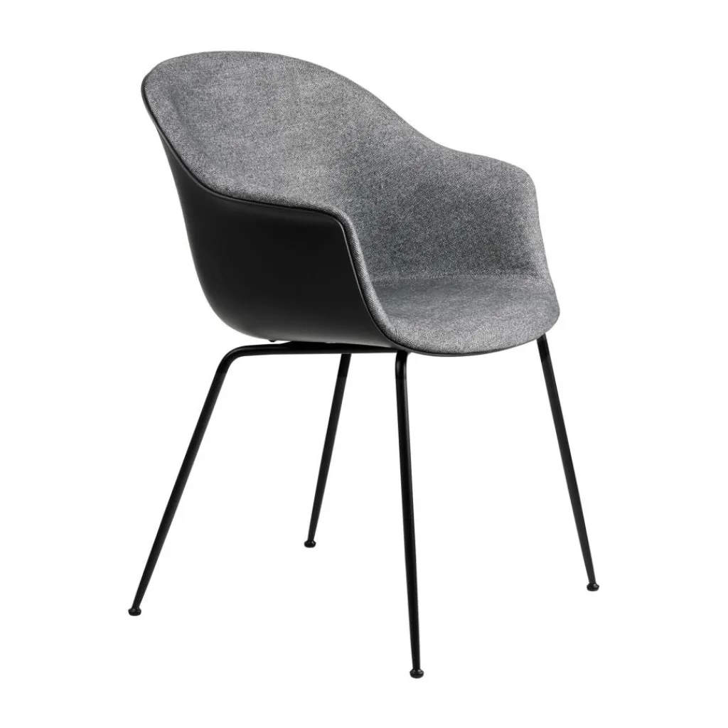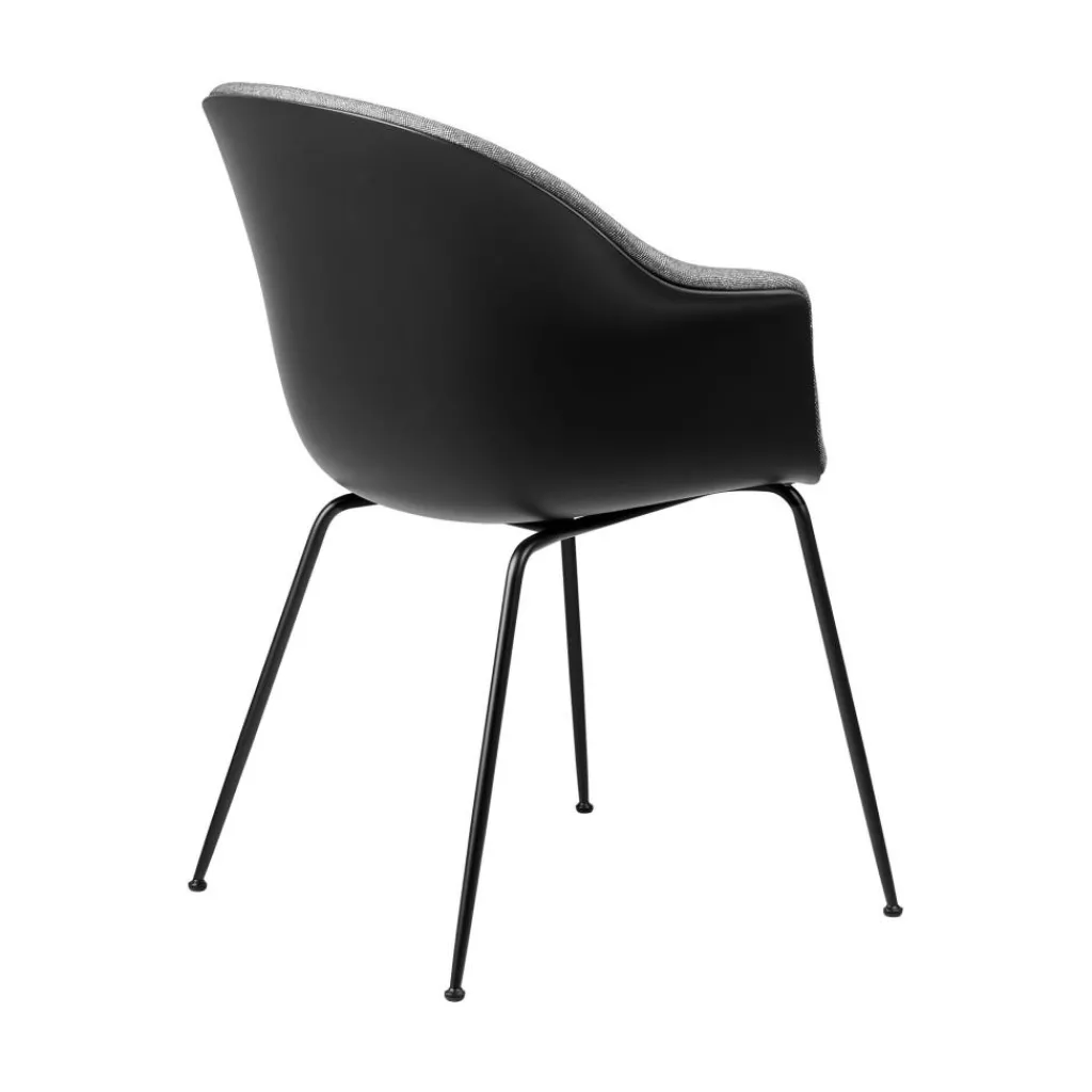 Der Bat Schalenstuhl Frontpolsterung Gestell konisch wurde von GamFratesi für die Marke Gubi entworfen. Er gehört einer Reihe von Sitzmöbeln an, die mit auffälligen Sitzschalen beeindrucken. Ihre Form ist vom Umriss einer Fledermaus inspiriert. Damit erhält der klassische Schalensitz einen modernen Touch.