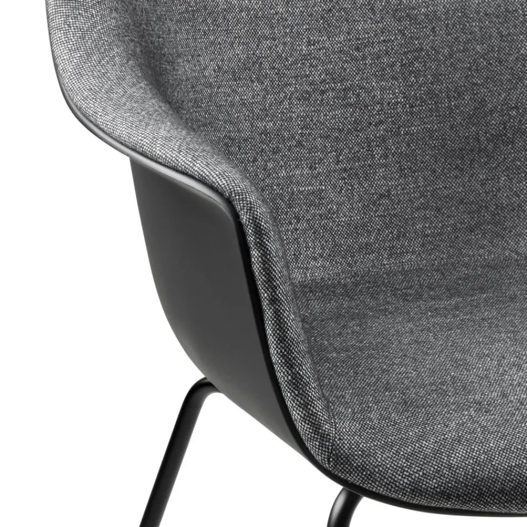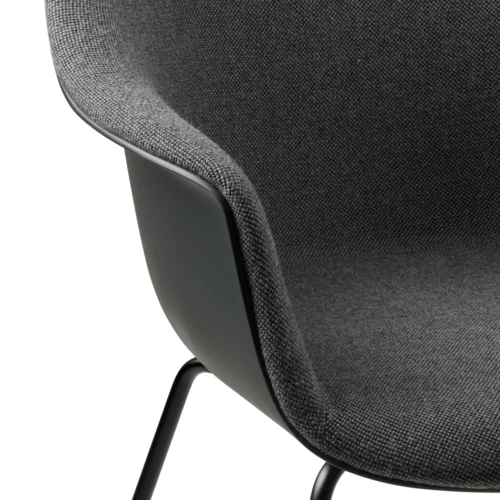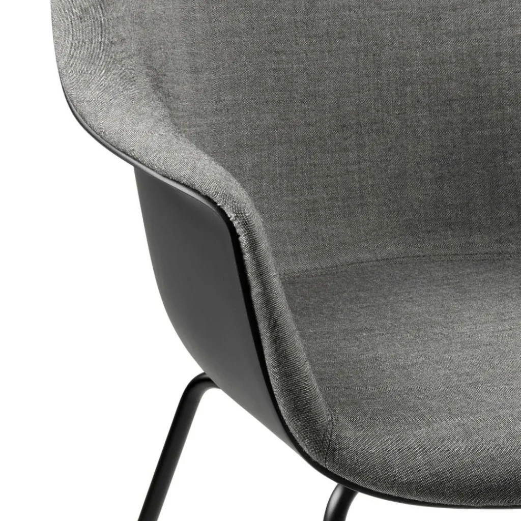Eine breite Sitzschale mit hohen Armlehnen und einem großzügig geschwungenen Rücken lädt zum Platznehmen ein. Sie ist innen mit Schaumstoff gepolstert und mit einem strapazierfähigen Stoff bezogen, der abhängig von der gewählten Ausführung einen Wollanteil von bis zu 90% aufweist. Ein filigranes Stahlgestell bildet die Basis. Die konischen, weit ausgestellten Beine mit Kunststoffgleitern garantieren einen stabilen Stand und verleihen dem Designstuhl eine leichte, elegante Optik. Bei der Herstellung des Bat Schalenstuhls Frontpolsterung Gestell konisch wurde auf kurze Transportwege geachtet, weshalb sich das Designmöbel als nachhaltige Wahl auszeichnet. Er passt als Solitär in eine gemütliche Ecke im Wohnzimmer oder im Ensemble an den Esstisch und macht sich im Vorzimmer eines Büros oder im Warteraum einer Praxis genauso gut wie in der Lobby eines Designhotels.