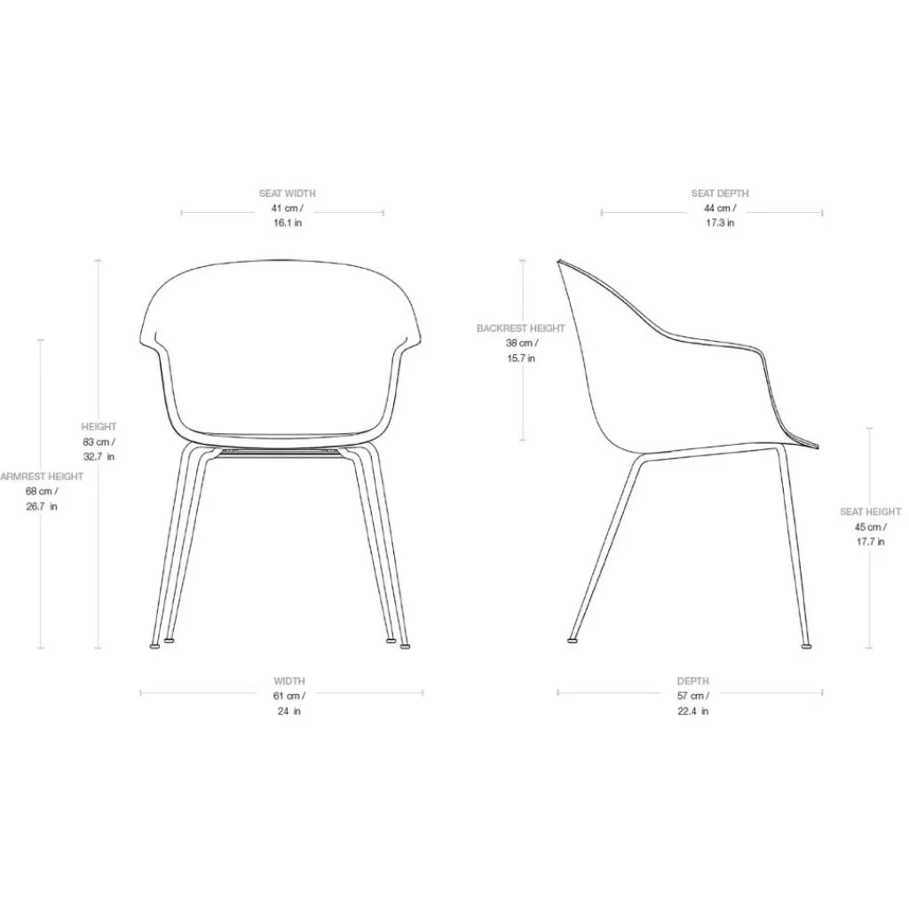 Der Bat Schalenstuhl Frontpolsterung Gestell konisch misst 61cm in der Breite und 57cm in der Tiefe. Er hat eine Sitzhöhe von 45cm. Seine Gesamthöhe beträgt 83cm. Der Designstuhl wiegt 8,8kg. Er ist mit verschiedenen Bezugstoffen erhältlich. Alternativ gibt es aus der Bat-Serie Modelle mit Vollpolsterung.