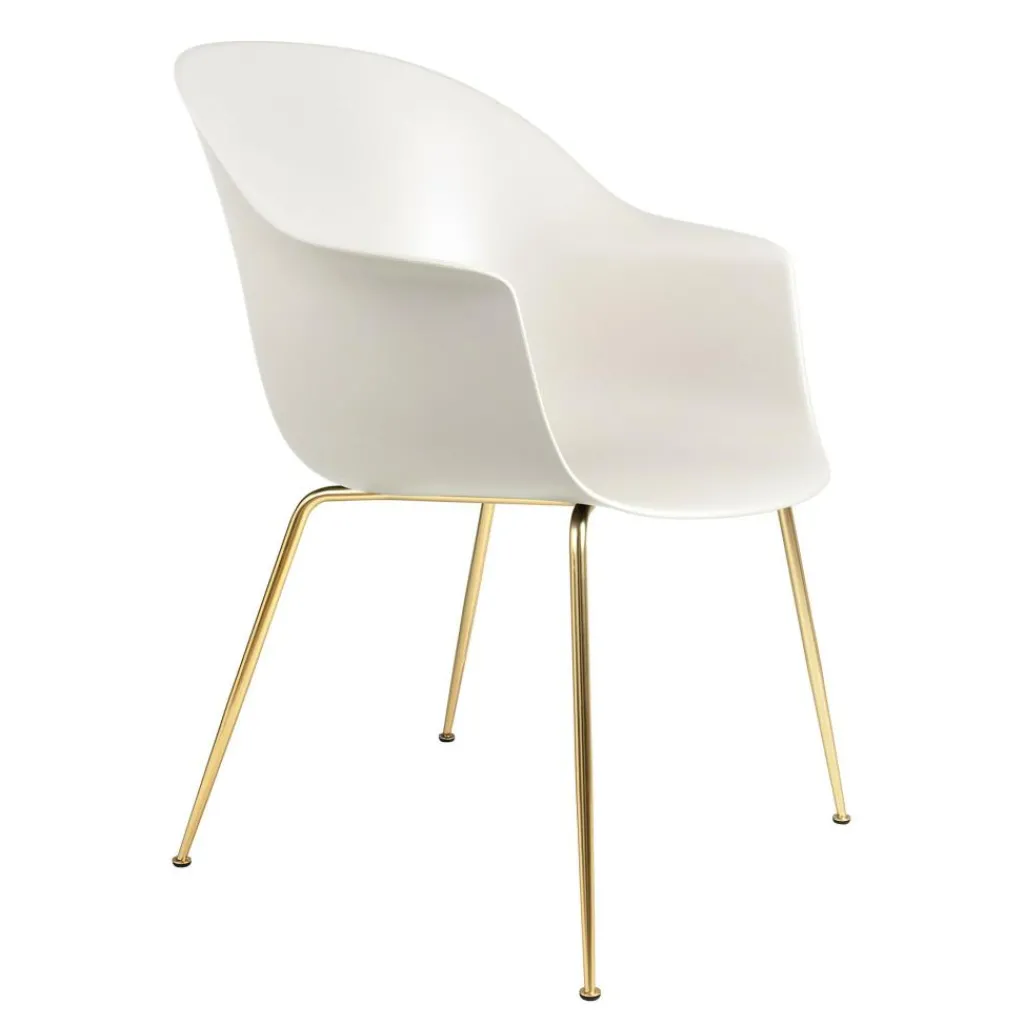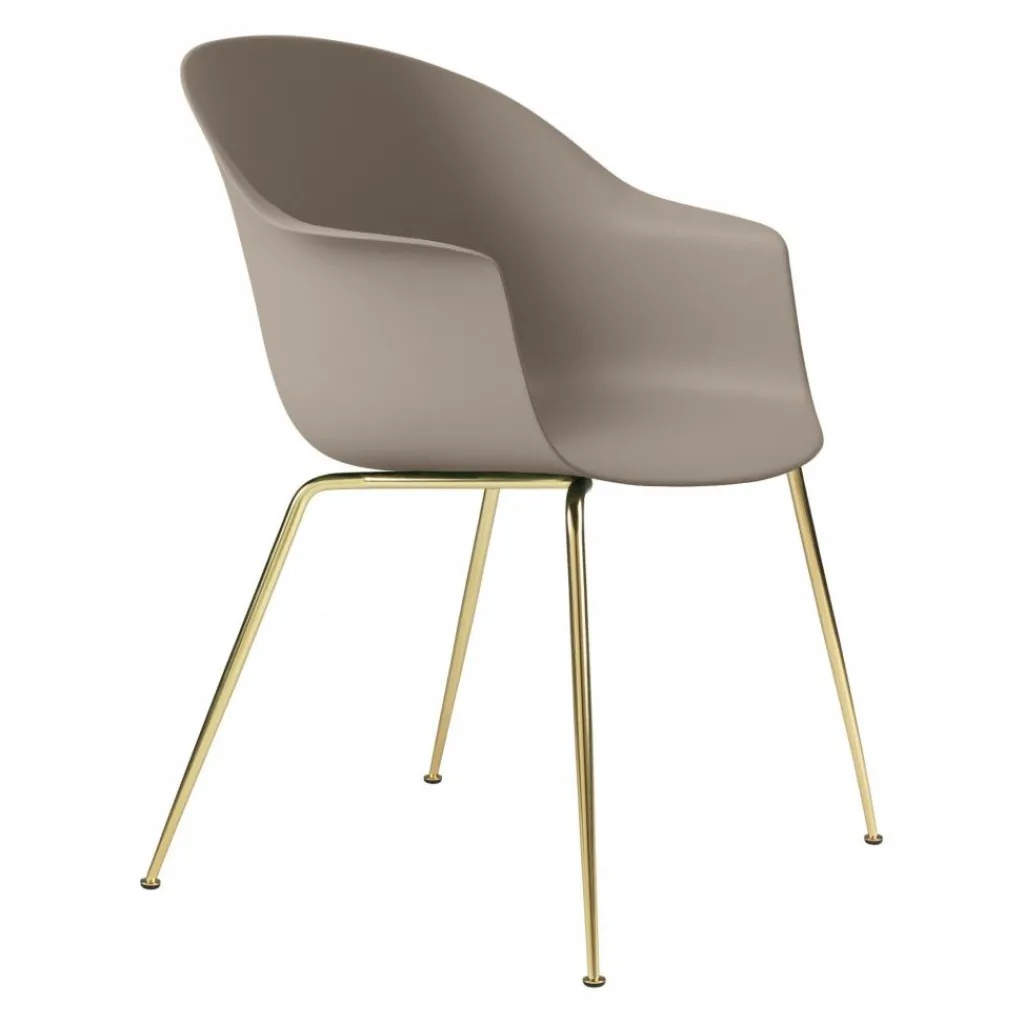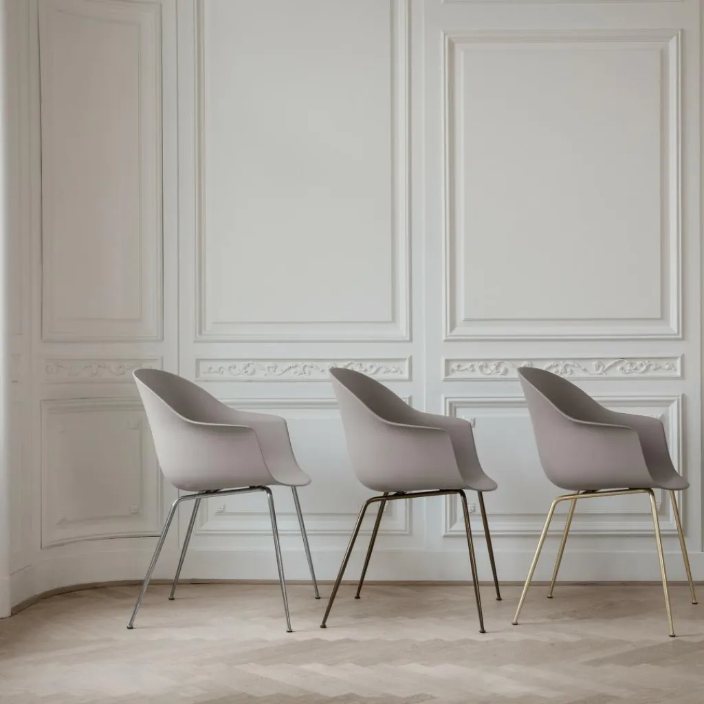 Der Bat Schalenstuhl Gestell konisch messing wurde von GamFratesi für die Marke Gubi entworfen. Das Modell reiht sich ein in die umfangreiche Bat-Kollektion: Seitdem sie im Jahr 2019 auf den Markt gebracht wurde, gibt es fortgehend Erweiterungen. Mittlerweile sind im selben Stil auch Outdoor-Sitzgelegenheiten und Lounge-Sessel erhältlich.