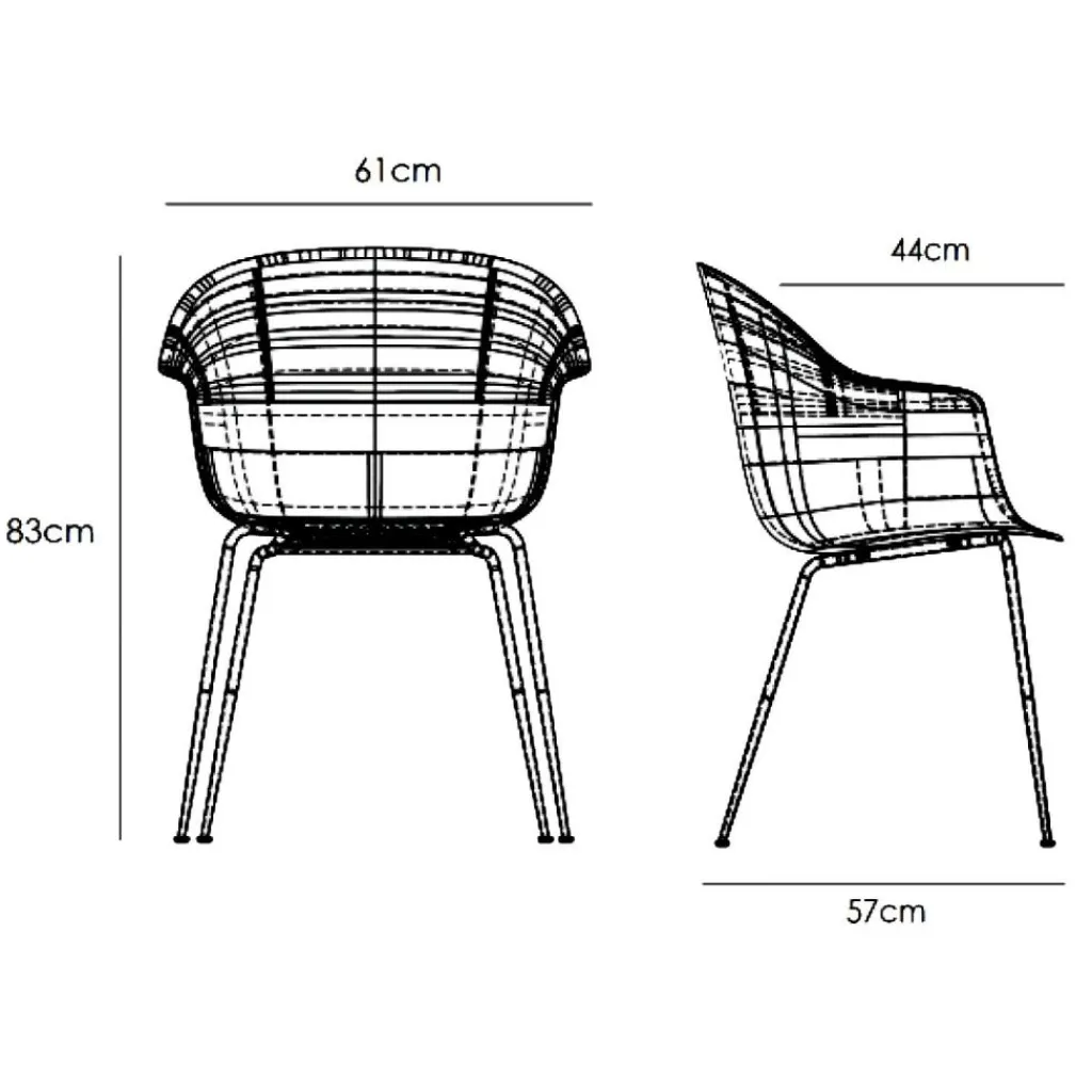 Der Bat Schalenstuhl Gestell konisch messing erreicht ein Gewicht von 5,8 kg. Die Höhe an der Seite beträgt 66 cm. Inklusive der Rückenlehne ist der Dining Chair 83 cm hoch. Das zeitlos elegante Modell ist 57 cm breit und 61 cm tief. Mit einer Sitzhöhe von 45 cm lässt er sich mit jedem beliebigen Tisch kombinieren.