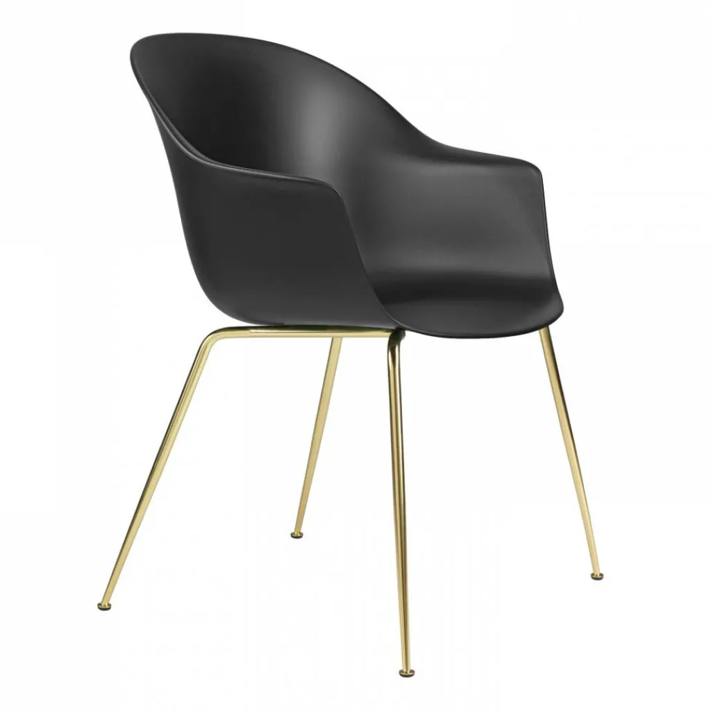 Die Fledermaus, die auf Englisch als Bat bezeichnet wird, diente dem dänisch-italienischen Designerduo Stine Gam und Enrico Fratesi als Inspiration für die Serie. Als sie die Sitzschale entwarfen, dachten sie an die Spannkraft der Flügel des nachtaktiven Tiers. Sehr harmonisch wirkt der Bat Schalenstuhl Gestell konisch messing, da man spitze Kanten vergeblich sucht. Sowohl die Rückenlehne als auch die Armlehnen und die Sitzfläche sind an den Ecken und Enden abgerundet. Die in mehreren Farben erhältliche Schale besteht aus Polypropylen, einem Kunststoff, der leicht zu pflegen ist. Die filigranen Füße aus Stahl bilden einen interessanten Kontrast dazu.
