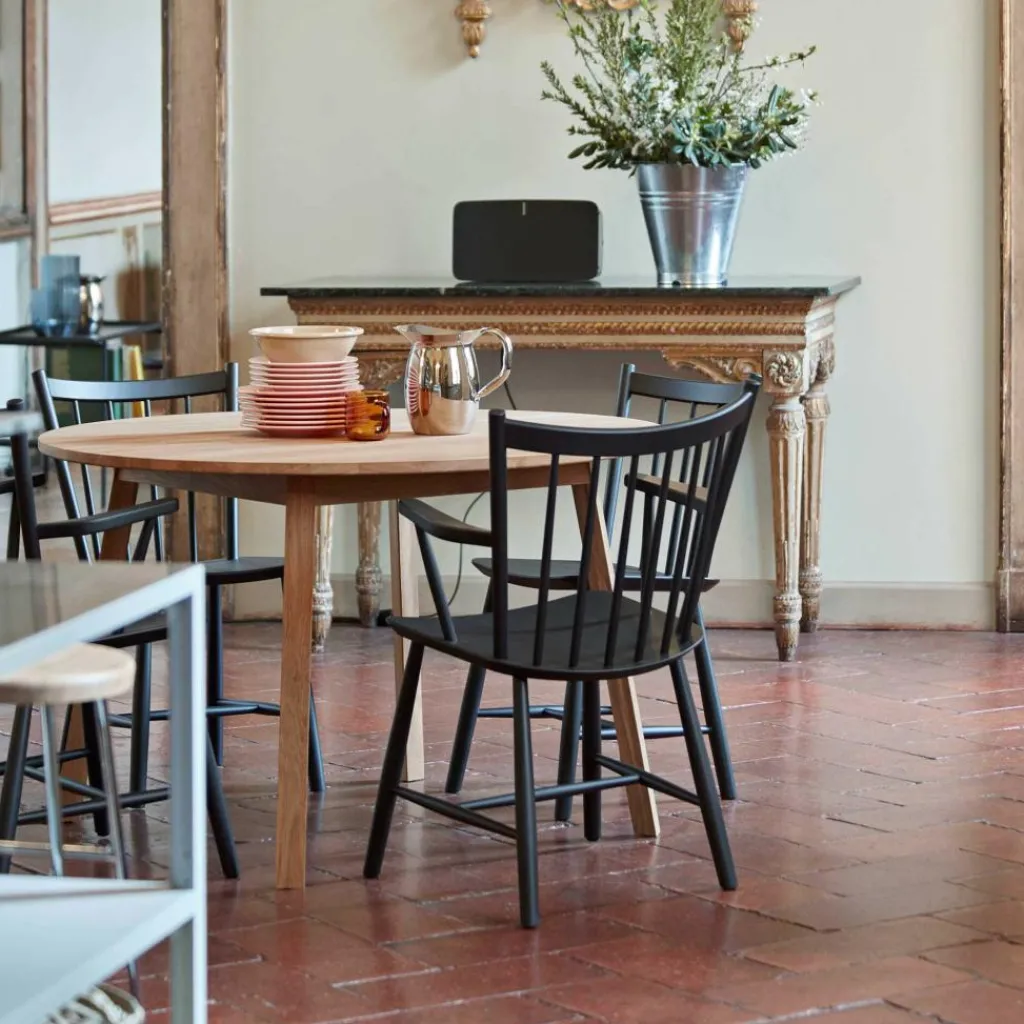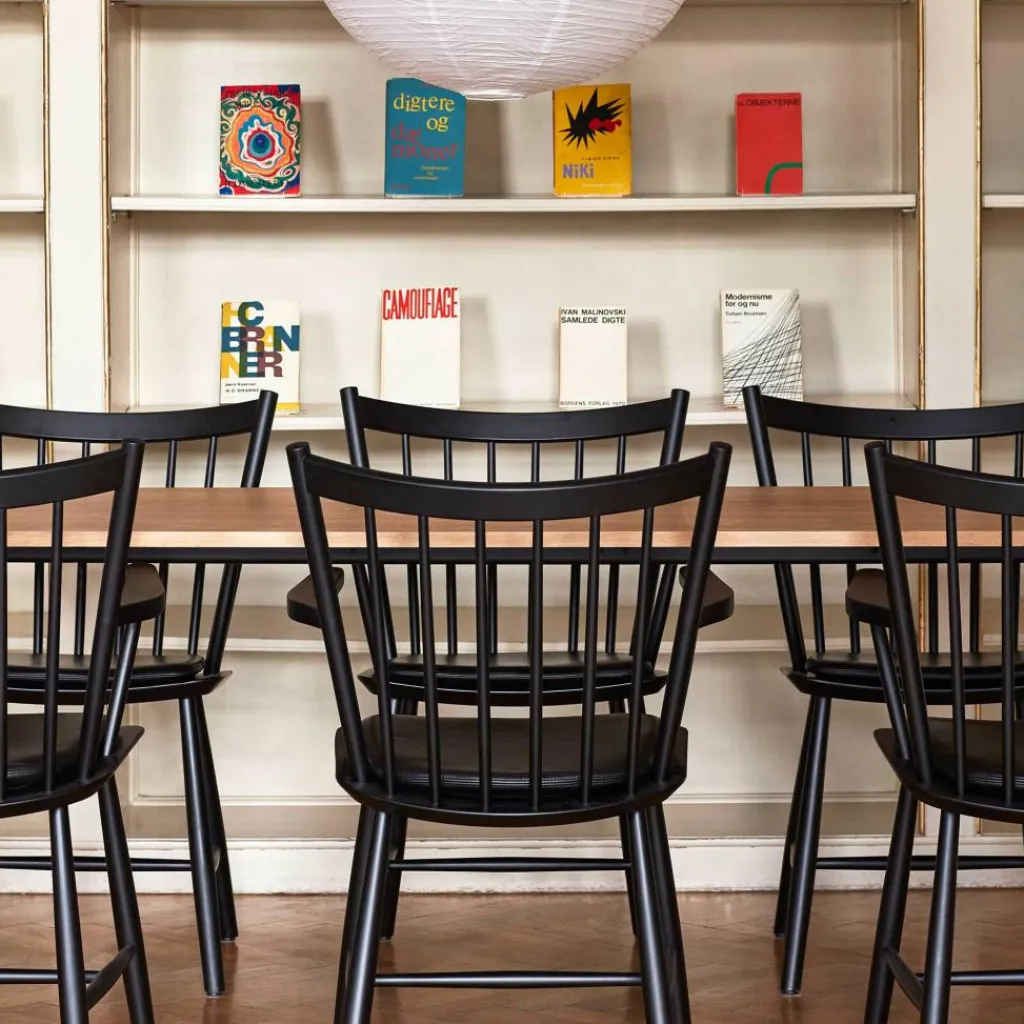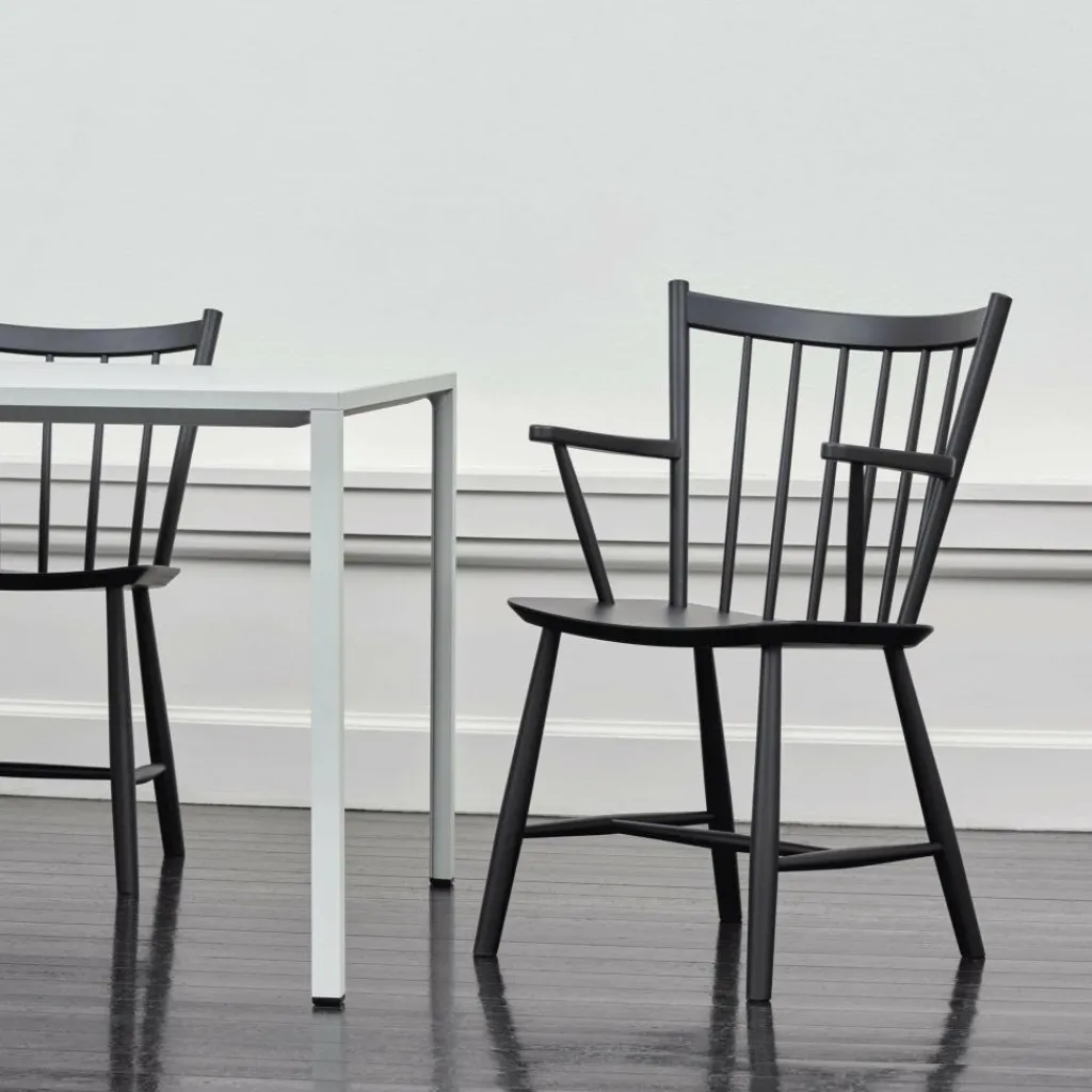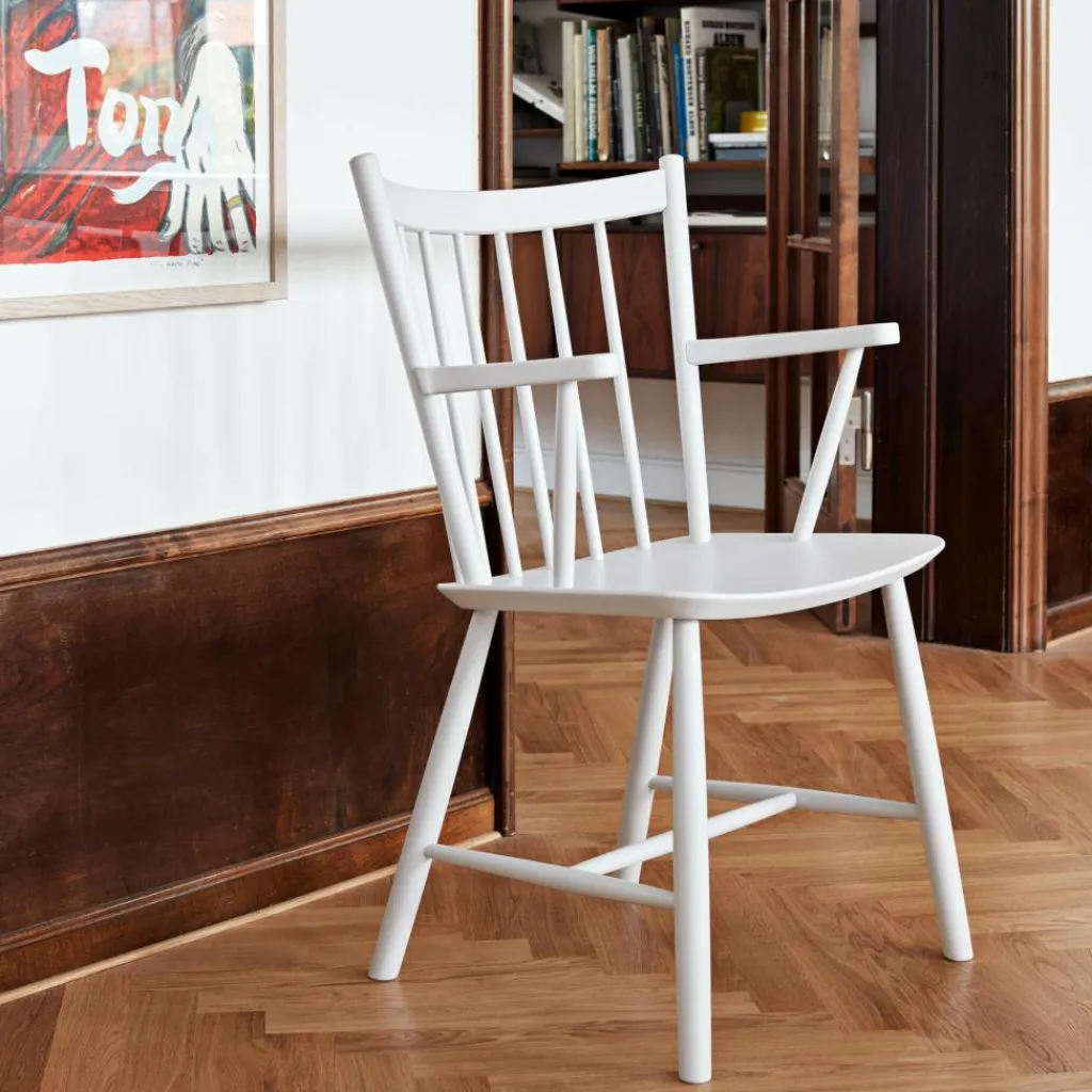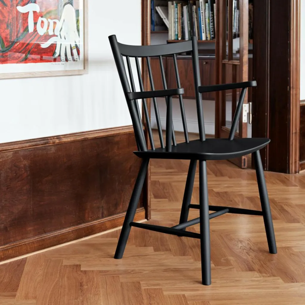 Seine großzügig gebogene Rückenlehne mit den locker angeordneten Spindelstäben bildet nicht nur einen attraktiven Blickfang im Raum. Zusammen mit der sanft gewölbten Sitzfläche verspricht sie auch ein bequemes Sitzgefühl. Für einen stabilen Stand sorgen die ausgestellten Stuhlbeine mit den zierlichen Verstrebungen. Gefertigt aus Buchenholz, das aus FSC®-zertifizierter Herstellung stammt und mit wasserbasiertem Lack beschichtet, ist der J42 Armlehnstuhl Buche zudem ein nachhaltiges Designstück. Es fügt sich gut in ein Ensemble von J-Stühlen ein, das sich formschön um einen Esstisch gruppiert, und kann genauso allein in der Wohnzimmerecke stehen. So passt der J42-Armlehnstuhl auch in die Lounge oder Lobby eines Hotels oder in den Pausenraum am Arbeitsplatz.