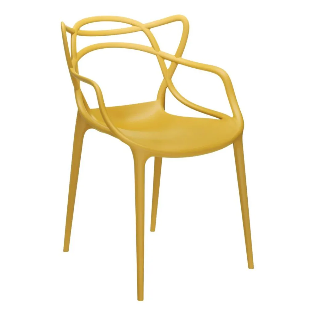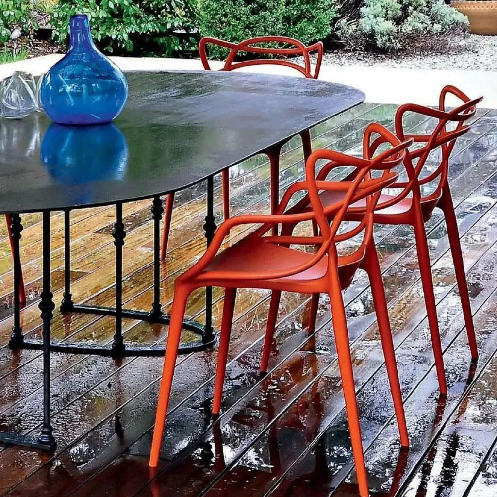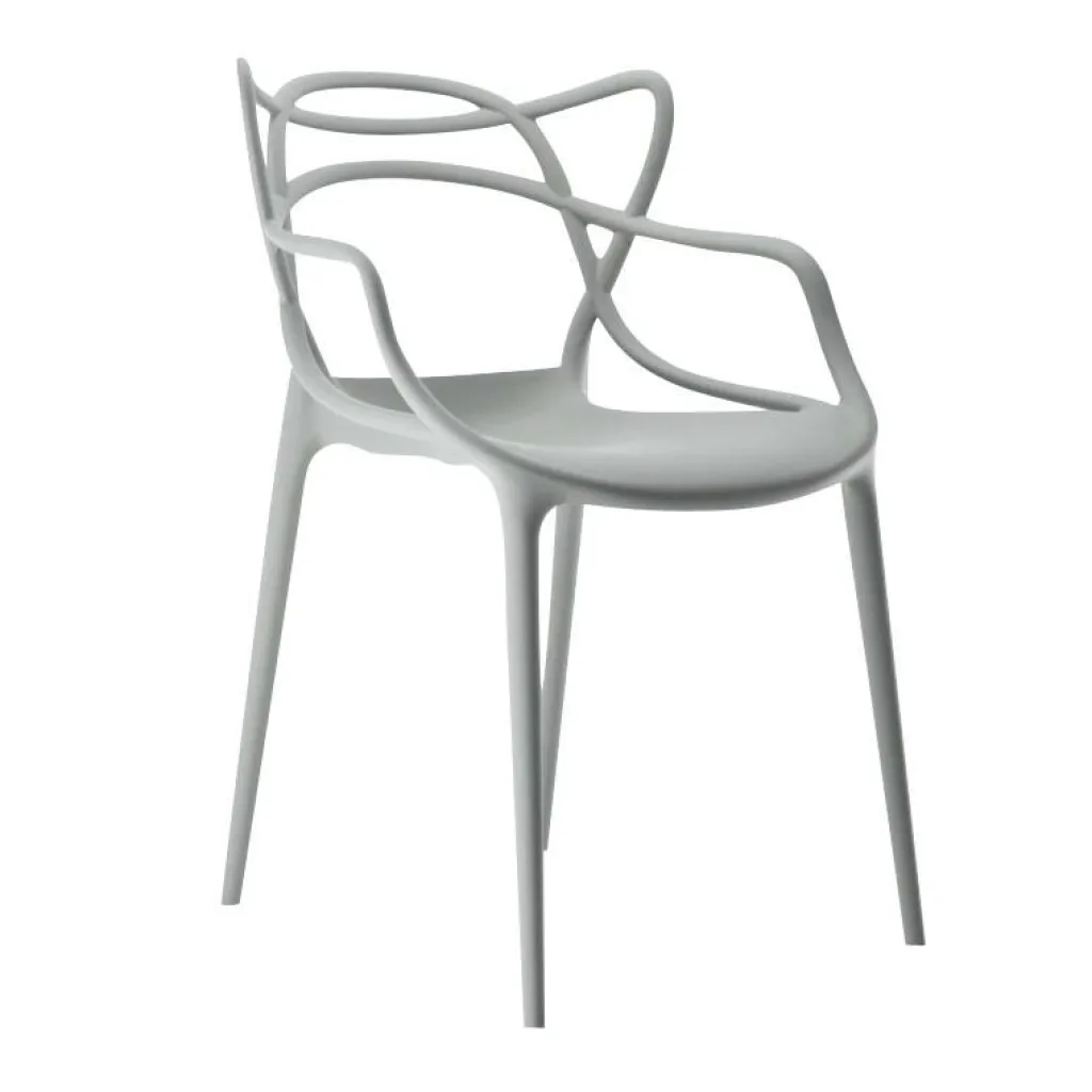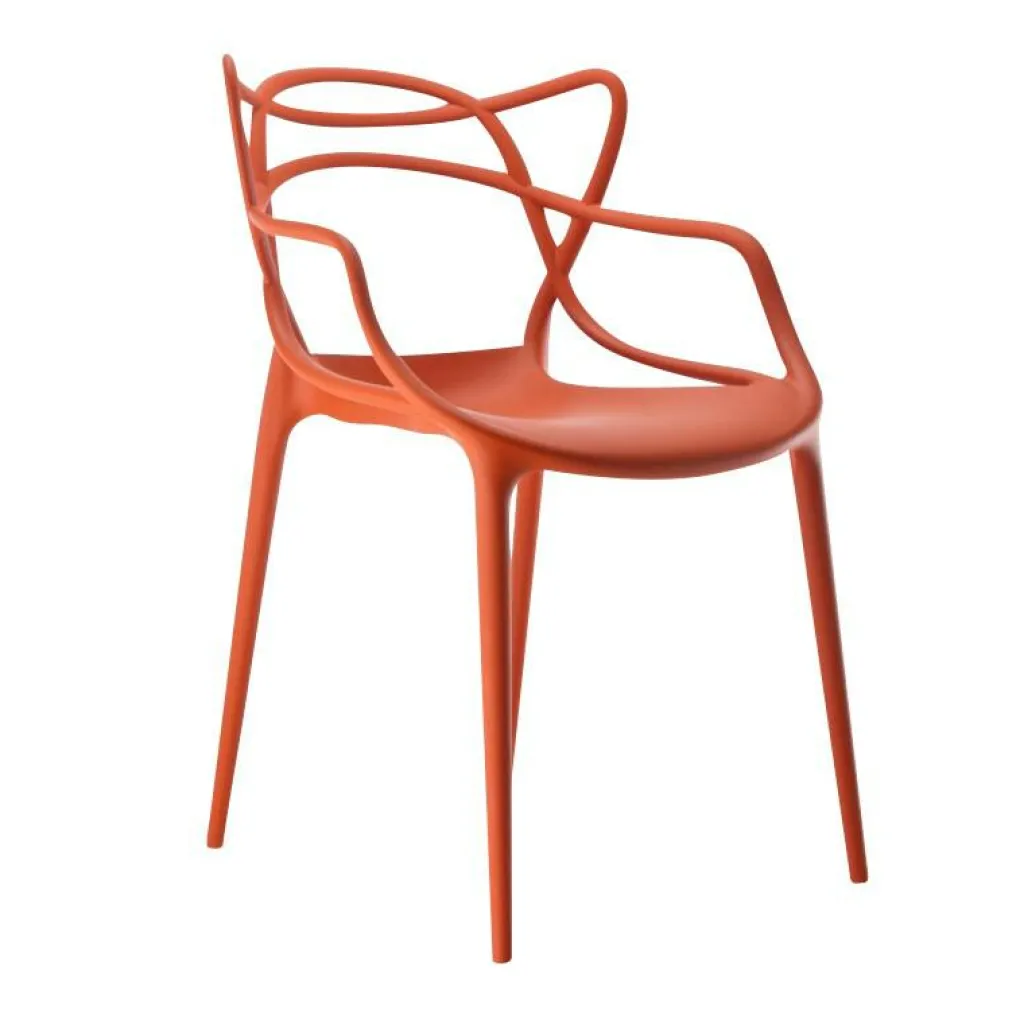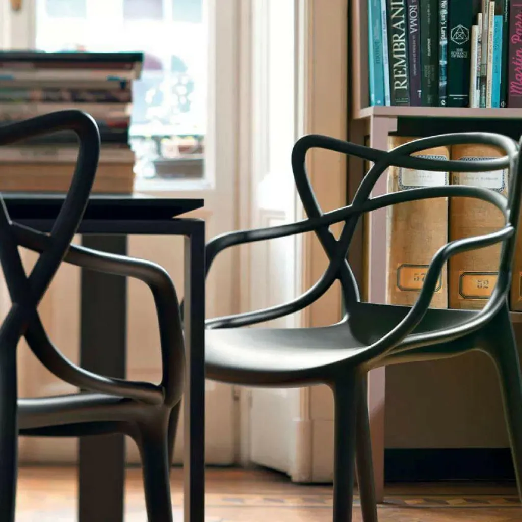 Zum Markenzeichen des Masters Armlehnstuhl wird die Rückenlehne: Sie besteht aus einem Geflecht an rund geformten Rohren. Sie verlängert sich an beiden Seiten in eine bequeme Armlehne. Innovativ ist nicht nur das Design des Stuhls, sondern auch das von den Designern verwendete Material. Sie entschieden sich für thermoplastisches Technopolymer, das aus recycelten Stoffen gewonnen wurde. Mineralische Zusatzstoffe und die Soft-Touch-Behandlung sorgen für ausgezeichnete Haptik. Der stapelbare Stuhl ist auch für den Außenbereich geeignet und hält einem Regenguss sicher Stand.