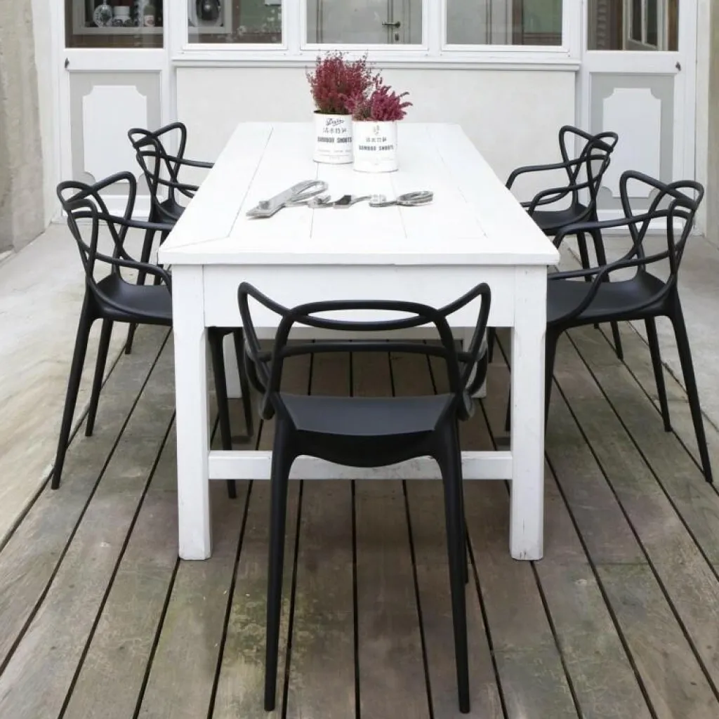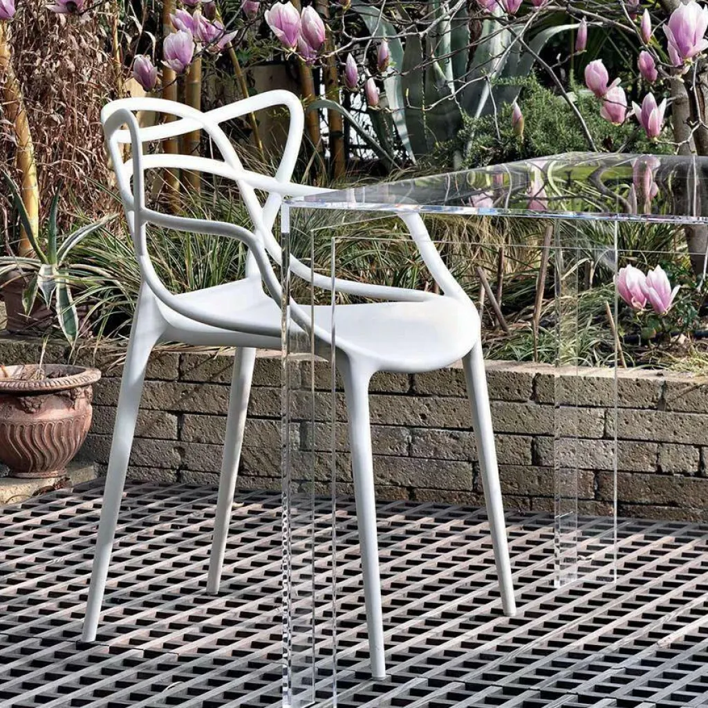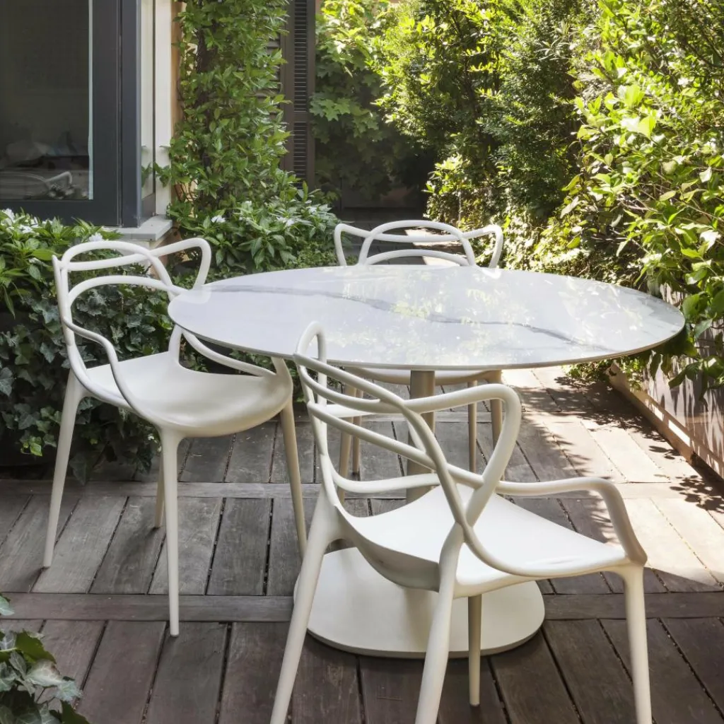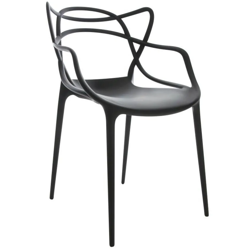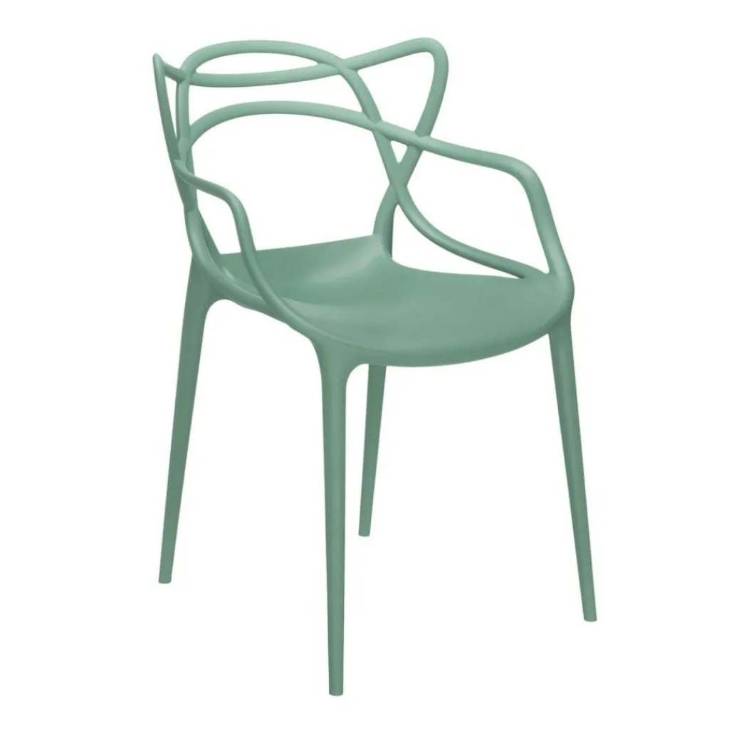 Zum Markenzeichen des Masters Armlehnstuhl wird die Rückenlehne: Sie besteht aus einem Geflecht an rund geformten Rohren. Sie verlängert sich an beiden Seiten in eine bequeme Armlehne. Innovativ ist nicht nur das Design des Stuhls, sondern auch das von den Designern verwendete Material. Sie entschieden sich für thermoplastisches Technopolymer, das aus recycelten Stoffen gewonnen wurde. Mineralische Zusatzstoffe und die Soft-Touch-Behandlung sorgen für ausgezeichnete Haptik. Der stapelbare Stuhl ist auch für den Außenbereich geeignet und hält einem Regenguss sicher Stand.