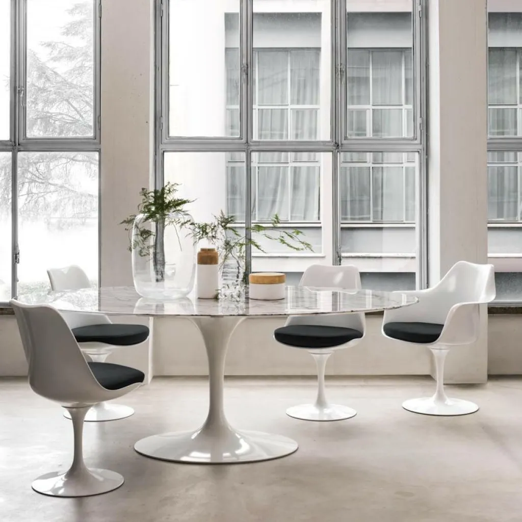 Mit dem Tulip Stuhl kreierte Saarinen in den 60er-Jahren erstmals einen Stuhl, bei dem Sitzschale und Standfuß eine optische Einheit bilden – innovativ und modern! Zudem harmoniert der puristische Tulip Stuhl perfekt mit dem Saarinen Tisch und ergibt zusammen ein wunderschönes Ensemble für jedes Esszimmer. Auch in Konferenzräumen bietet der Tulip Stuhl höchsten Sitzkomfort. Kein Wunder also, dass der Tulip Stuhl bereits mehrere Designpreise gewonnen und inzwischen zum absoluten Stuhl-Klassiker avanciert ist!