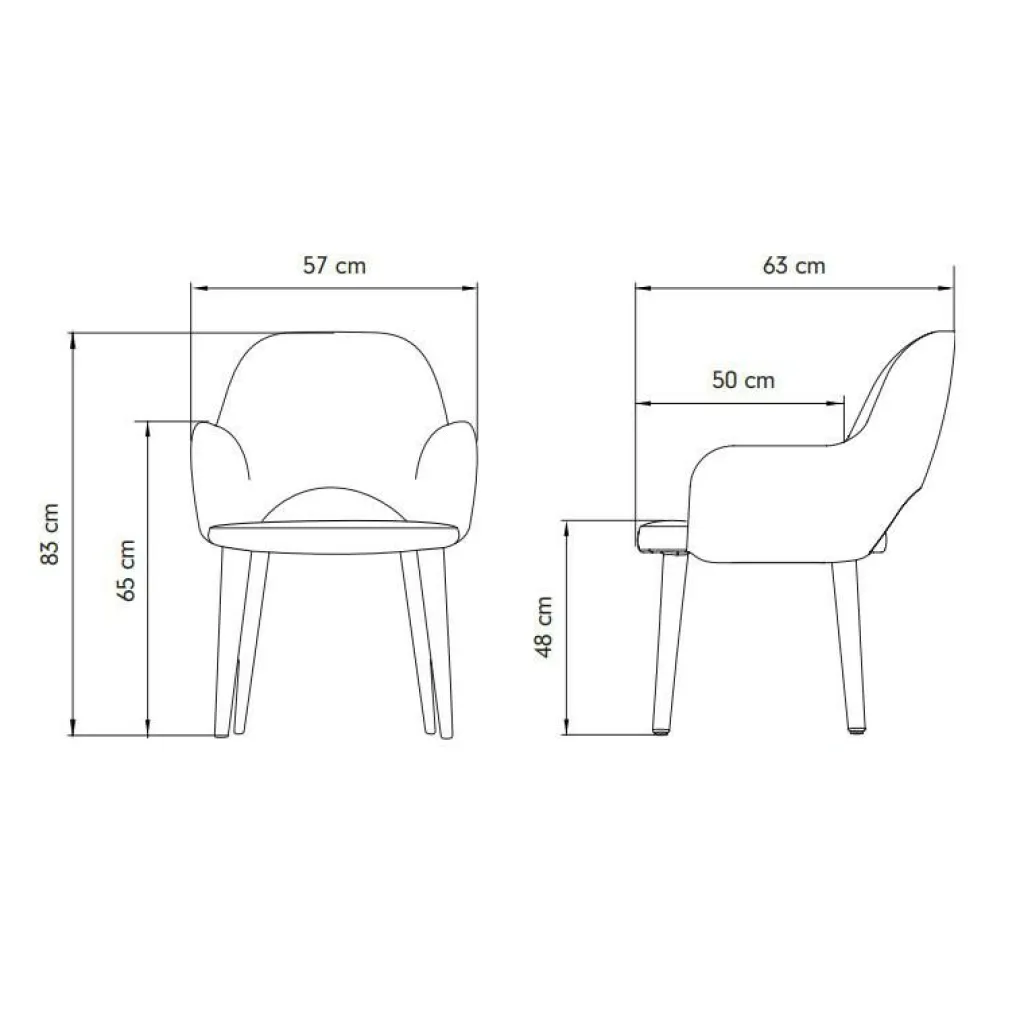 Bei einem Gewicht von 8,4kg ist das Möbelstück 57cm breit, 83cm hoch und 63cm tief. Die Sitzhöhe beträgt 48cm, während die leicht abgerundeten Oberkanten der Armlehnen auf einer Höhe von 65cm liegen.