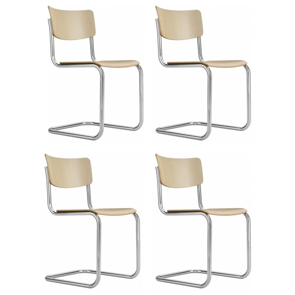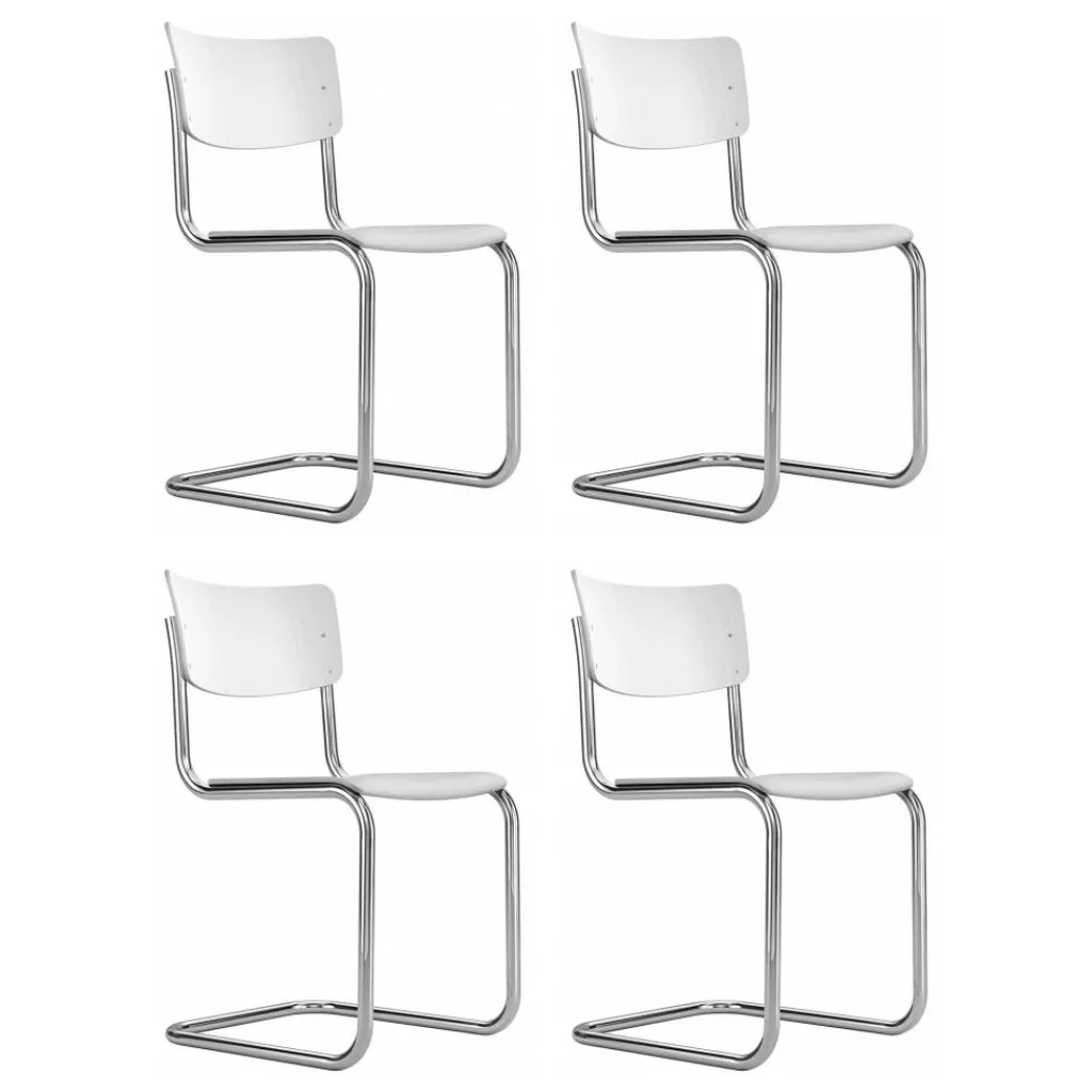 Das S 43 Freischwinger Stuhl 4er Set wurde von Mart Stam für die Marke Thonet entworfen. Der Stuhl ist ein perfektes Beispiel für den Stil der neuen Moderne, die unter andrem Freischwinger hervorbrachte.