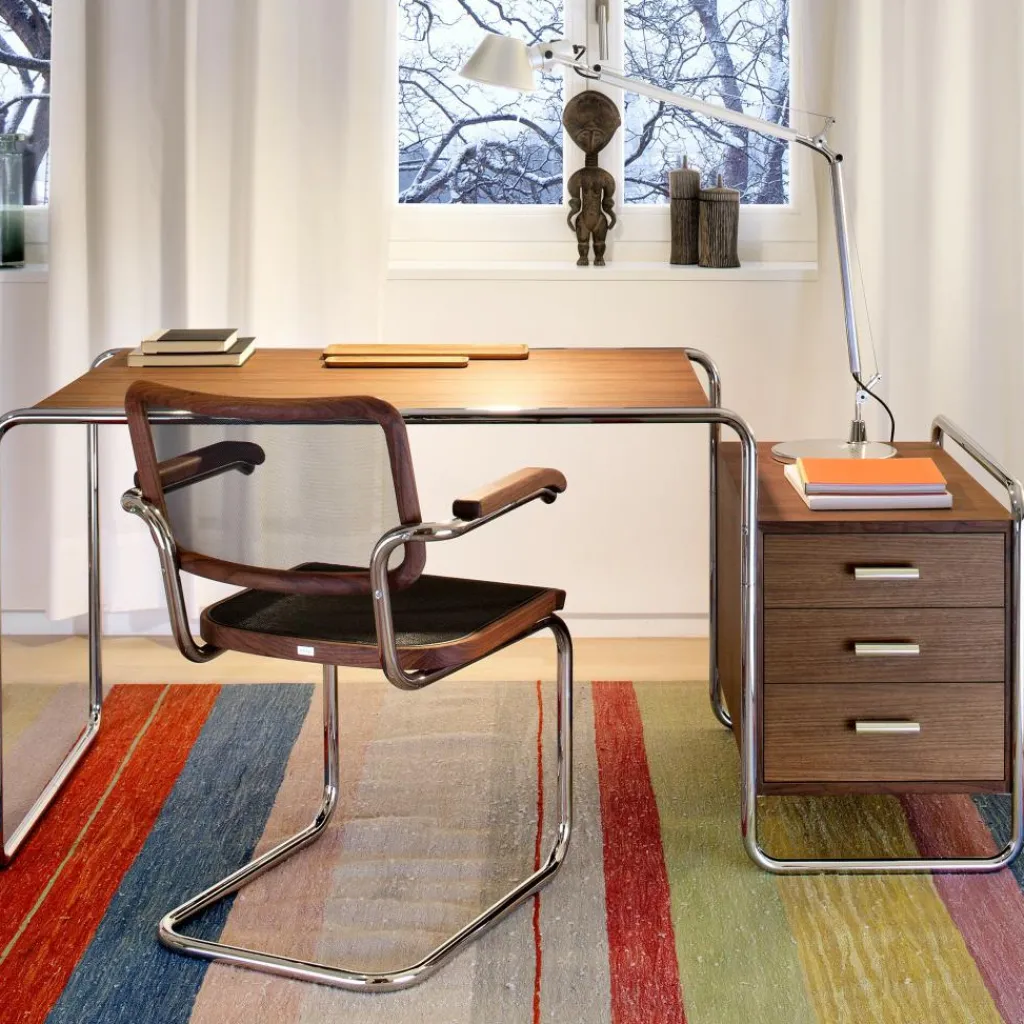 Der S 64 N Pure Materials Freischwinger Armlehnstuhl Nussbaum wurde von Marcel Breuer für die Marke Thonet entworfen. Formal neu, ästhetisch herausragend und funktional perfekt – der deutsch-amerikanische Designer entwarf in den 1920er Jahren diesen faszinierend eigenständigen Armlehnstuhl. Die Bezeichnung „Freischwinger“ steht für einen Stuhl, der nicht auf den üblichen vier Beinen steht. Das hinten offene, gebogene Untergestell sorgt dafür, das die belastete Sitzfläche leicht ins Schwingen gerät. Die bekannte Marke Thonet griff die Ideen Marcel Breuers auf und produziert dessen wegweisenden Entwurf seit über 80 Jahre nahezu unverändert.