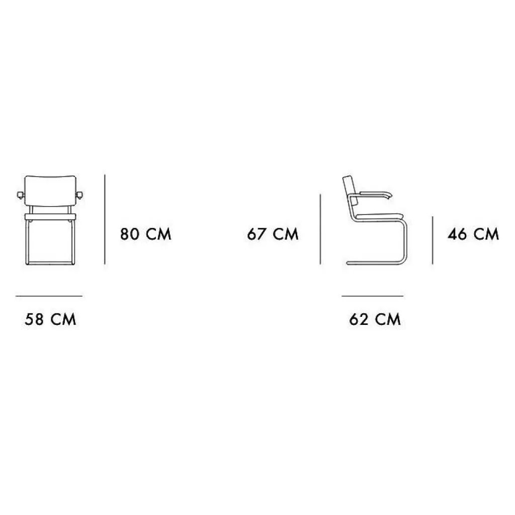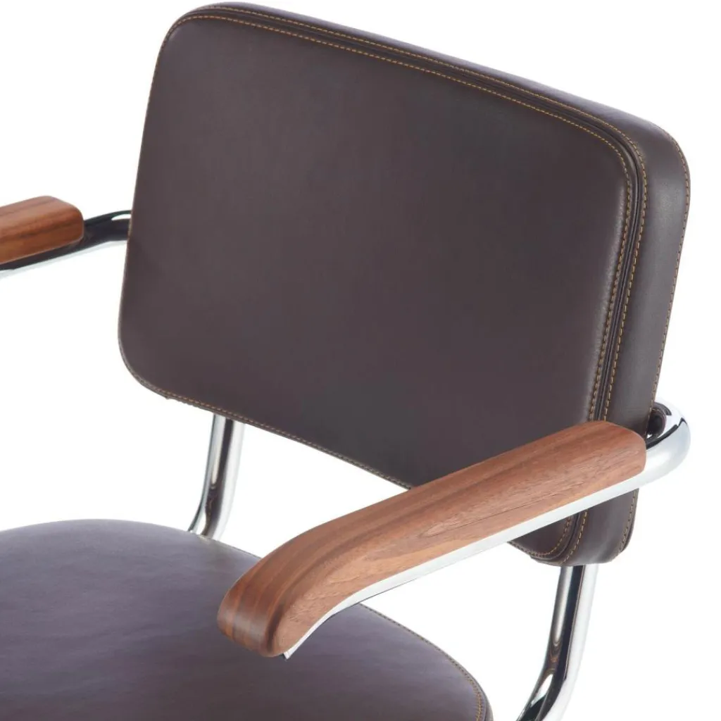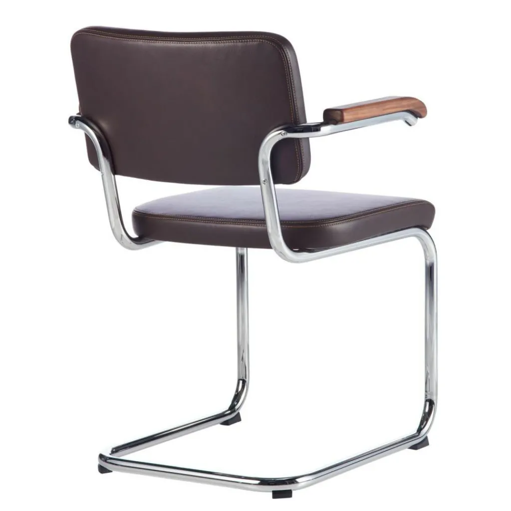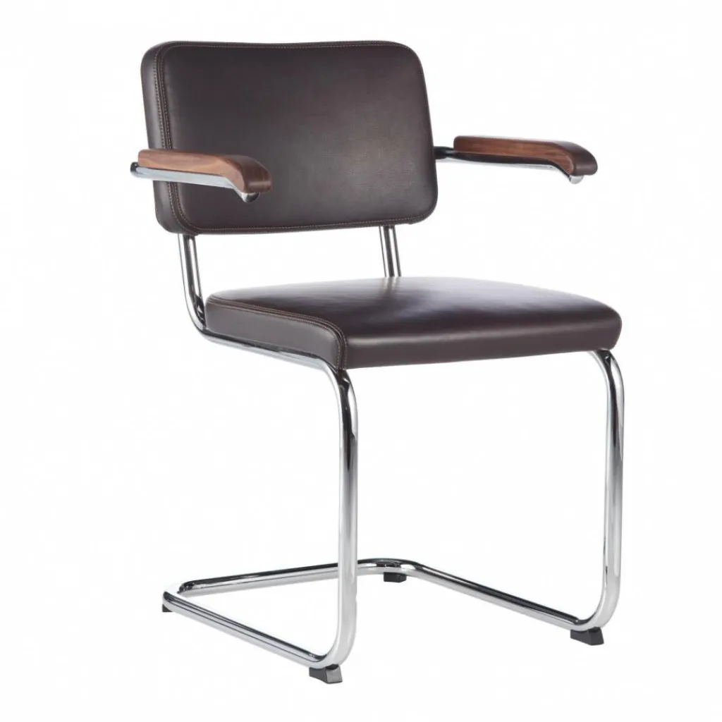 Der S 64 PV Pure Materials Freischwinger Armlehnstuhl verfügt über eine angenehme Sitzhöhe von 46 cm sowie eine Tiefe von 62 cm und bietet mit der gepolsterten Sitzfläche und der Rückenlehne aus Leder beste Qualität und einen ausgezeichneten Sitzkomfort. Die Armlehnen mit einer Höhe von 67 cm und den Auflagen aus edlem Holz betonen den Kontrast zum Gestell, das aus Stahlrohr gefertigt ist. Insgesamt hat der Freischwinger eine Breite von 58 cm und eine Höhe von 82 cm. Die Polsterung steht in mehreren Farbvarianten zur Verfügung.