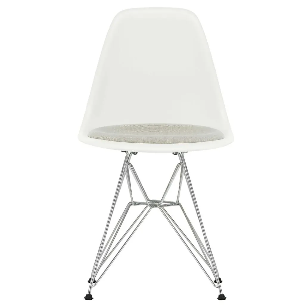 Der Eames Plastic Side Chair DSR gepolstert Gestell verchromt wurde von Charles Eames und Ray Eames für die Marke Vitra entworfen. Er ging als erster Stuhl mit einer Sitzschale aus Kunststoff in die Geschichte ein.