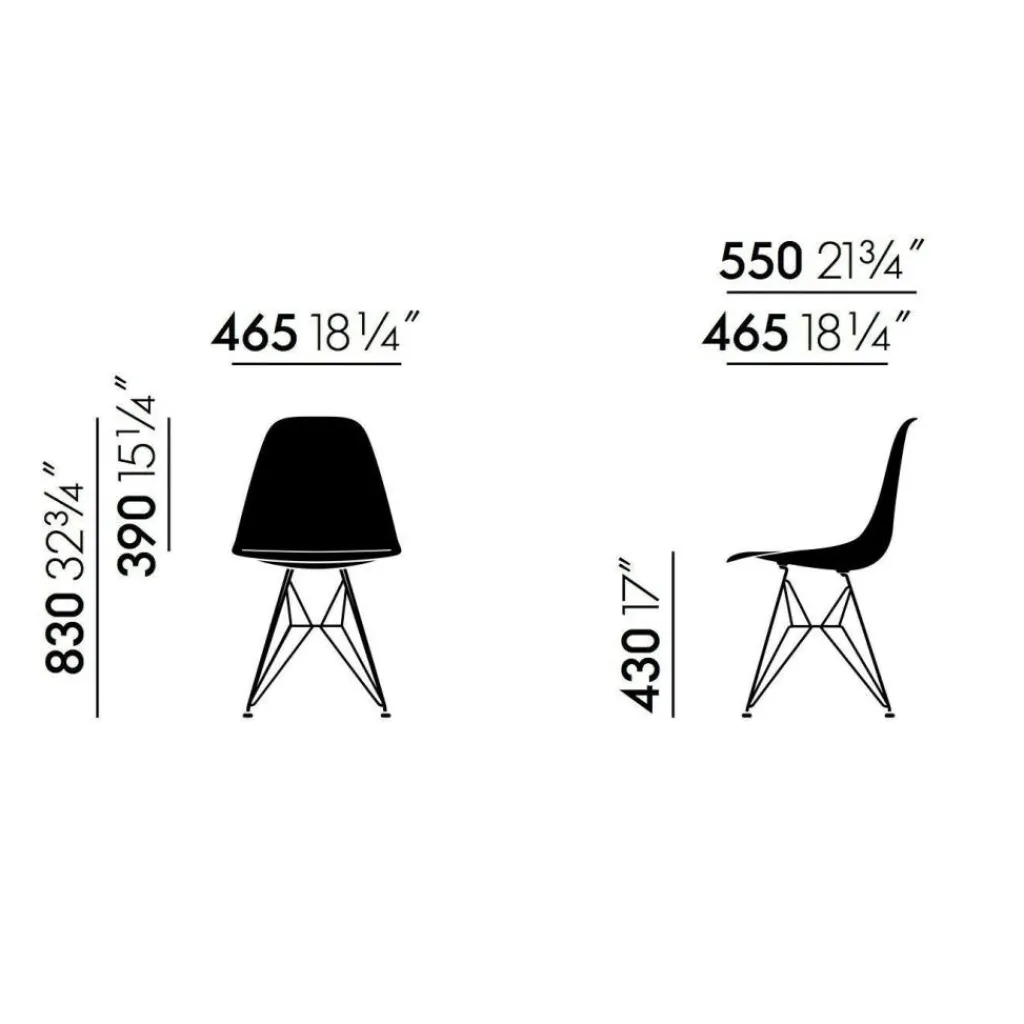 Der Eames Plastic Side Chair DSR RE Gestell dunkelgrün ist 46,5cm breit und 55cm tief. Er hat eine Sitzhöhe von 43cm. Die Gesamthöhe des Stuhls ist 83cm. Sein Gewicht beträgt 4,36kg. Sitzkissen passend zum Stuhl sind als Zubehör erhältlich. Weiters gibt es aus der Plastic-Chair-Reihe Modelle in anderen Farben und Materialkombinationen.