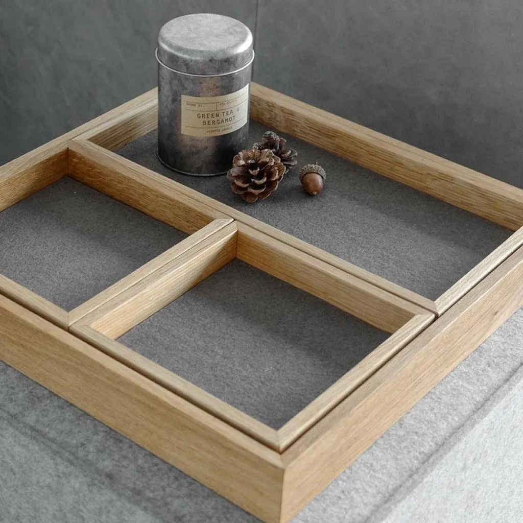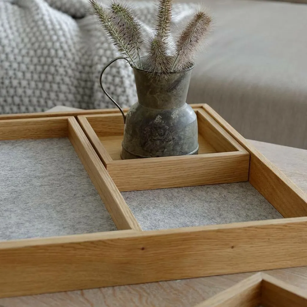 Tabletts in allen Größen, praktisch kombiniert und verstaut: dieses Tablett-Set ist nicht nur ein naturverwöhnter Haushaltsprofi, es eignet sich auch ganz wunderbar als Geschenk! In starker hochwertiger Eiche sind die Tabletts selbst gestaltet, und die hübsche Filzauflage ist in vielen harmonischen Farbtönen erhältlich, aus denen man je nach Belieben wählen kann. Die Maße des quadratischen Basis-Tabletts belaufen sich auf 37 Zentimeter Seitenlänge, die kleineren Tabletts ruhen wie Piroschka-Püppchen ineinander.