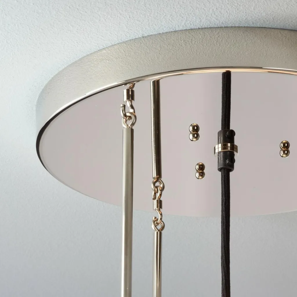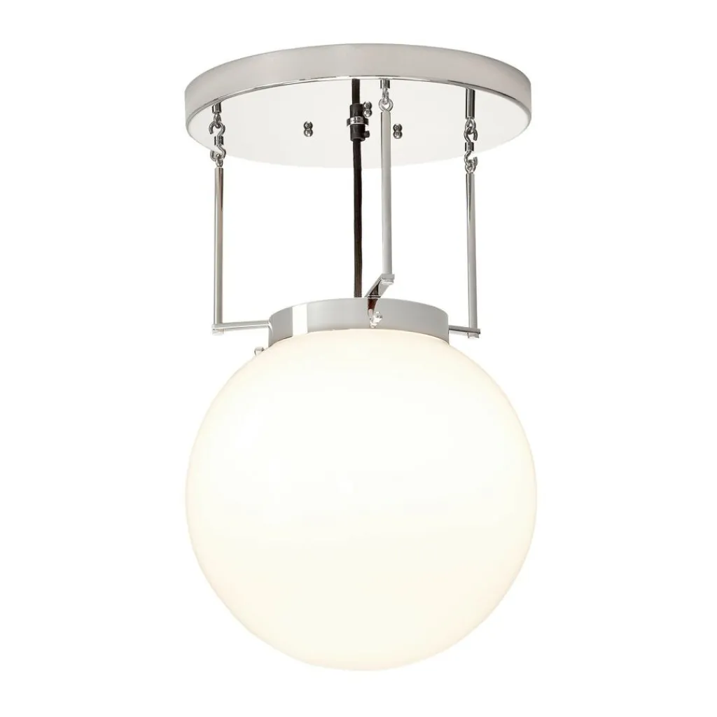 Die einfache Konstruktion der DMB 26 Deckenleuchte L zeigt die Ehrlichkeit der Designkonzepte aus der Bauhaus-Ära: Eine großzügige Kugel, verschraubt mit drei zierlichen, je 14 cm langen Stäben, die in eine kreisrunde Deckenscheibe eingehängt sind. Gleiche Durchmesser von Baldachin und Leuchtkörper schaffen dabei ein harmonisches Ganzes. Der Diffusor besteht aus mundgeblasenem Opalglas, das leichte Unregelmäßigkeiten und Lufteinschlüsse aufweist und der Designleuchte einen individuellen Charakter verleiht. Er schafft ein sanftes Licht, das sich gleichmäßig in alle Richtungen ausbreitet. Das vernickelte Metall als Halterung und Aufhängung des Leuchtenschirms kann mit der Zeit eine reizvolle Patina ansetzen und erhält mit einer Politur seinen silbrigen Glanz zurück.