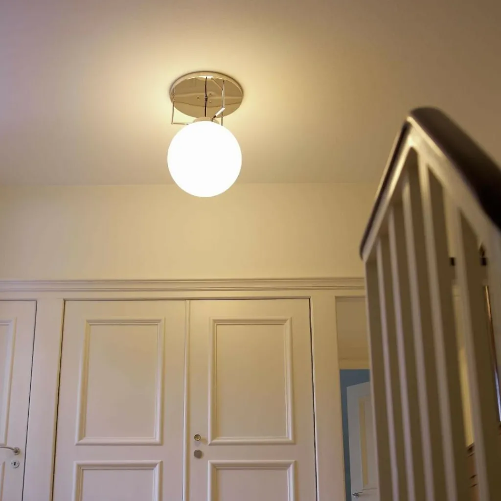 Ihre Opalglaskugel als Diffusor und die Aufhängung aus vernickeltem Metall machen die DMB 26 Deckenleuchte M zu einem harmonischen Designstück und zeigen ihre Ursprünge im Bauhaus. Der mundgeblasene Diffusor mit seinen Unebenheiten und Lufteinschlüssen verleiht der Deckenleuchte einen individuellen Charakter. Durch das milchige Glas strömt ein sanfter Lichtschimmer, der sich gleichmäßig nach allen Richtungen ausbreitet und mittels Dimmschalter variiert werden kann. Die DMB 26 Deckenleuchte M wird über einen kreisrunden Baldachin an der Decke befestigt. Darin werden die drei 14cm langen Metallstäbe eingehängt, die an der Halterung des Diffusors befestigt sind. So passt die DMB 26 Deckenleuchte M in repräsentative Büro- und Geschäftsräume genauso gut wie in einen gediegenen Wohnraum.