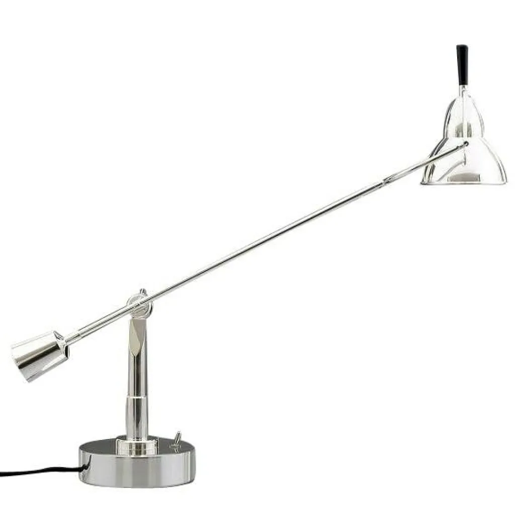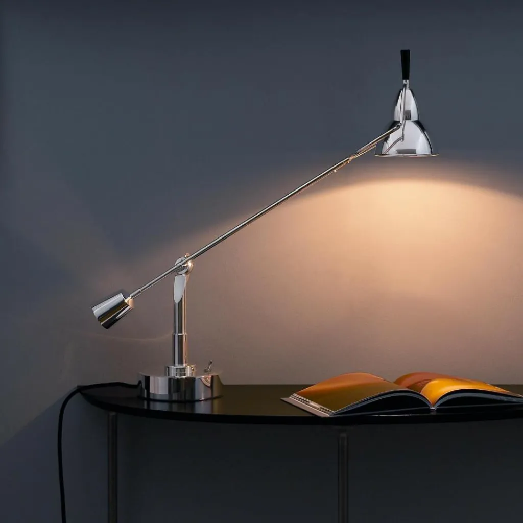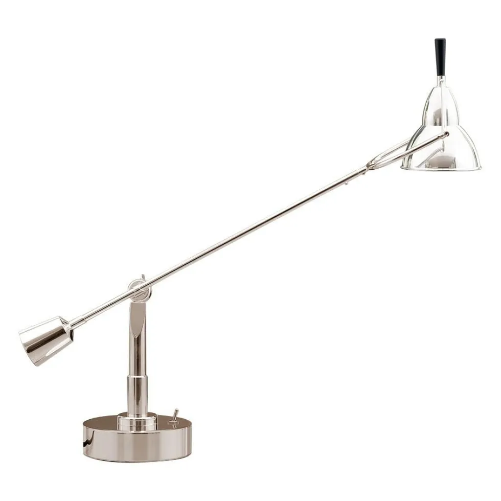 Jede EB 28 Buquet Tischleuchte ist fortlaufend nummeriert. Somit ist jedes Exemplar ein Unikat. Ganz nüchtern beschreibt Buquet seinen Entwurf im Patentantrag: Er spricht von einem ‚orientierbaren Beleuchtungskörper mit Gelenkarmen‘. Und tatsächlich erweist sich die EB 28 Buquet Tischleuchte als flexibel: Sie sieht ein wenig aus wie eine traditionelle Waage: Auf der einen Seite hält ein Gegengewicht den Arm, der zum Leuchtenschirm führt. Auch er lässt sich dank der verbauten Gelenke verstellen. Als Sockel dient ein Zylinder. Darauf befindet sich der Schalter.