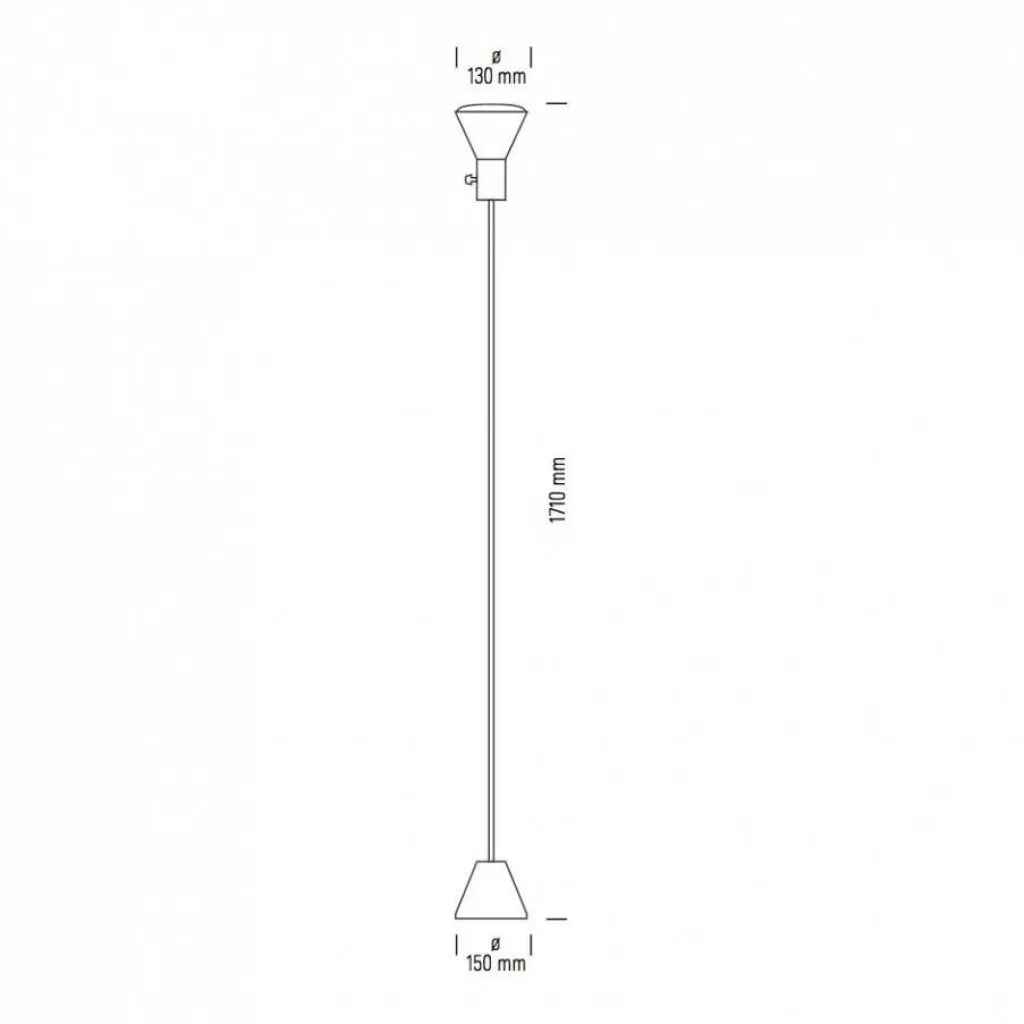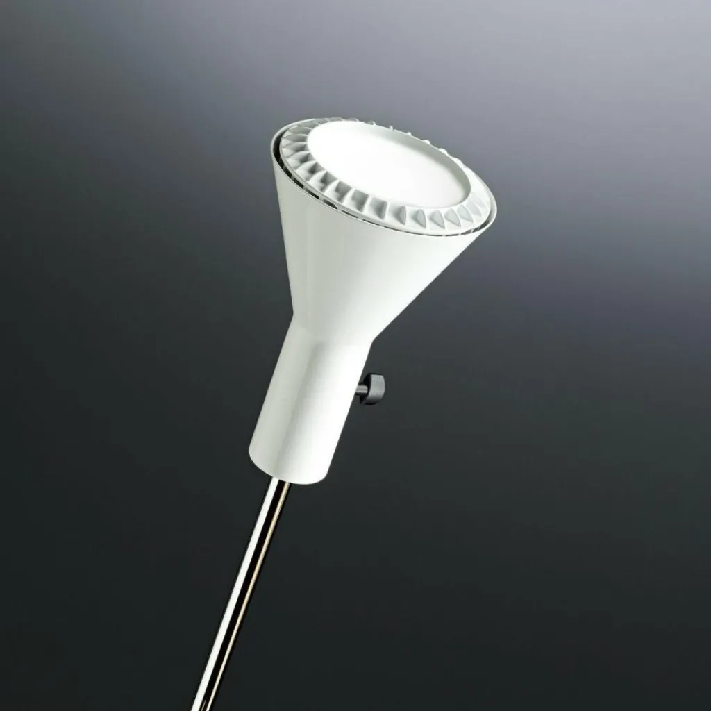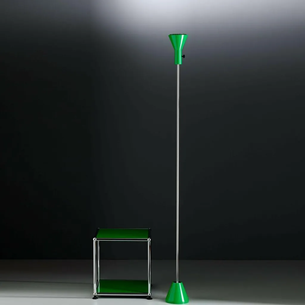 Mit ihrer Höhe von 171 cm kann diese Stehleuchte in jedem Raum zum Einsatz kommen. Die kegelförmige Gestalt von Schirm und Fuß verleiht der Leuchte auch im ausgeschalteten Zustand ein elegantes Aussehen. Der geringe Durchmesser des Lampenschirmes von 13 cm und des Lampenfußes von 15 cm bekräftigt das minimalistische Design. Lampenschirm und -fuß sind in den Farben Weiß, Schwarz, Rot und Grün erhältlich. Sie bilden damit einen Kontrast zur sonst unauffälligen Verarbeitung der Leuchte. Das Gestell besteht bei allen Varianten aus verchromtem Metall und untermauert das hochwertige Aussehen.