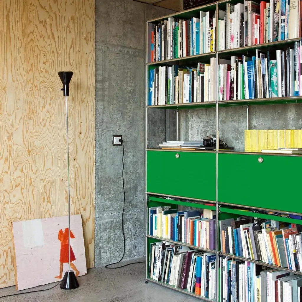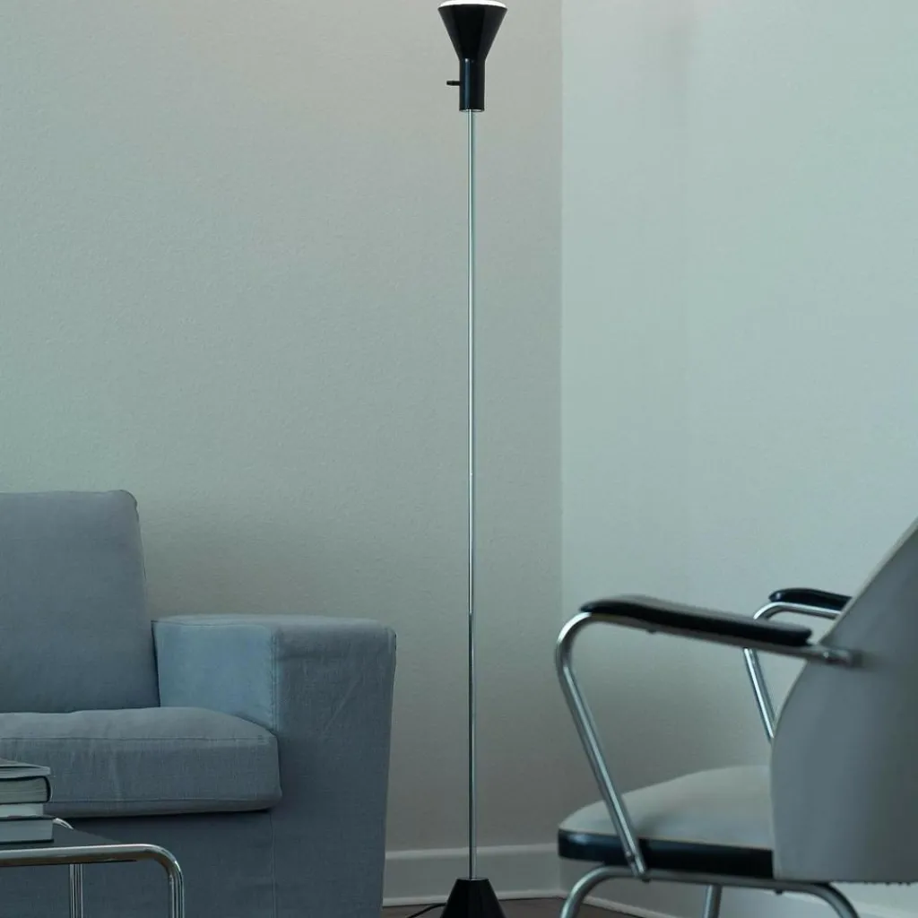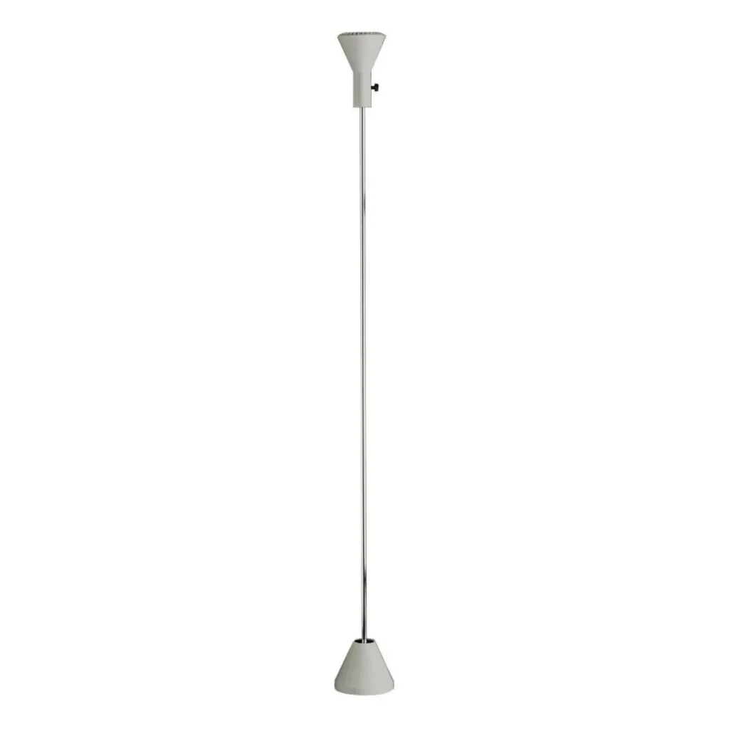 Mit ihrer Höhe von 171 cm kann diese Stehleuchte in jedem Raum zum Einsatz kommen. Die kegelförmige Gestalt von Schirm und Fuß verleiht der Leuchte auch im ausgeschalteten Zustand ein elegantes Aussehen. Der geringe Durchmesser des Lampenschirmes von 13 cm und des Lampenfußes von 15 cm bekräftigt das minimalistische Design. Lampenschirm und -fuß sind in den Farben Weiß, Schwarz, Rot und Grün erhältlich. Sie bilden damit einen Kontrast zur sonst unauffälligen Verarbeitung der Leuchte. Das Gestell besteht bei allen Varianten aus verchromtem Metall und untermauert das hochwertige Aussehen.