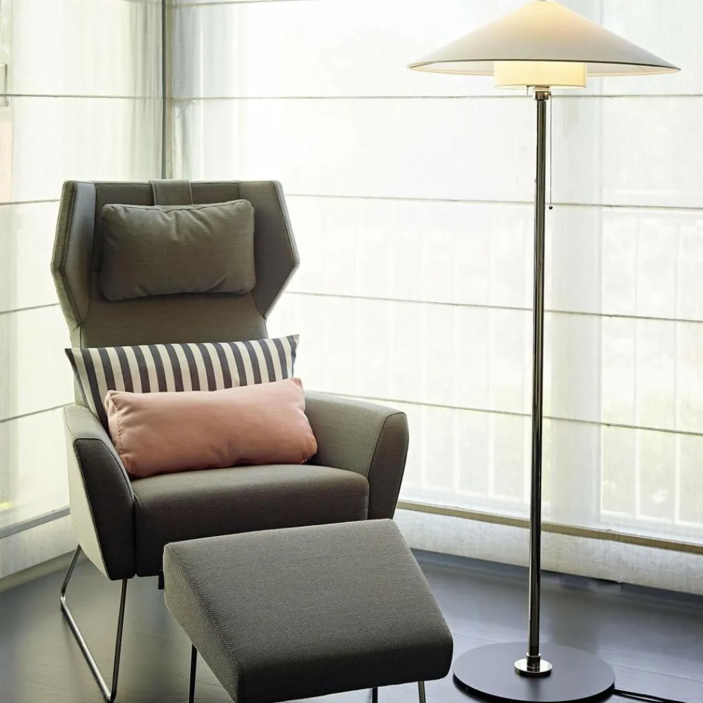Die WSTL 30 Wagenfeld Stehleuchte hat ein Gewicht von 7,5kg. Das Modell wird mit einem Zugschalter bedient, der aus einem Seil und einer kleinen Metallkugel besteht. Die Leuchte hat eine Höhe von 157cm. Der Durchmesser des Fußes beträgt 36cm. Das Kabel ist 250cm lang. Der Leuchtenschirm hat einen Durchmesser von 60cm. Im gleichen Stil ist eine elegante Tischleuchte erhältlich. Jede Leuchte ist fortlaufend nummeriert und trägt das Signet TECNOLUMEN.