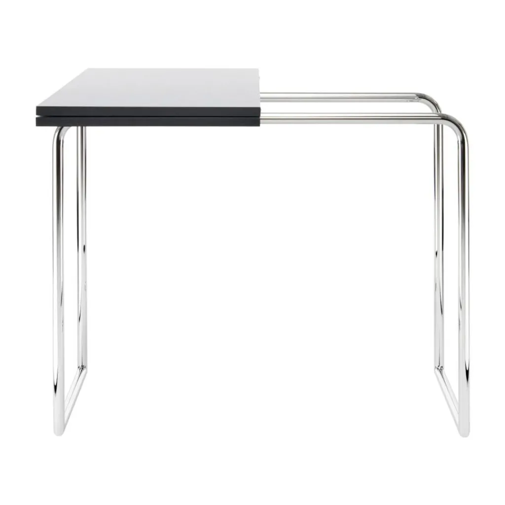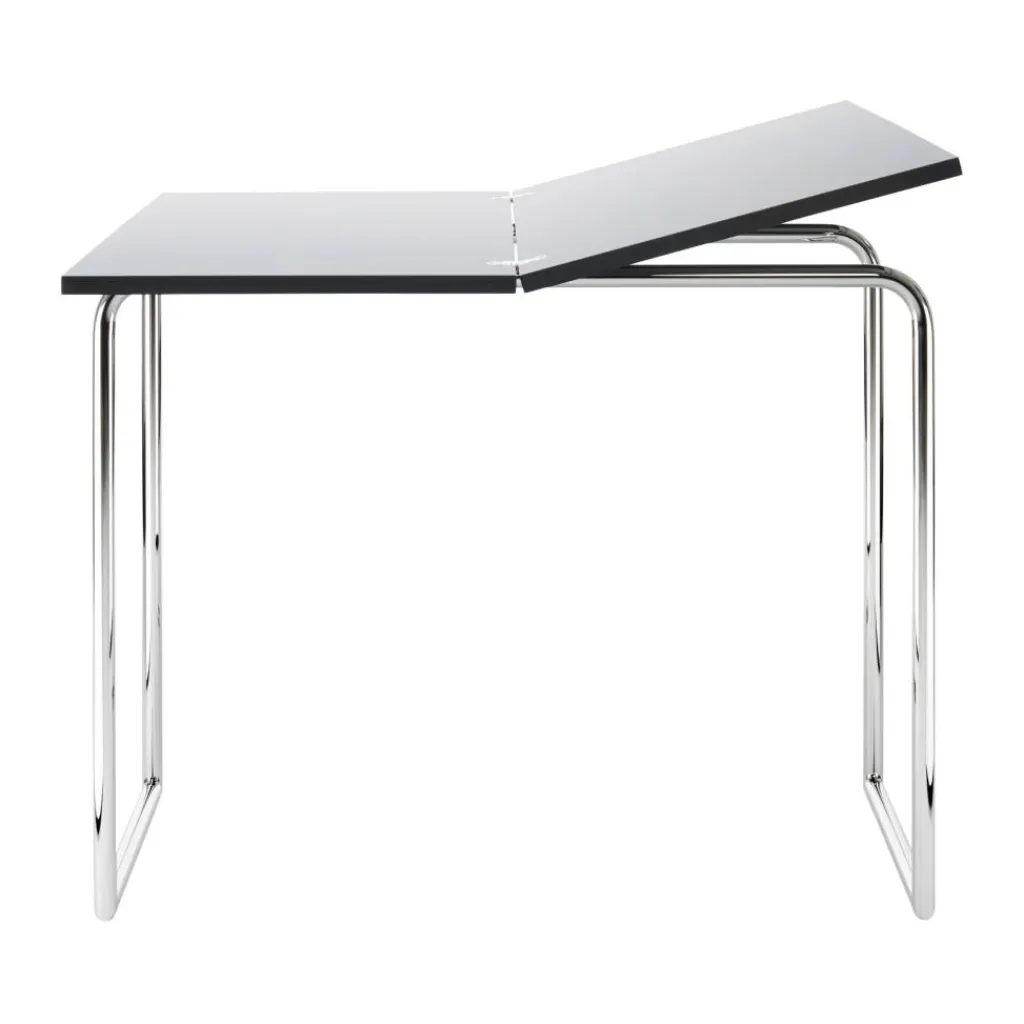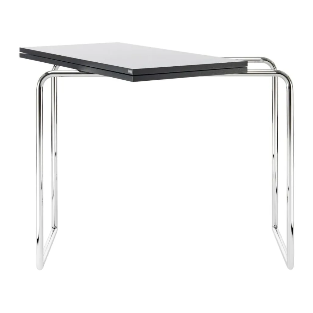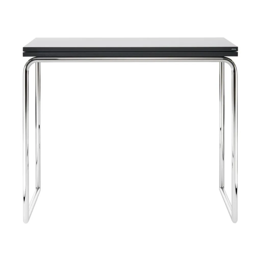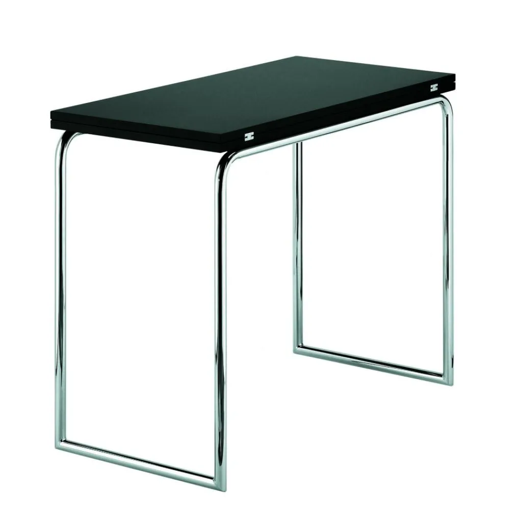 Ein funktionales Design und vielseitige Verwendbarkeit kennzeichnen den B 109 Konsolentisch klappbar. Zusammengeklappt steht er platzsparend an der Wand. Bei Bedarf faltet man die Platte auseinander, dreht sie um 90 Grad und fixiert sie anschließend an der Unterseite. Dann wird aus dem Konsolentisch eine großzügige Arbeitsfläche mit zwei gegenüberliegenden Plätzen. Das Gestell aus Stahlrohr ist typisch für die Marke. Es besteht aus nur einem Stück, das raffiniert gebogen ist, sodass es dem B 109 Konsolentisch klappbar maximale Standfestigkeit verleiht. Daneben bietet die auffällig dünne Tischplatte aus MDF nicht nur eine robuste Unterlage, sie verspricht auch viel Beinfreiheit beim Sitzen. Der B 109 Konsolentisch klappbar passt ideal ins Wohn- oder Esszimmer, macht sich aber auch gut als Ablage im Arbeitszimmer oder Büro.