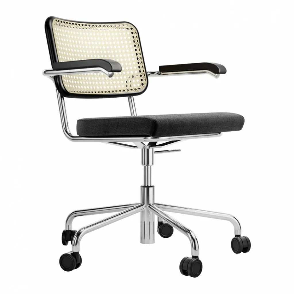 Ein fünfarmiger Fuß sichert dem S 64 SPVDR Bürostuhl maximale Standfestigkeit. Für die perfekte Navigation am Arbeitsplatz sorgen weiche Rollen. Sie sind für alle Böden geeignet. Einen spannenden Kontrast zu dem nüchternen Metallgestell ist die Rückenlehne: Sie ist aus verspieltem Wiener Geflecht gefertigt. Die Sitzfläche hingegen besteht aus robustem Formsperrholz mit Polsterung und Stoffbezug. Das Modell beweist, wie elegant Büromöbel sein können. Der Klassiker eignet sich sowohl für das Büro als auch für das Homeoffice. Er sieht nicht nur gut aus, sondern überzeugt außerdem mit höchstem Sitzkomfort.