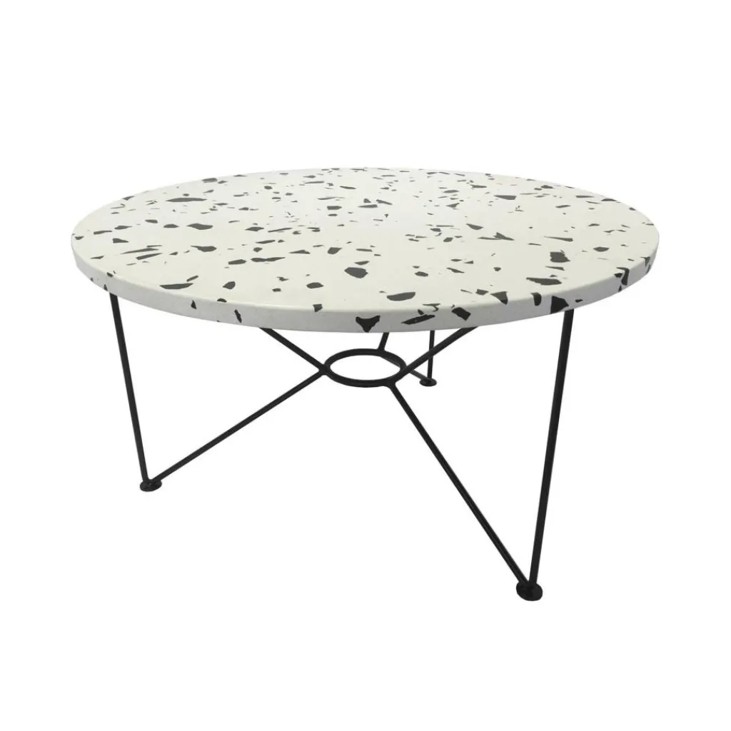Der The Low Table Beistelltisch Terrazzo Ø65cm ist ein praktisches Möbelstück, das in jedem Raum zur Stilikone wird. Unverwechselbar macht den schlichten Tisch ein in das Gestell integrierter Ring. Er führt die Tischbeine elegant zusammen. Von der Seite betrachtet, wirkt das Unterteil des The Low Table Beistelltisches Terrazzo Ø65cm wie ein stilisierter Schmetterling. Die Designerin verwendet bewährte Materialien: Das Gestell besteht aus pulverbeschichtetem und galvanisiertem Stahl. Für die runde Tischplatte hat sie sich für Terrazzo entschieden. Dabei handelt es sich um ein modernes und robustes Material, das aus Betonwerkstein besteht. Die strapazierfähige Oberfläche ist unempfindlich gegen Nässe. Daher ist der The Low Table Beistelltisch Terrazzo Ø65cm perfekt für den Garten, die Terrasse oder den Balkon geeignet.