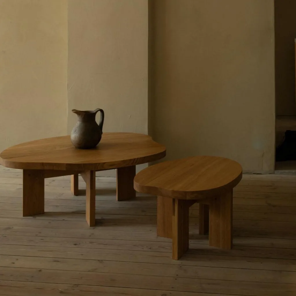 Die unregelmäßige, natürliche wirkende Form der Tischfläche erweckt die Assoziation mit einem kleinen Teich, dessen glatte Oberfläche das Gefühl idyllischer Ruhe weckt. Gleichzeitig begeistert die geölte Holzoberfläche mit einer angenehm weichen Haptik. Zudem schenkt die dicke Platte dem Farmhouse Beistelltisch eine hohe Robustheit, während das kreuzförmig angeordnete Gestell mit seinen breiten, zu flachen Halbrahmen verbundenen Holzlatten eine belastbare Stabilität verspricht. Gefertigt aus massivem Eichenholz besticht der Farmhouse Beistelltisch mit seinen zartgemaserten Oberflächen. Somit ist jedes Exemplar ein Unikat, das einen attraktiven Blickfang schafft: in der Lounge oder Lobby eines ländlichen Hotels sowie in einer urigen Bar und im Wartezimmer einer Praxis. Im privaten Zuhause passt der Farmhouse Beistelltisch zwischen gemütliche Sitzmöbel oder neben kann neben dem Bett als Nachttisch verwendet werden.