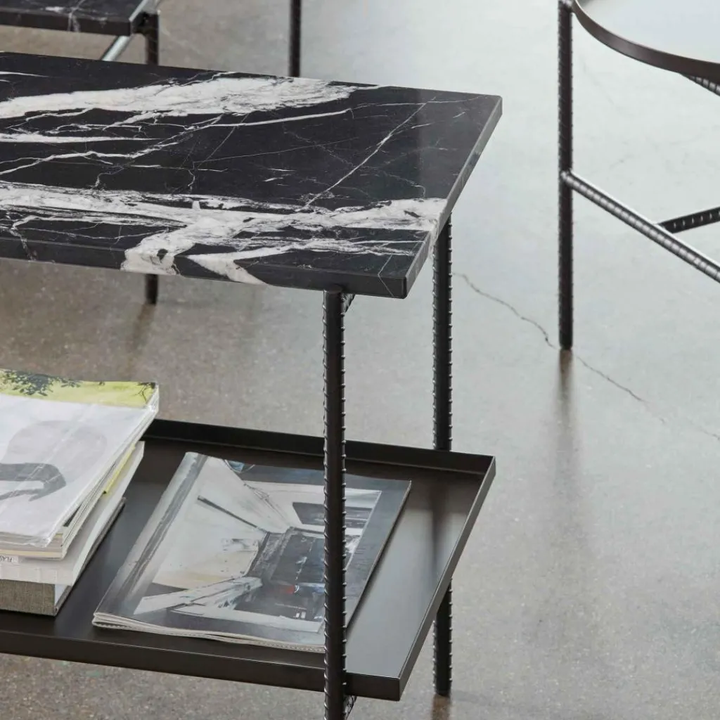 Stahlstangen, Marmorplatten und Metallschalen sind die Grundelemente dieses Designtisches, der sich je nach gewählter Ausführung dezent in seine Umgebung einfügt oder einen Blickfang schafft. Dabei sticht in jedem Fall das Tischgestell ins Auge. Dieses ist aus Stahlstangen gefertigt, die als Bewehrungsstahl von Baustellen bekannt sind. Deren gerippte Oberfläche schafft einen attraktiven Kontrast zu den glatten Flächen der Marmor-Tischplatte sowie des metallenen Einlegebodens. Die Maserung des Steins verleiht dem Möbel einen natürlichen Touch. Und die geräumige Metallschale mit ihren erhöhten Kanten besticht mit ihrem funktionalen Charakter. Damit passt der Rebar Beistelltisch 75x44cm ins Wohn- oder Esszimmer, wo er Snacks und Drinks aufnehmen kann oder als Anrichte dient. Neben der Couch nutzt er zum Ablegen von Zeitschriften und Büchern, im modernen Homeoffice für Akten.