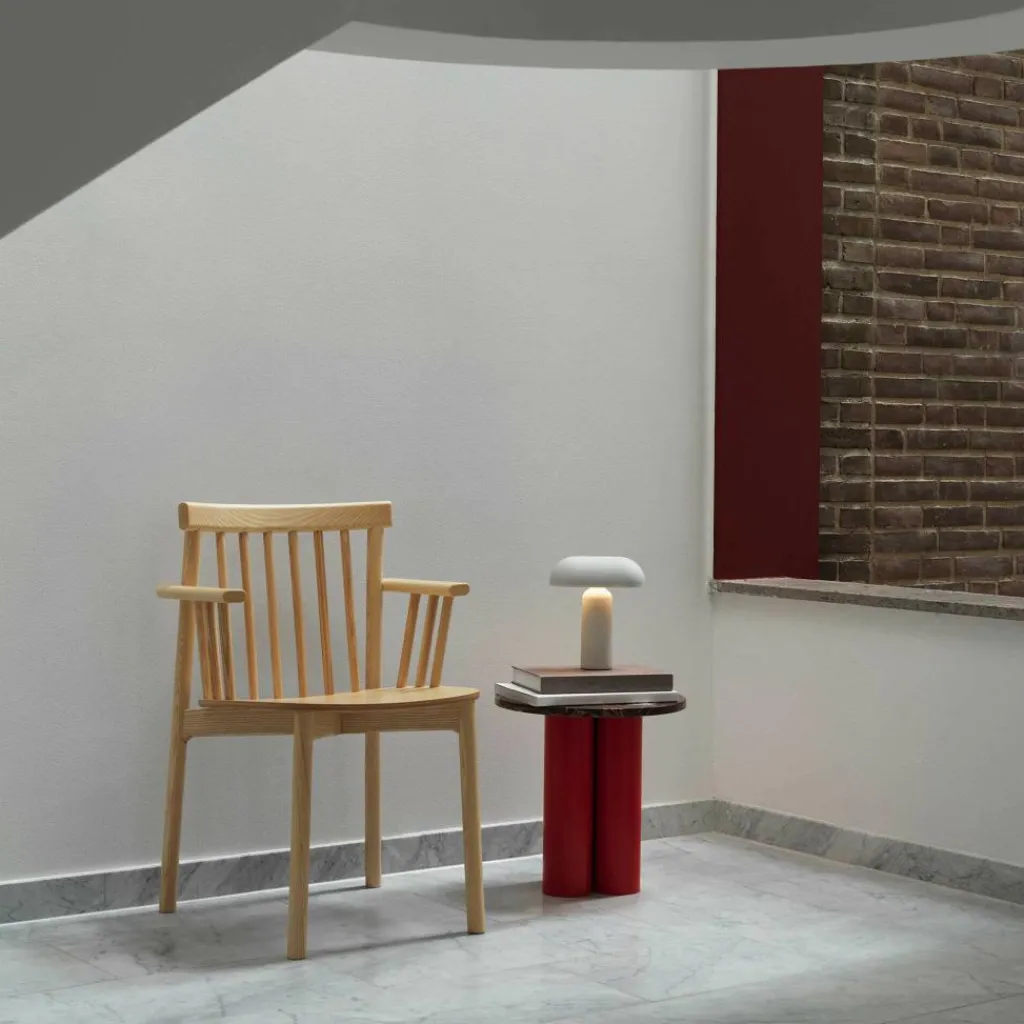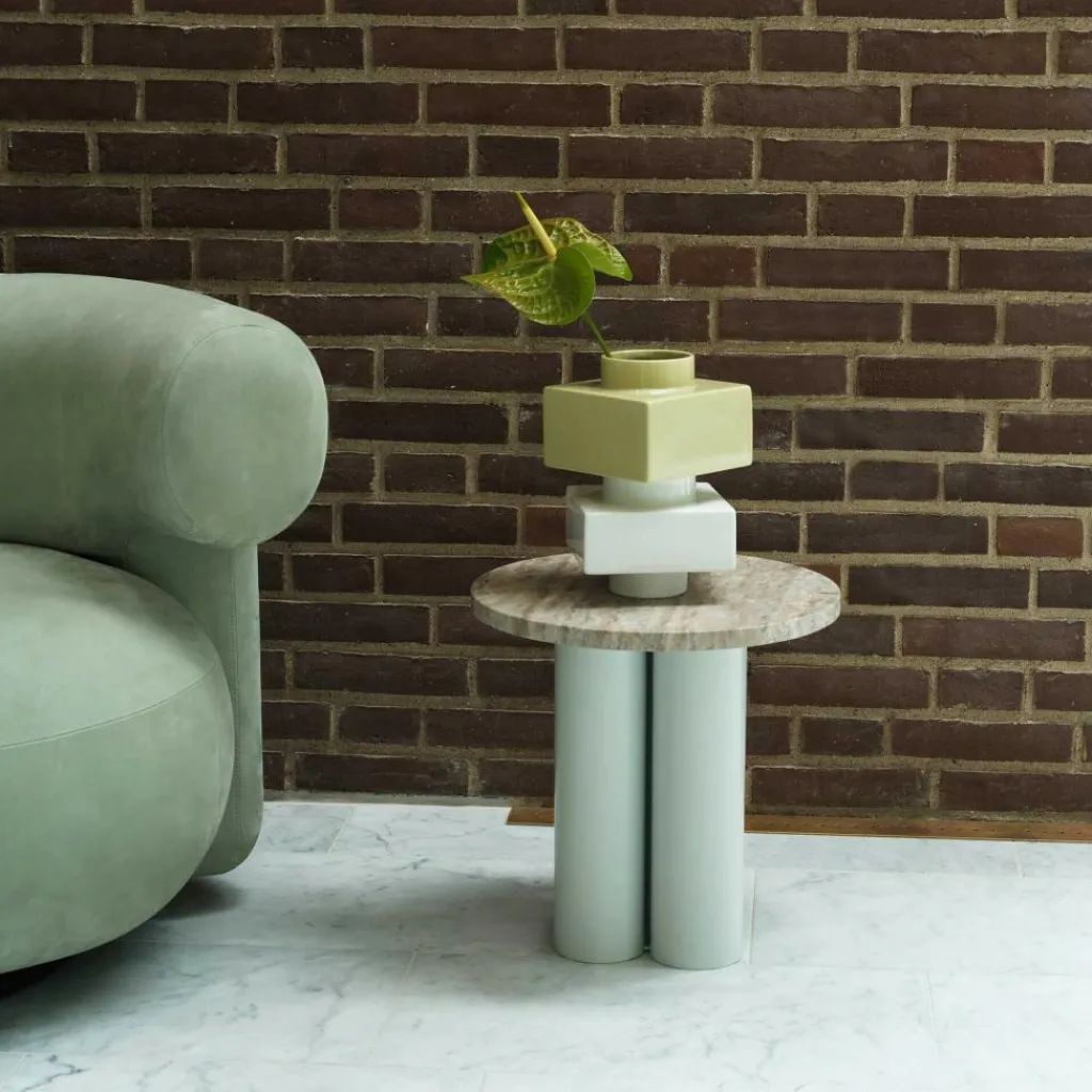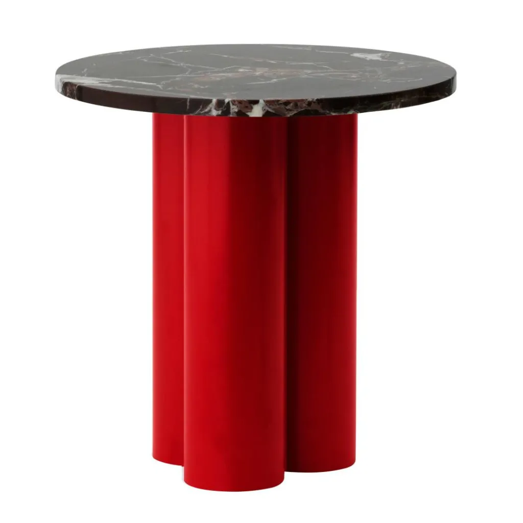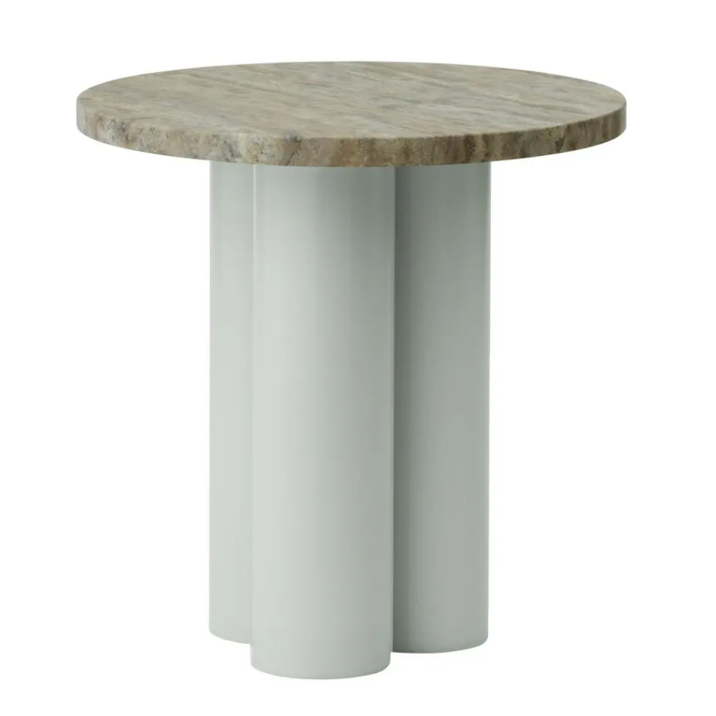 Mit ausdrucksstarken geometrischen Formen spielt der Dit Beistelltisch. Das schlichte Gestell ist aus drei dicken zylinderförmigen Stahlbeinen zusammengesetzt. Eine Pulverbeschichtung macht die Oberfläche robust. Die aus Stein gefertigte Tischplatte bildet einen ansprechenden Kontrast zum Metallgestell. Es gibt Varianten aus Travertin- oder Rosso-Levanto-Stein. Da die Oberfläche eine faszinierende Maserung aufweist, ist jeder Dit Beistelltisch ein Unikat. Schmutz und Staub werden mit einem feuchten Tuch von der Tischplatte entfernt. PH-neutrale Reinigungsmittel können ebenso verwendet werden.