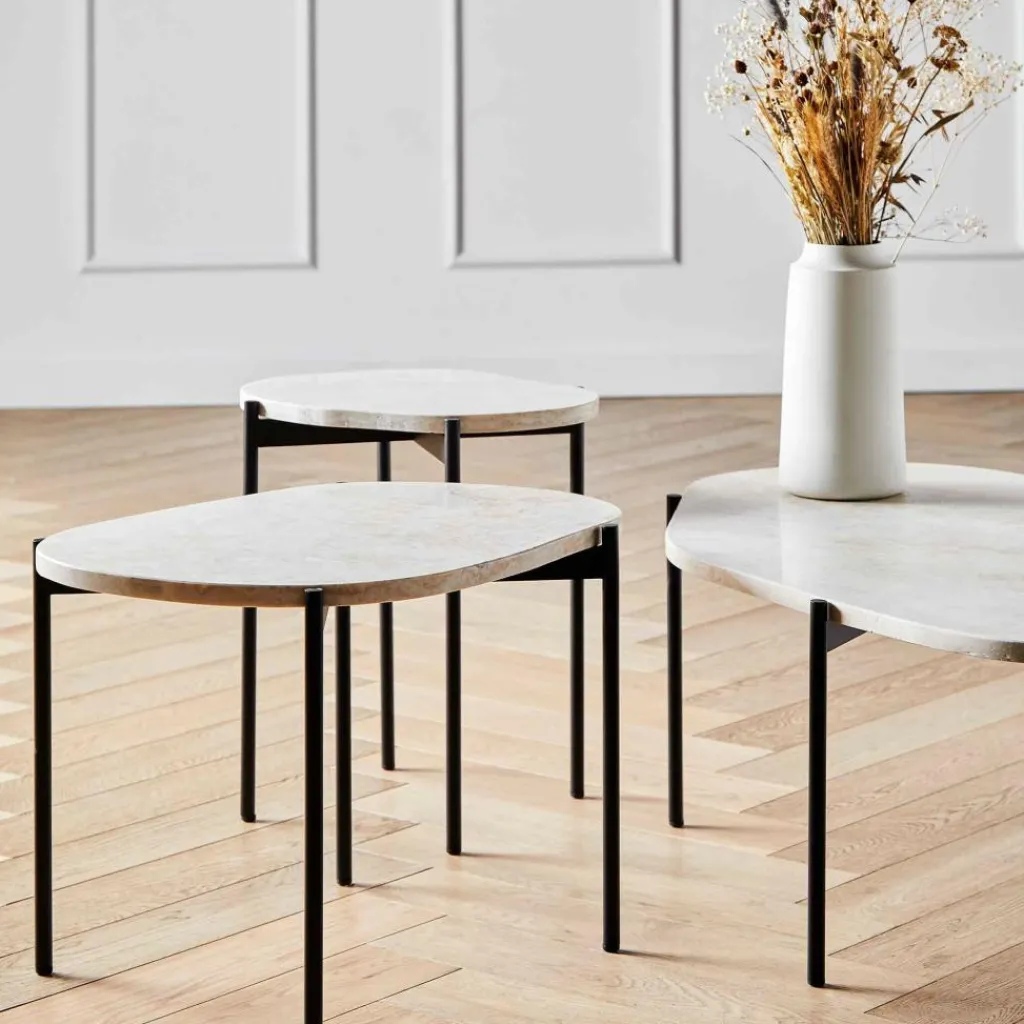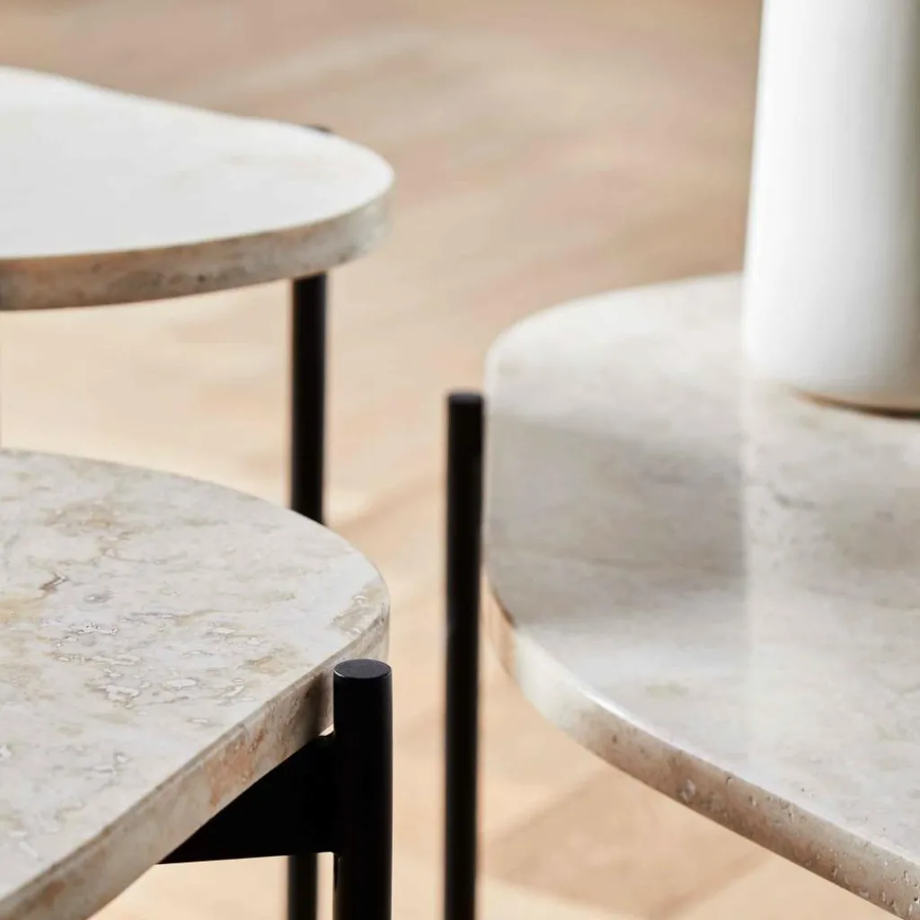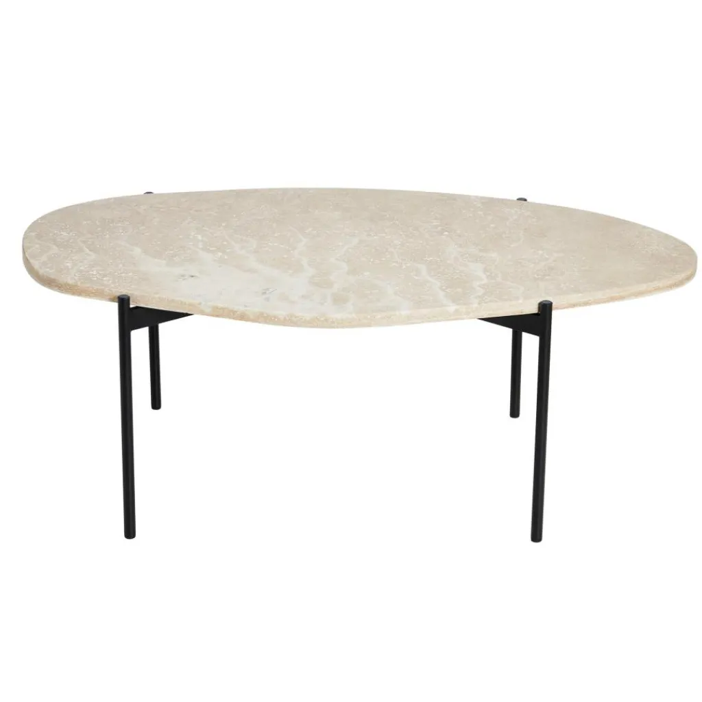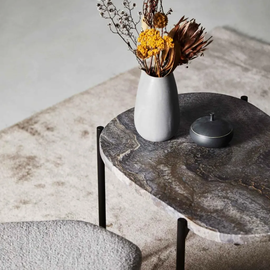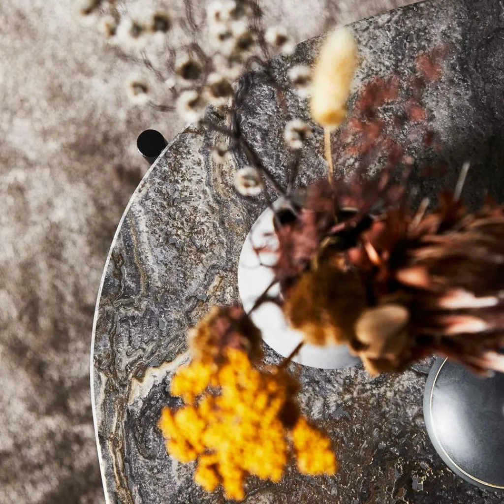 Was beim La Terra Beistelltisch L ins Auge sticht, ist die außergewöhnliche Platte aus Travertin. Der Stein wirkt schwer und robust und hat gleichzeitig eine von der Natur gezeichnete Oberfläche. Auch die Form der Tischplatte ist natürlich und unregelmäßig. Im Kontrast dazu steht das Metallgestell, das mit seinen geradlinigen Formen Stabilität ausdrückt, jedoch aufgrund der schlanken, runden Beine auch einen leichten Charakter ausstrahlt. Dies macht den La Terra Beistelltisch L so vielseitig. Denn er fügt sich als einzelner Couchtisch oder im Ensemble mit weiteren La-Terra-Tischchen nicht nur perfekt in die Sofalandschaft daheim ein, sondern passt auch in den modernen Wartebereich einer Praxis oder die Lobby im Hotel.