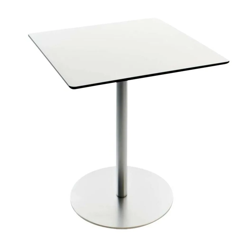 Beim soliden Brio Fix 72 Tisch von la palma handelt es sich um einen feststehenden Bistrotisch, dessen Tischfuß und Sockel aus matt verchromten Edelstahl gefertigt sind. Die quadratische Tischplatte ist wahlweise in Laminat, Holz-Furnier, Edelstahl, Glas und wetterfestem HPL erhältlich, siehe „Produktvarianten“.