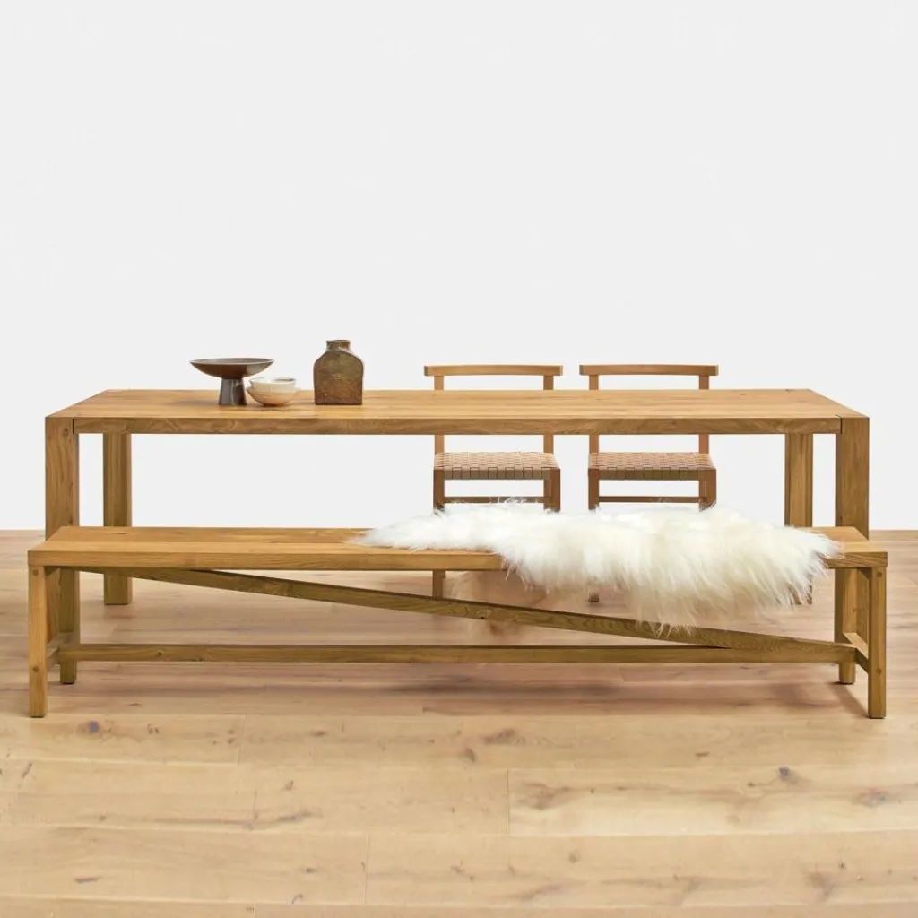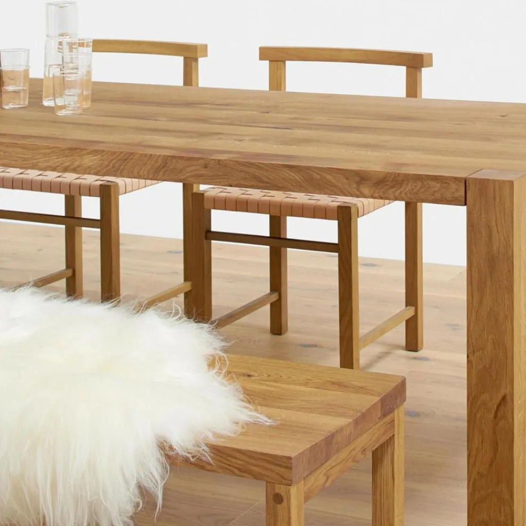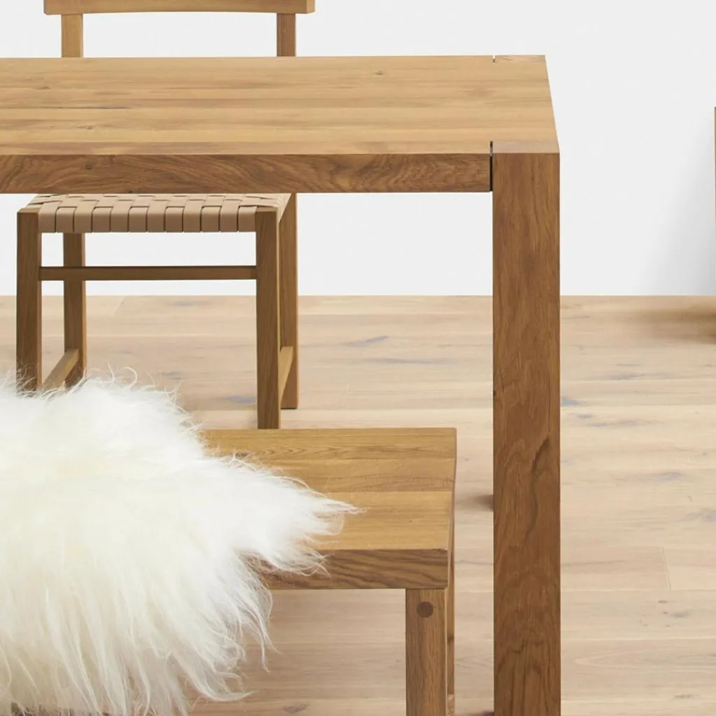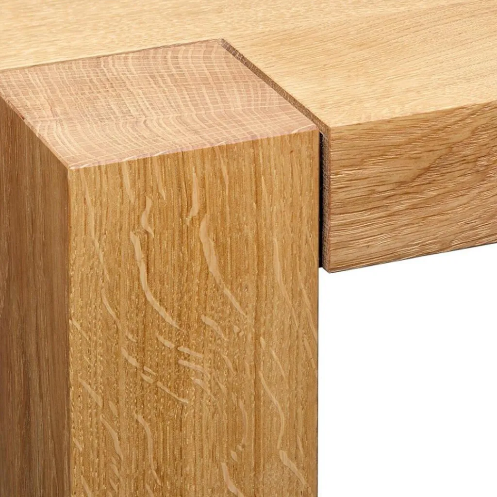 Der e15 TA22 Holborn Holzesstisch ist aus geölter europäischer Eiche gefertigt und mit seiner Länge von 230 cm und der Breite von 92 cm großzügig bemessen. An diesem Esstisch kann eine große Familie gemütlich bei den Mahlzeiten zusammensitzen. Und wenn Freunde kommen, ist hier noch ein Platz frei. Die 50 Millimeter starke Tischplatte bringt Kraft mit, kann viel edles Geschirr, originelle Dekoration und nebenbei auch den Sonntagsbraten tragen.