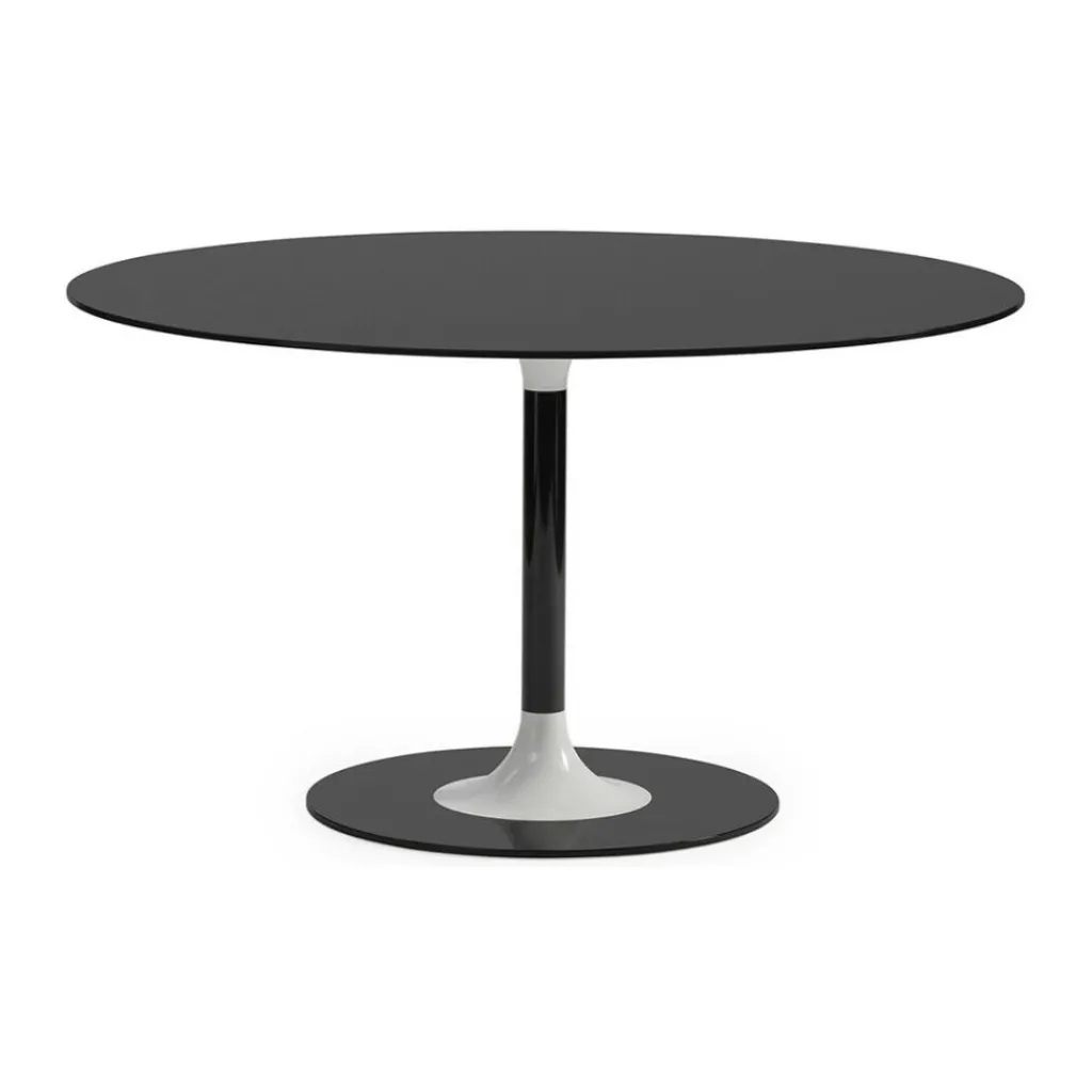 Runde und abgerundete Formen finden sich im Design des kompletten Esstisches wieder. Die kreisrunde Form der sehr flachen Tischplatte wird im ebenso kreisrunden Standfuß in kleinerer Gestalt wieder aufgegriffen. Das Tischbein in filigraner Säulenform geht in schwungvoll konisch zulaufender Form in die Tischplatte beziehungsweise den Standfuß über. Das Gestell mit Tischbein und Standfuß besteht komplett aus lackiertem Stahl. Die Tischplatte im eleganten Look, gearbeitet aus hinterlackiertem und gehärtetem Kristallglas, misst im Durchmesser 130cm. Sechs Personen finden am Tisch bequem Platz. Für große Familien oder alle, deren Gäste gerne spontan zum Essen bleiben, ist der Tisch im Essbereich der gesellige Mittelpunkt. Die Höhe des Esstisches misst 72cm und das Gewicht beträgt solide 115kg. Der Tisch ist in verschiedenen Farbkombinationen erhältlich.