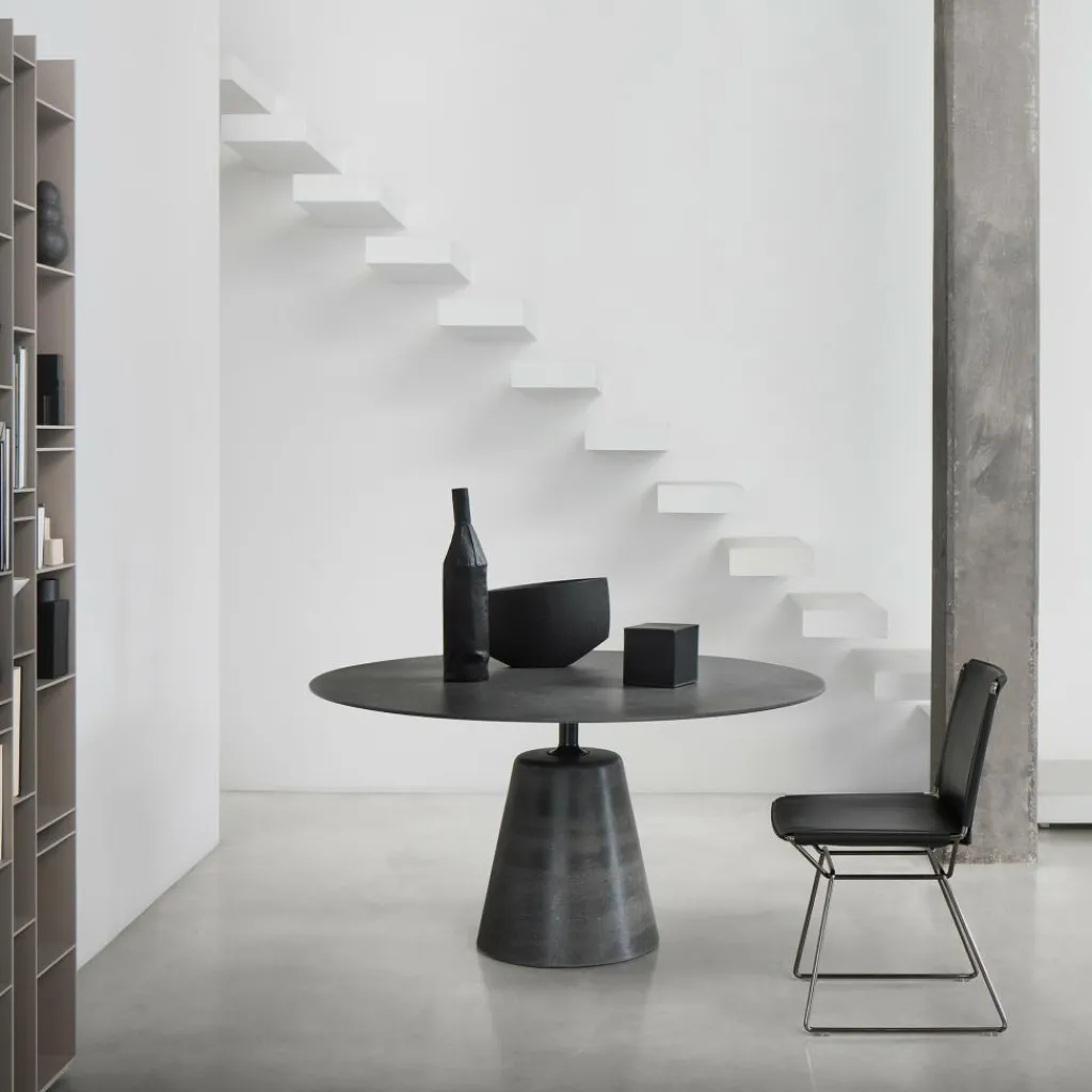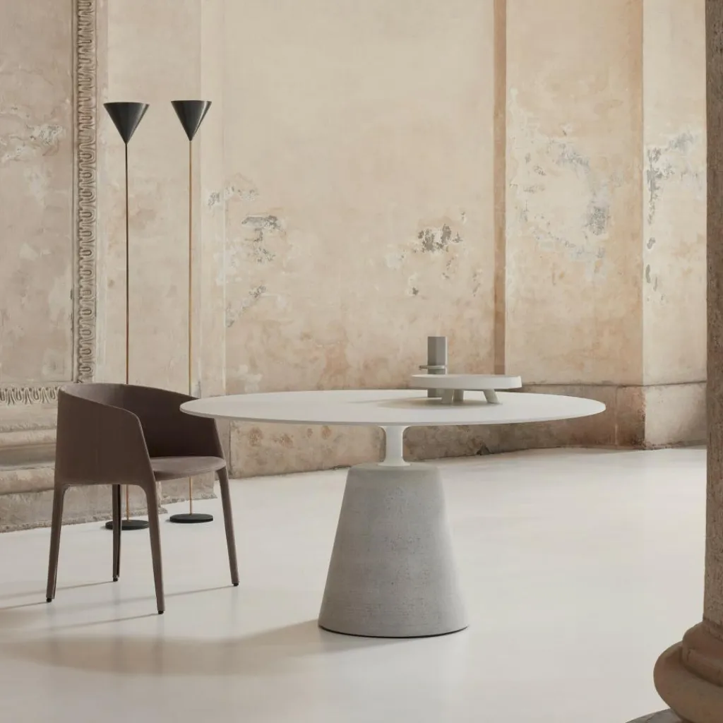 Der Rock Esstisch Ø 140cm MDF wurde von Jean Marie Massaud für die Marke MDF Italia entworfen. Der französische Designer kreierte einen Esstisch in skulpturaler Formensprache, bei dem der massive Werkstoff Zement namensgebend für den Rock Table, den Felsentisch, ist.