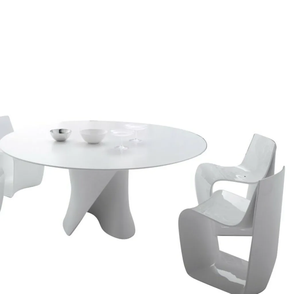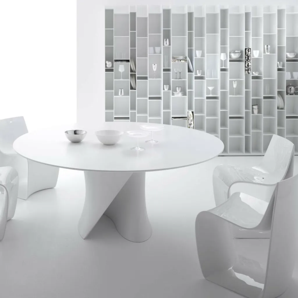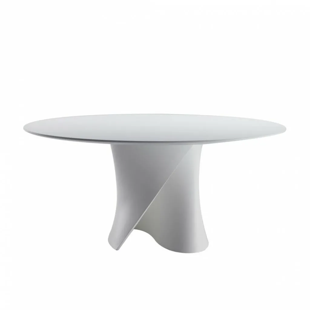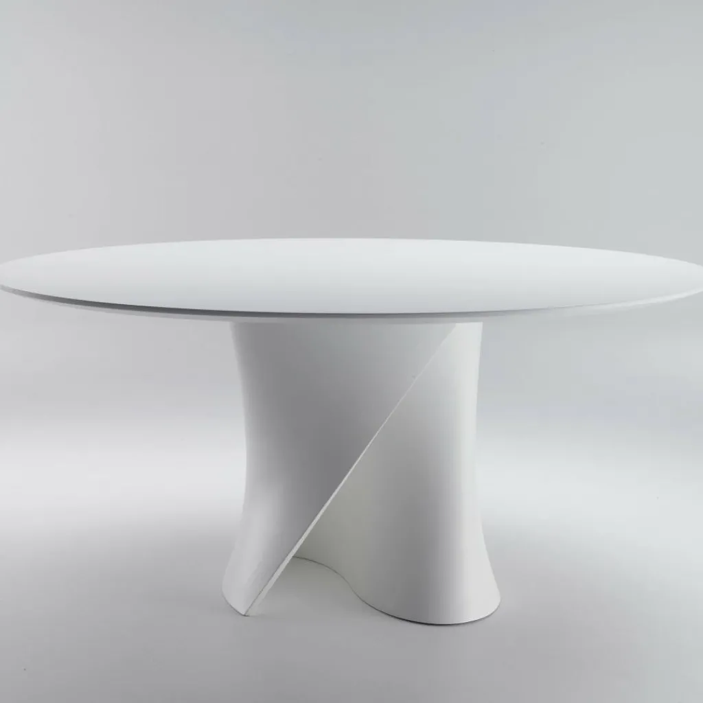 Dieser runde Tisch S Table Esstisch besitzt eine eigenwillig geschwungene S-förmige Basis aus durchgängig pigmentiertem Mineralpolyesterverbund und eine Tischplatte, die wahlweise aus 15mm starkem, transparentem, gehärtetem Glas oder aus 30mm starker MD-Holzfaserplatte besteht. Letzterer S Table Esstisch / S Table Tisch mit Holzplatte wird in weißlackiertem und kratzfestem Finish geliefert, siehe unsere MDF Italia S-Table „Produktvarianten“.