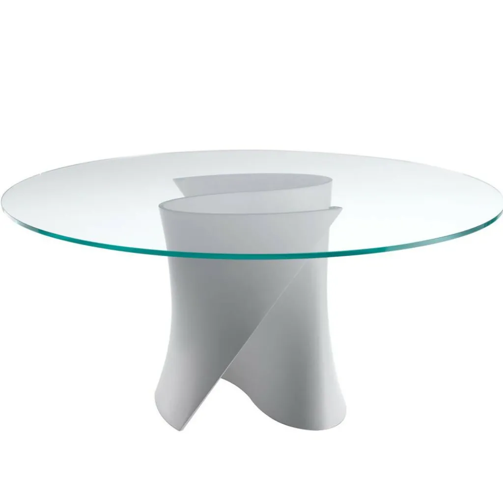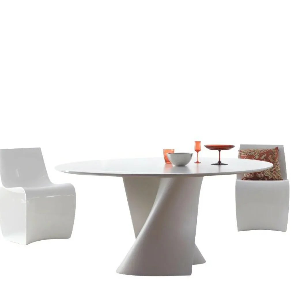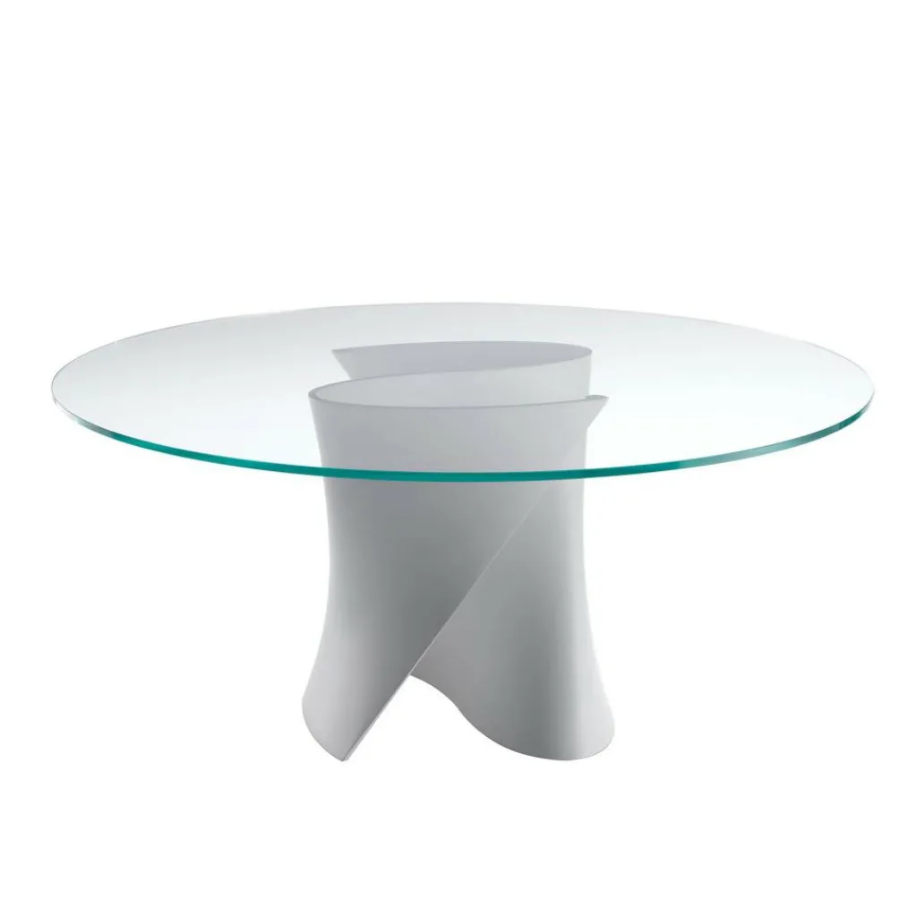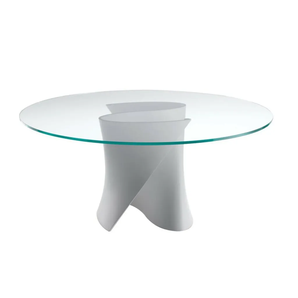 Dieser runde Tisch S Table Esstisch besitzt eine eigenwillig geschwungene S-förmige Basis aus durchgängig pigmentiertem Mineralpolyesterverbund und eine Tischplatte, die wahlweise aus 15mm starkem, transparentem, gehärtetem Glas oder aus 30mm starker MD-Holzfaserplatte besteht. Letzterer S Table Esstisch / S Table Tisch mit Holzplatte wird in weißlackiertem und kratzfestem Finish geliefert, siehe unsere MDF Italia S-Table „Produktvarianten“.