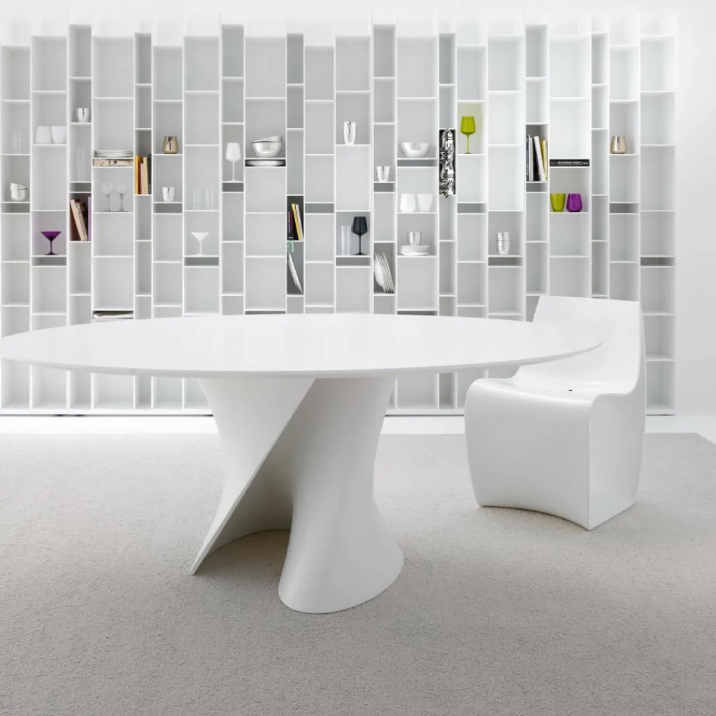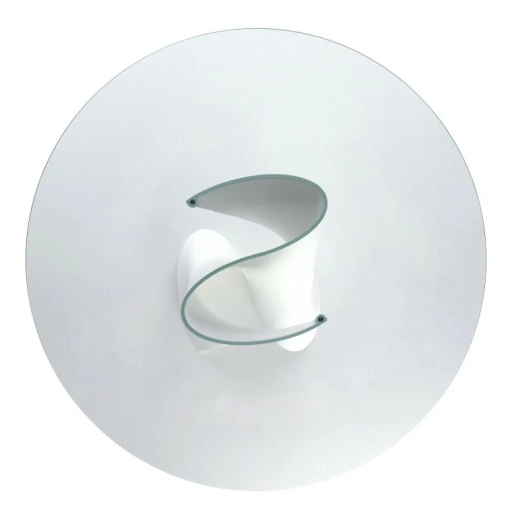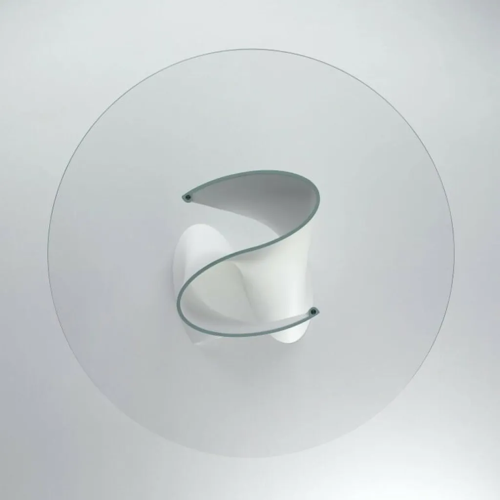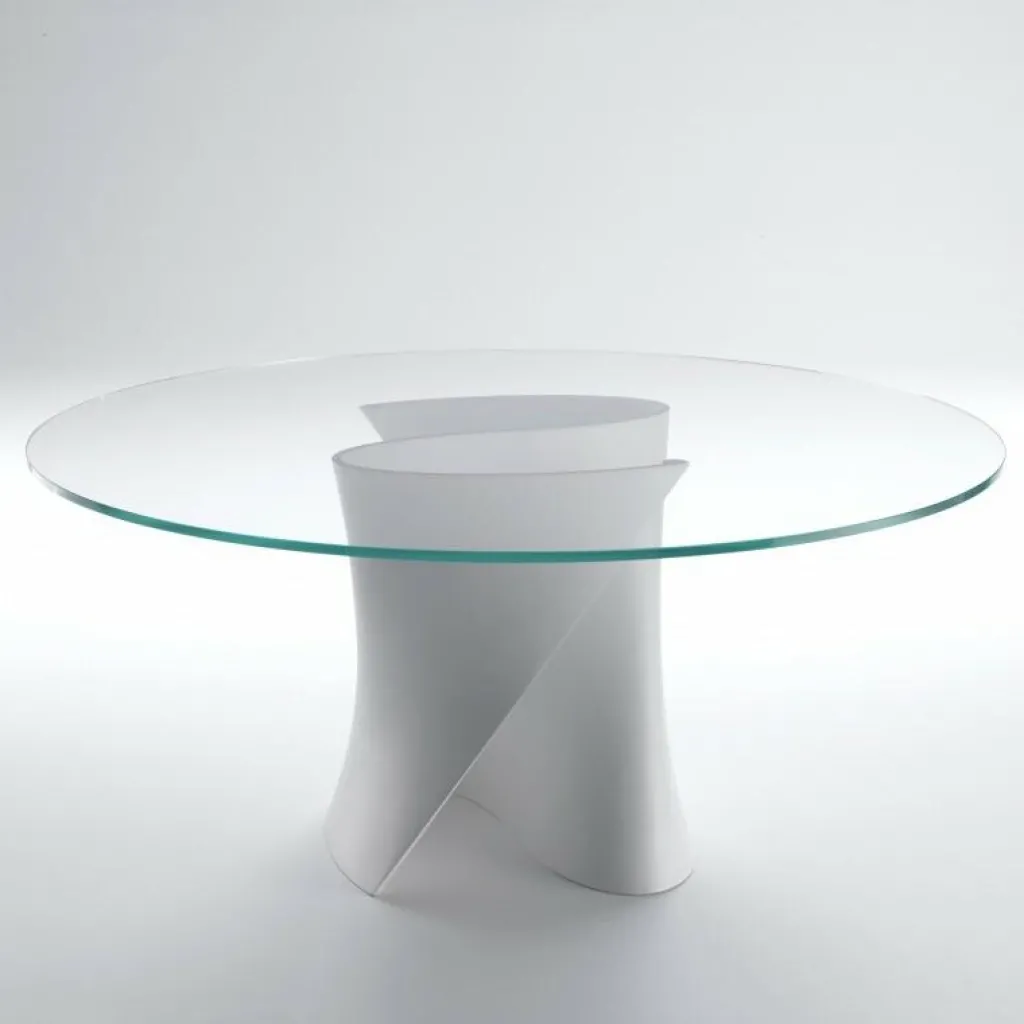 Dieser runde Tisch S Table Esstisch besitzt eine eigenwillig geschwungene S-förmige Basis aus durchgängig pigmentiertem Mineralpolyesterverbund und eine Tischplatte, die wahlweise aus 15mm starkem, transparentem, gehärtetem Glas oder aus 30mm starker MD-Holzfaserplatte besteht. Letzterer S Table Esstisch / S Table Tisch mit Holzplatte wird in weißlackiertem und kratzfestem Finish geliefert, siehe unsere MDF Italia S-Table „Produktvarianten“.