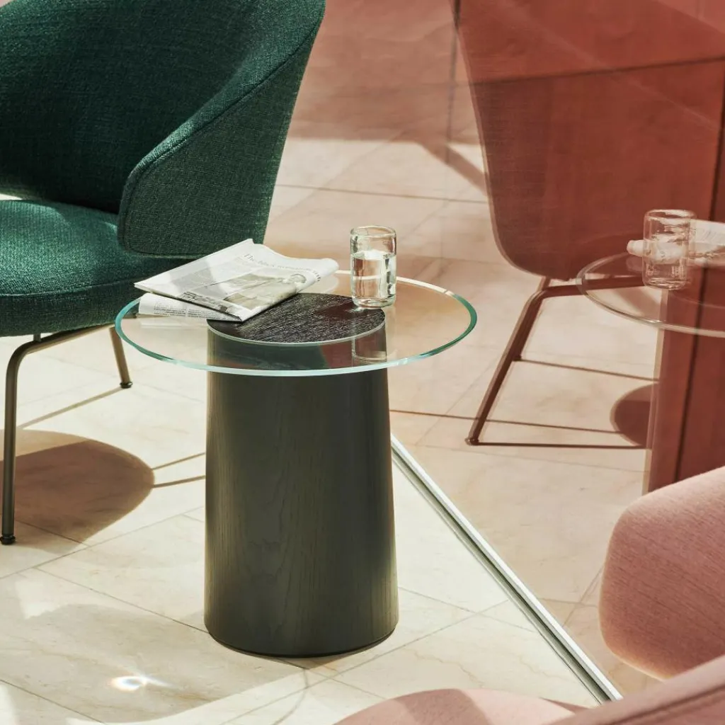 Bewusst entscheidet sich Schelde für einen Mix aus traditionellen Materialien und reduziert das Design dabei auf ein Minimum: Der solide Tischfuß besteht aus einem Kern aus Eschenholz. Darüber ist eine Schicht Furnier angebracht, das in verschiedenen Farben erhältlich ist. Zum Blickfang wird der Tisch, weil die durchsichtige Platte scheinbar auf dem Holzstumpf zu schweben scheint. Sie ist ohne sichtbare Halterungen montiert. Die runde Tischplatte besteht aus eisenarmem Floatglas und wird ohne den Einsatz von Kleber auf dem Gestell befestigt. Der Stub Beistelltisch Esche ist sehr pflegeleicht: Die Glasplatte kann mit einem trockenen Tuch oder bei stärkerer Verschmutzung mit einem Glasreiniger geputzt werden. Auch der Sockel lässt sich gut mit einem feuchten Tuch reinigen.