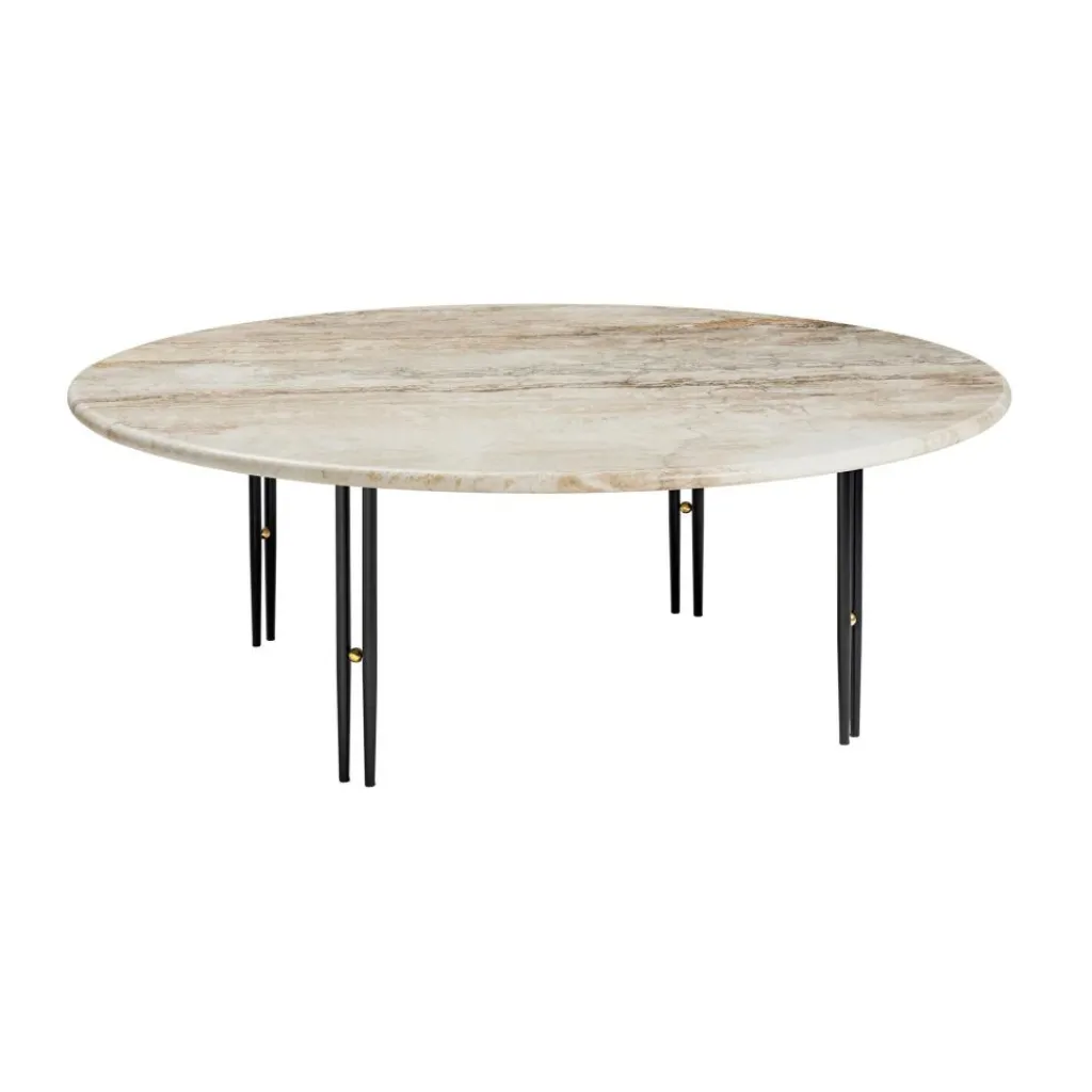 Der IOI Couchtisch Ø100cm wurde von GamFratesi für die Marke Gubi entworfen. Zeitlose italienische Eleganz und Materialität kennzeichnen das Modell. Seinen Namen verdankt es der Beschaffenheit seiner Tischbeine, die aus zwei Metallrohren und einer Messingkugel bestehen und sich zur Buchstabenreihe I-O-I verbinden.