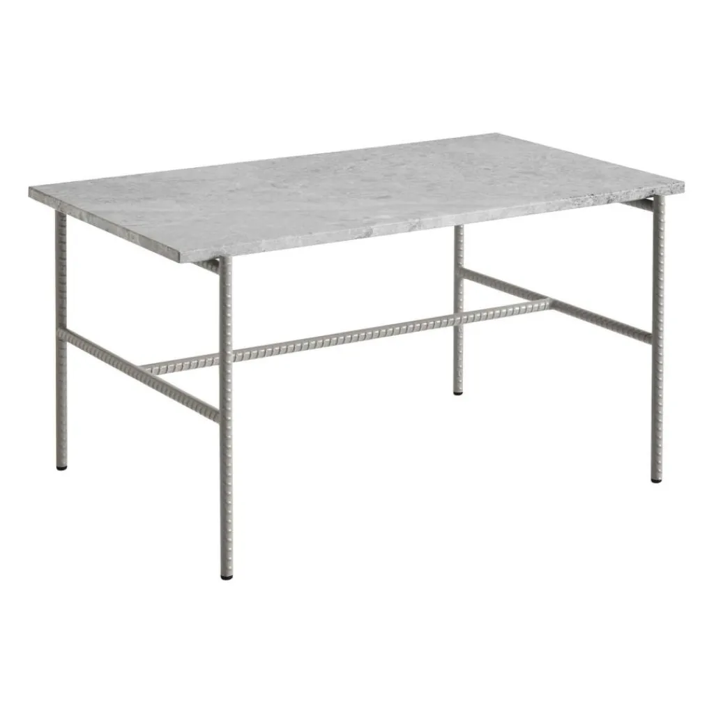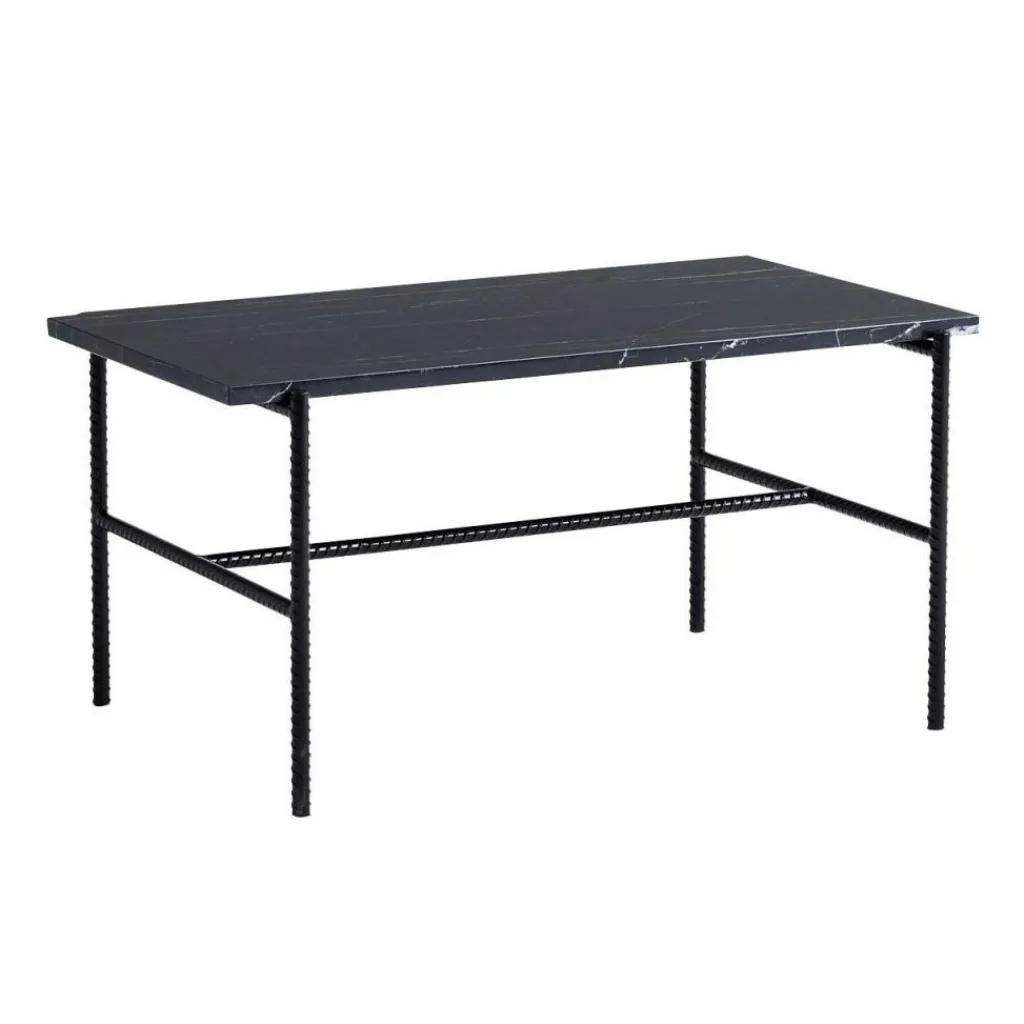 Der Rebar Couchtisch 80x49cm fällt mit seinem Gestell auf: Die Beine und Seitenstreben aus pulverbeschichtetem Stahl sind nämlich aus Bewehrungsstahl gefertigt. Durch Walzen erhält er die charakteristischen Rippen, die einen dreidimensionalen Charakter erzeugen. An den Breitseiten ragt die Tischplatte über die Basis hinaus. Die Tischplatte des Rebar Couchtisches 80x49cm besteht aus Marmor. Der Werkstoff wird schon seit Jahrtausenden eingesetzt und wegen der Langlebigkeit und des stilvollen Aussehens geschätzt. In der Oberfläche sind zarte Muster zu erkennen, die jeden Tisch einzigartig machen. Die Tischplatte hat eine Stärke von 1,8 cm. Man kann den Rebar Couchtisch 80x49cm in verschiedenen Farben bestellen. An der Unterseite der vier geraden Beine sind Silikongleiter montiert. Sie dienen zur Schonung empfindlicher Böden.